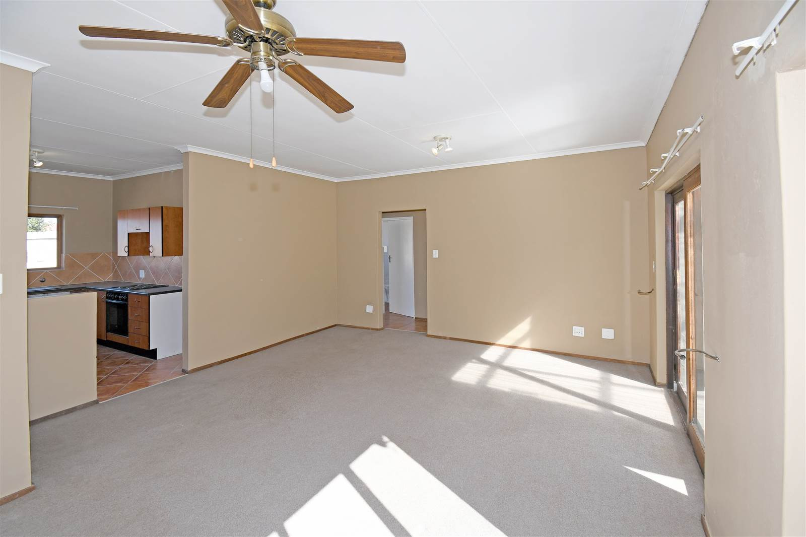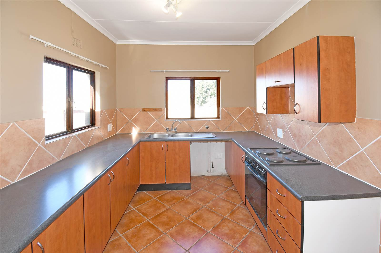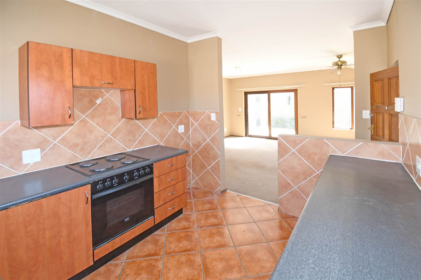 Paved front entrance, open-plan living area, large covered patio and established garden. Kitchen has ample cupboard space, electric hob / oven plus space for 1 water appliance and standard fridge. Passage to 2 bedrooms. Main with full en-suite bathroom. Family bathroom with bath. Carpeted throughout.