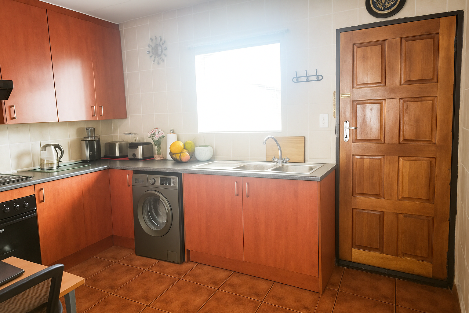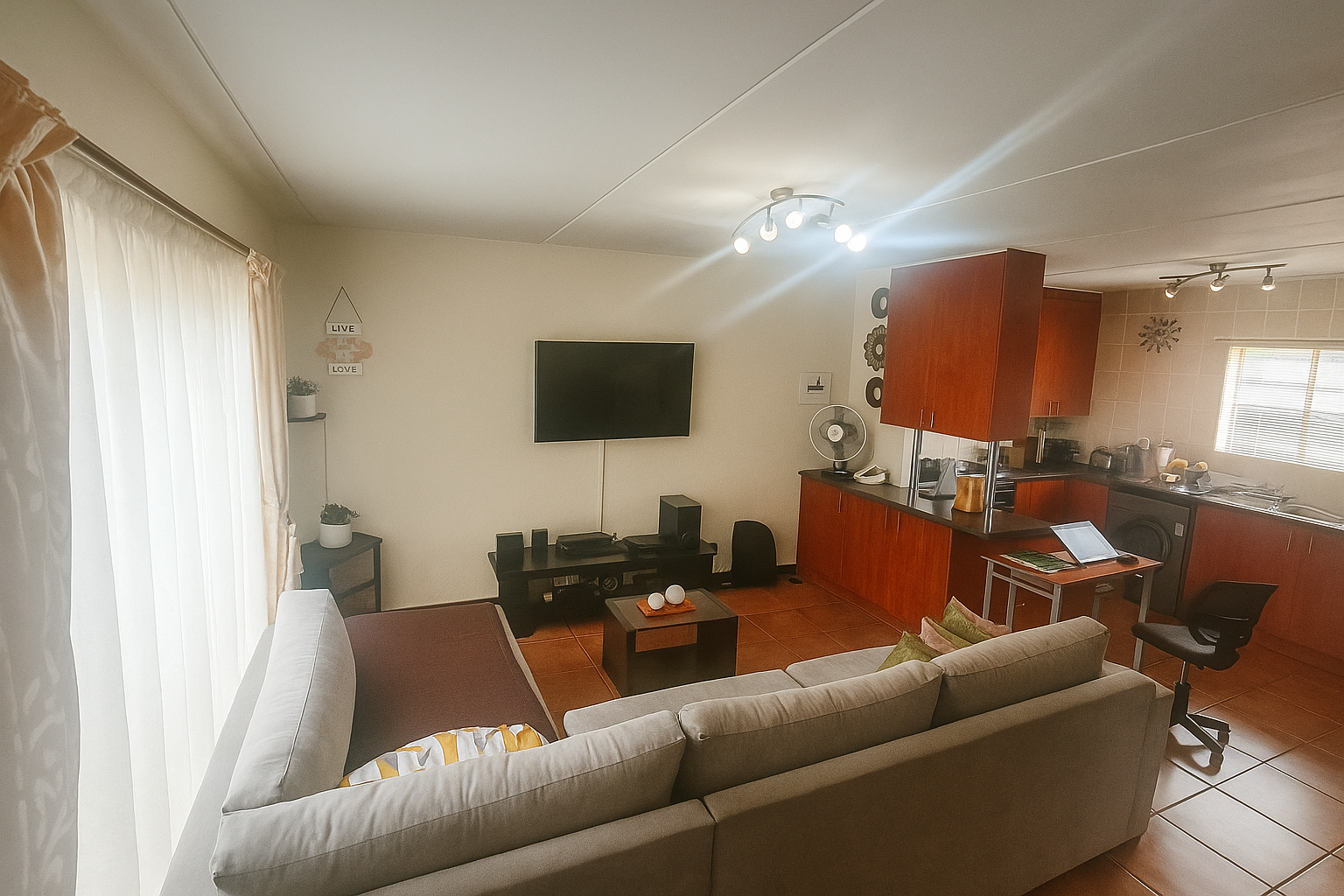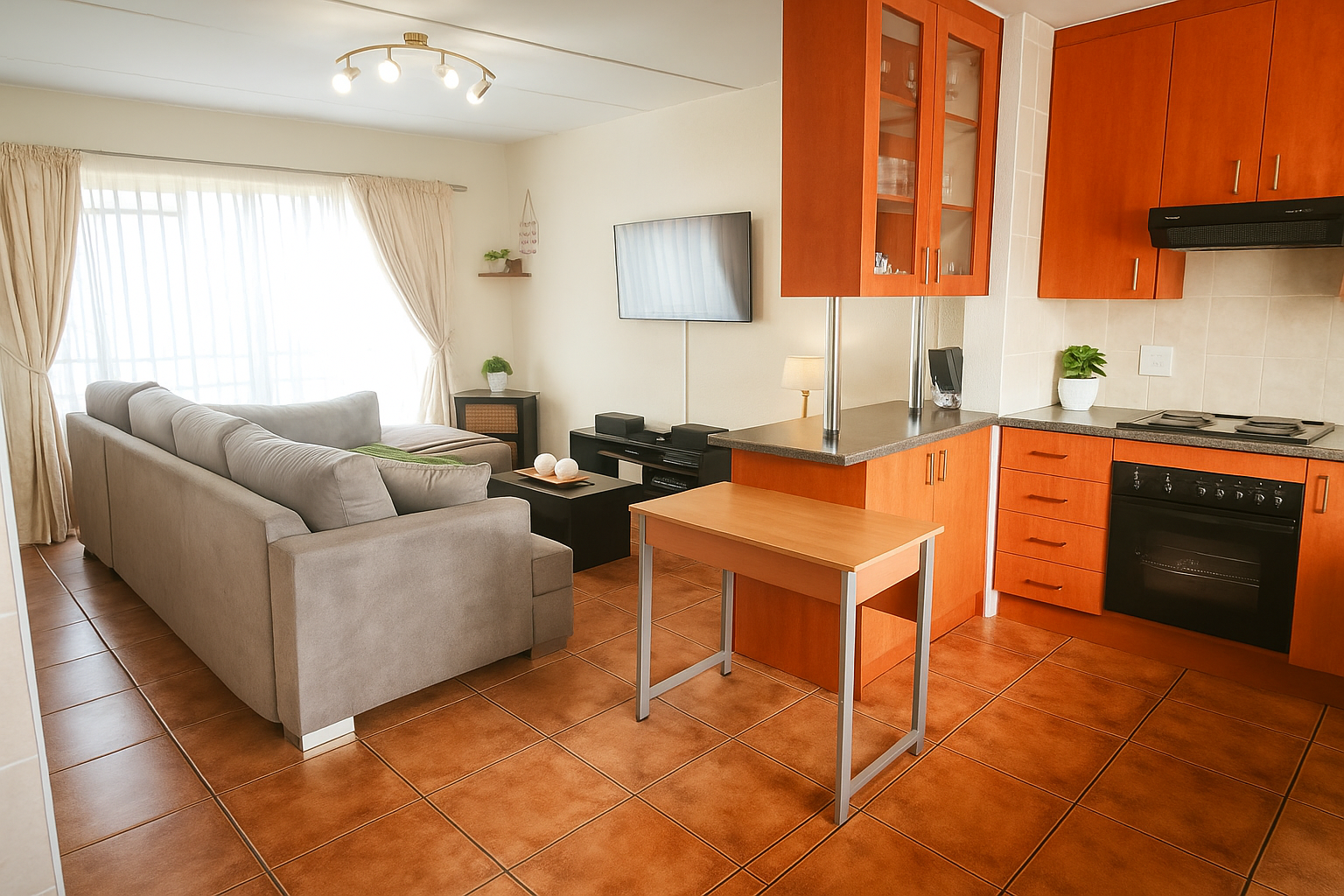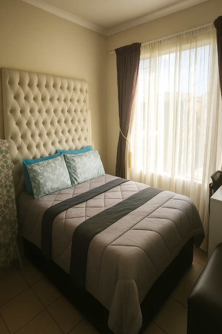 This modern 2-bedroom, 1-bathroom rental unit offers comfortable and secure living in the desirable suburban area of Florida Glen, Roodepoort. Spanning 70 square meters, the interior boasts an inviting open-plan layout, seamlessly connecting the living area with a contemporary kitchen. The kitchen is a highlight, featuring warm-toned cabinetry, dark countertops, a built-in oven and hob, a double stainless steel sink, and an integrated washing machine. Ample storage and a dedicated desk/workspace area enhance functionality, while large windows ensure abundant natural light throughout the space. The living area is spacious, accommodating an L-shaped sofa and a wall-mounted television, all set on easy-to-maintain tiled flooring. Both bedrooms are bright and well-appointed, each benefiting from generous natural light and practical tiled floors. They include extensive built-in wardrobes, providing excellent storage solutions. The bathroom is neatly tiled and equipped with both a bathtub and a separate walk-in shower, catering to all preferences. This pet-friendly unit is ideal for professionals or small families seeking a convenient lock-up-and-go lifestyle. The property is situated within a secure complex, offering peace of mind with 24-hour security, a security post, and an access gate. Residents will appreciate the convenience of two dedicated parking bays, with covered carports available within the complex. Fibre-ready connectivity ensures high-speed internet access, perfect for remote work or entertainment. The complex also features a well-maintained garden area. Key Features: * 2 Bedrooms, 1 Bathroom * Open-plan living and kitchen * Modern kitchen with built-in appliances * 2 Dedicated parking bays * Secure complex with 24-hour security * Fibre-ready connectivity * Pet-friendly * 70 sqm floor size