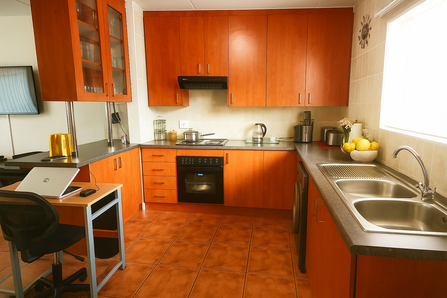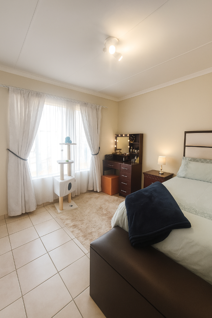 This modern 2-bedroom, 1-bathroom rental unit offers comfortable and secure living in the desirable suburban area of Florida Glen, Roodepoort. Spanning 70 square meters, the interior boasts an inviting open-plan layout, seamlessly connecting the living area with a contemporary kitchen. The kitchen is a highlight, featuring warm-toned cabinetry, dark countertops, a built-in oven and hob, a double stainless steel sink, and an integrated washing machine. Ample storage and a dedicated desk/workspace area enhance functionality, while large windows ensure abundant natural light throughout the space. The living area is spacious, accommodating an L-shaped sofa and a wall-mounted television, all set on easy-to-maintain tiled flooring. Both bedrooms are bright and well-appointed, each benefiting from generous natural light and practical tiled floors. They include extensive built-in wardrobes, providing excellent storage solutions. The bathroom is neatly tiled and equipped with both a bathtub and a separate walk-in shower, catering to all preferences. This pet-friendly unit is ideal for professionals or small families seeking a convenient lock-up-and-go lifestyle. The property is situated within a secure complex, offering peace of mind with 24-hour security, a security post, and an access gate. Residents will appreciate the convenience of two dedicated parking bays, with covered carports available within the complex. Fibre-ready connectivity ensures high-speed internet access, perfect for remote work or entertainment. The complex also features a well-maintained garden area. Key Features: * 2 Bedrooms, 1 Bathroom * Open-plan living and kitchen * Modern kitchen with built-in appliances * 2 Dedicated parking bays * Secure complex with 24-hour security * Fibre-ready connectivity * Pet-friendly * 70 sqm floor size