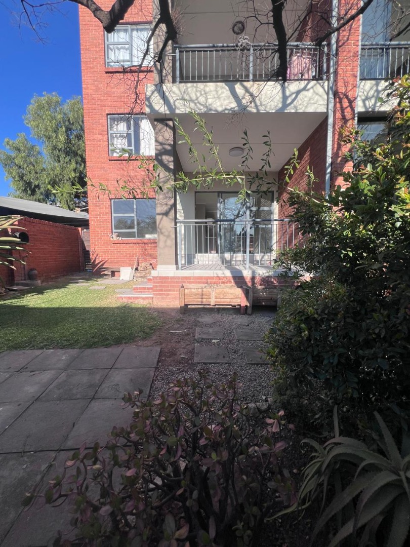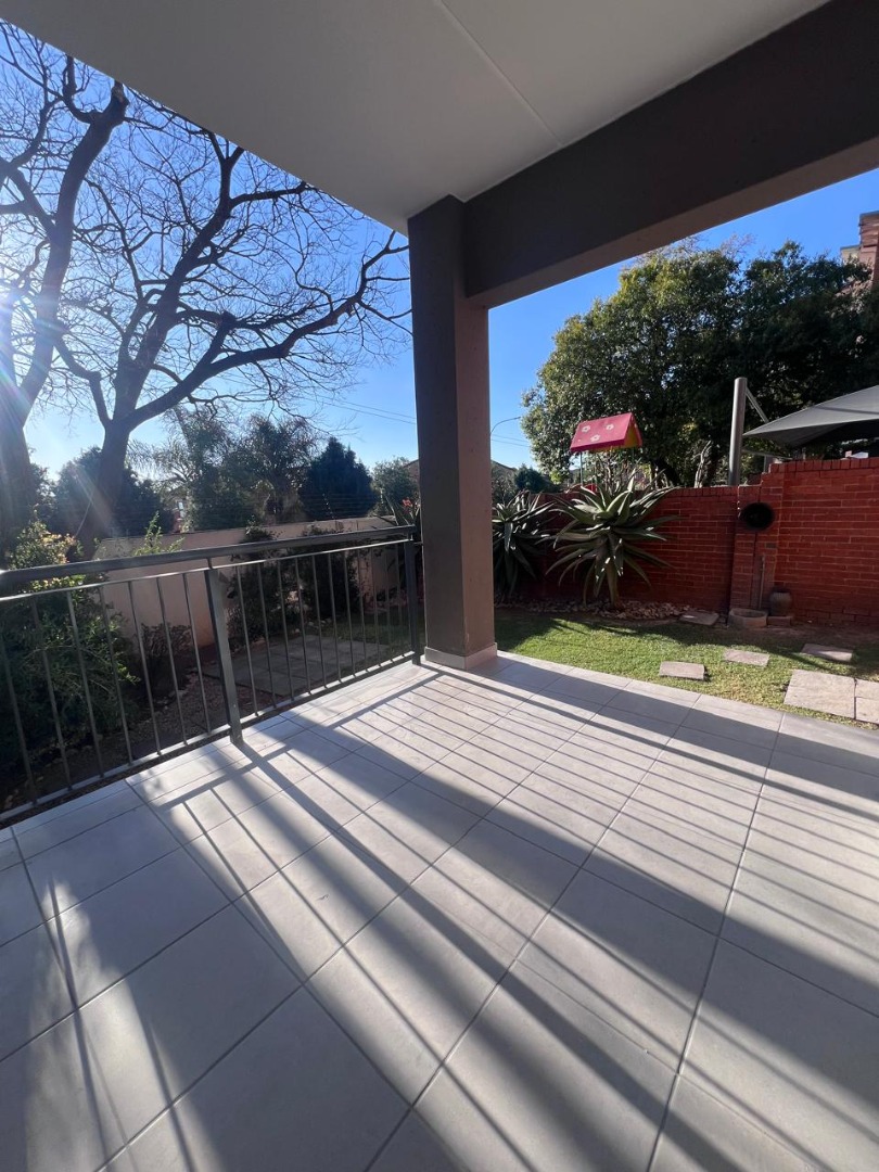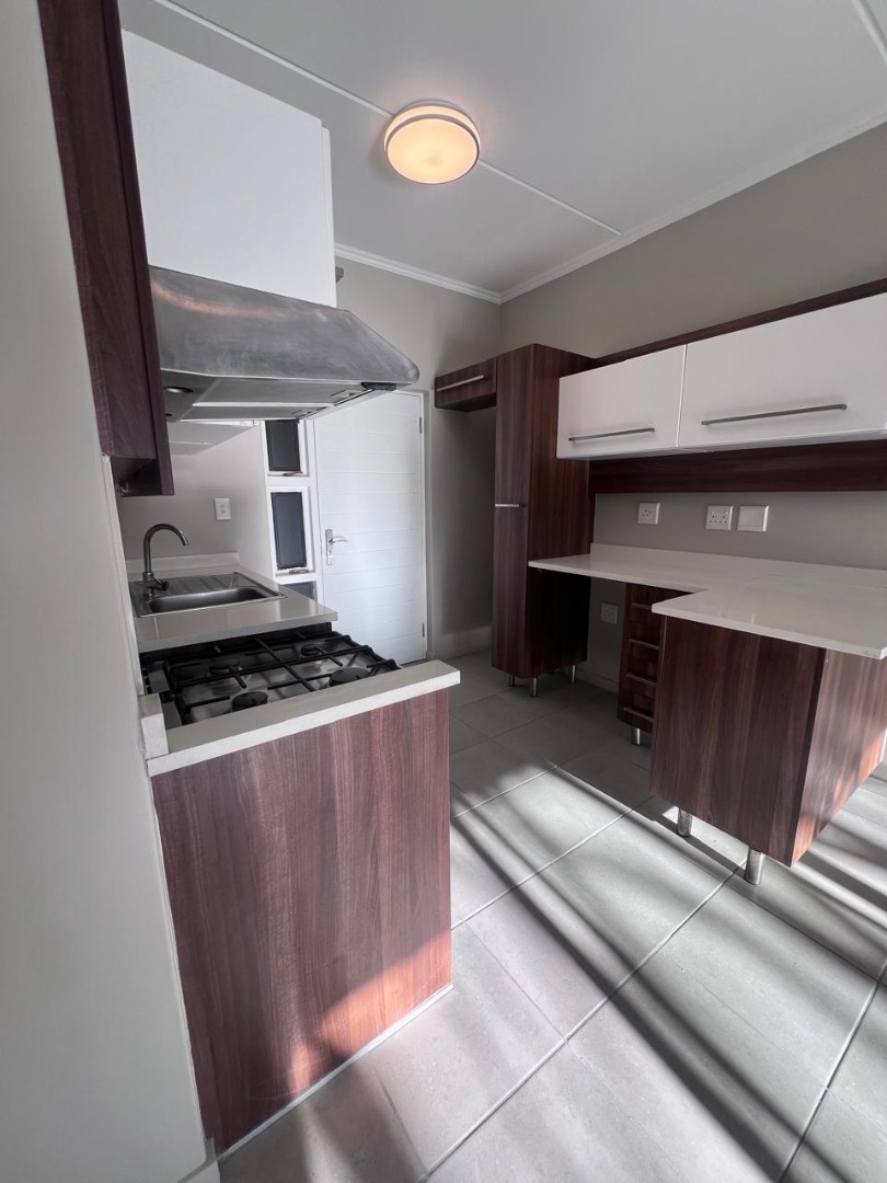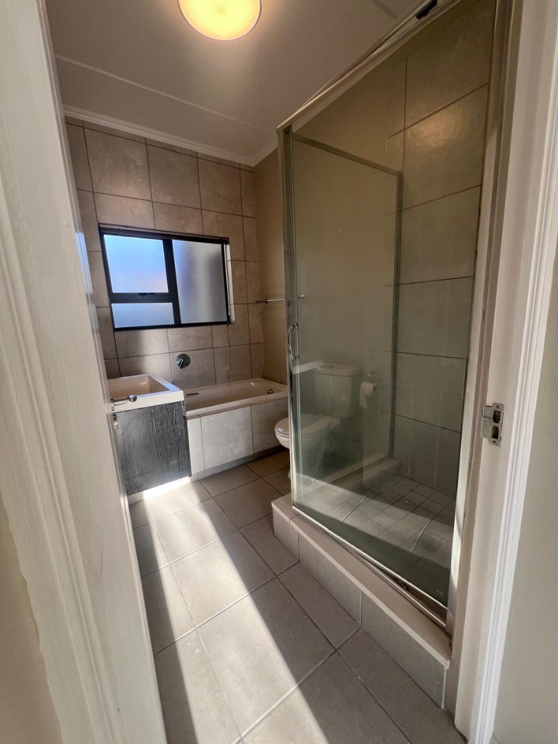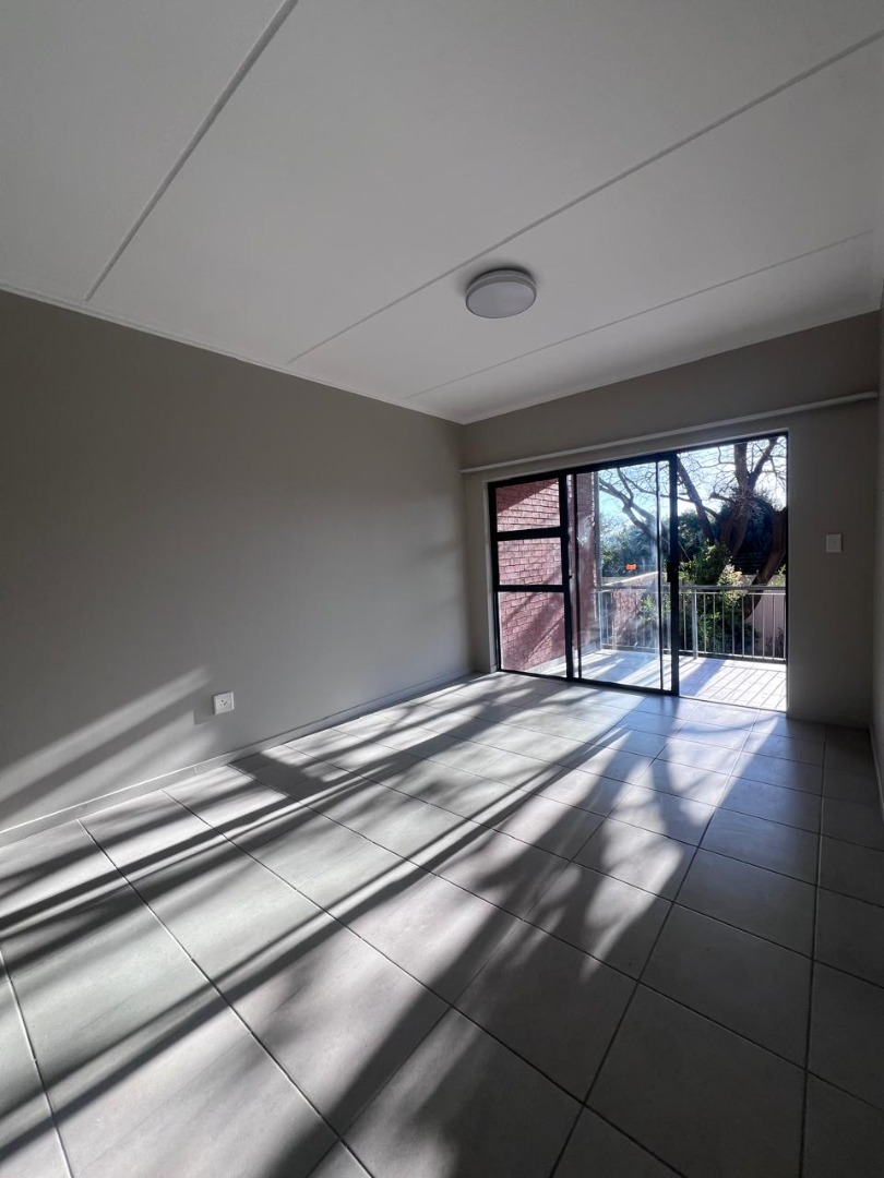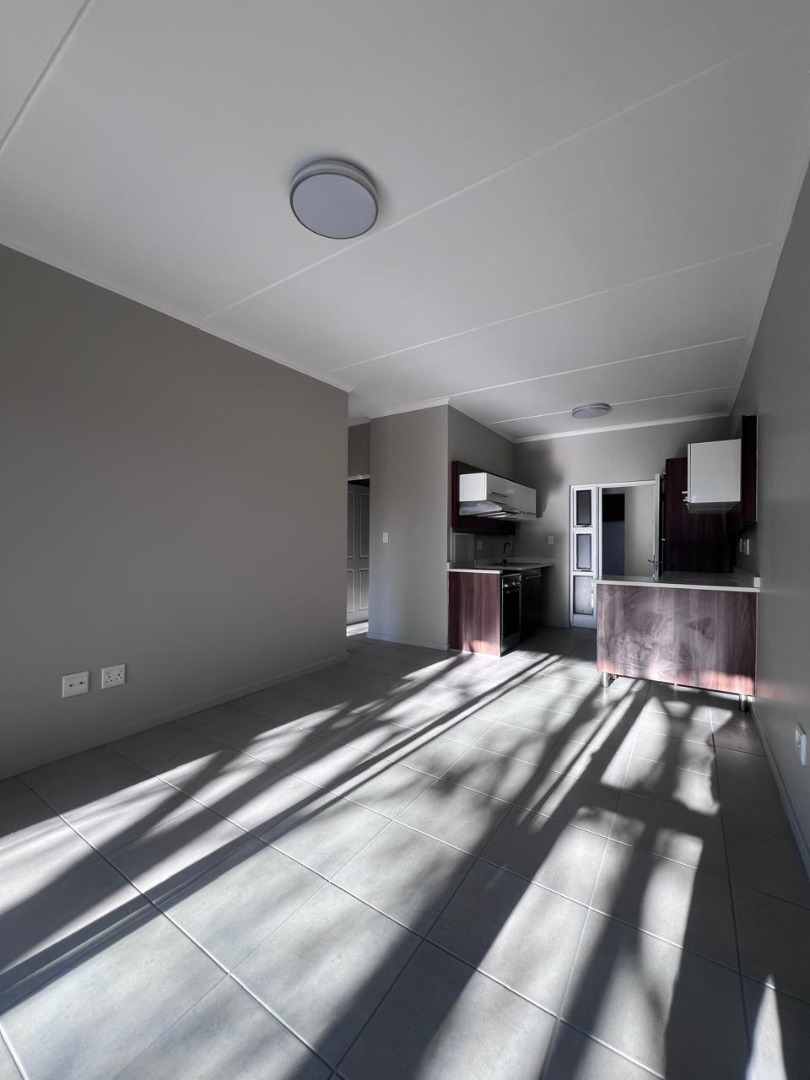 Discover this modern 2-bedroom, 1-bathroom apartment available for rent in the sought-after Radiokop suburb of Roodepoort. Spanning 62 square meters, this ground-floor unit offers a contemporary open-plan living experience. The inviting lounge seamlessly connects to a dedicated dining area, both featuring light grey tiled flooring and neutral grey walls, creating a bright and airy atmosphere. Large sliding doors enhance natural light and provide direct access to the outdoor spaces.