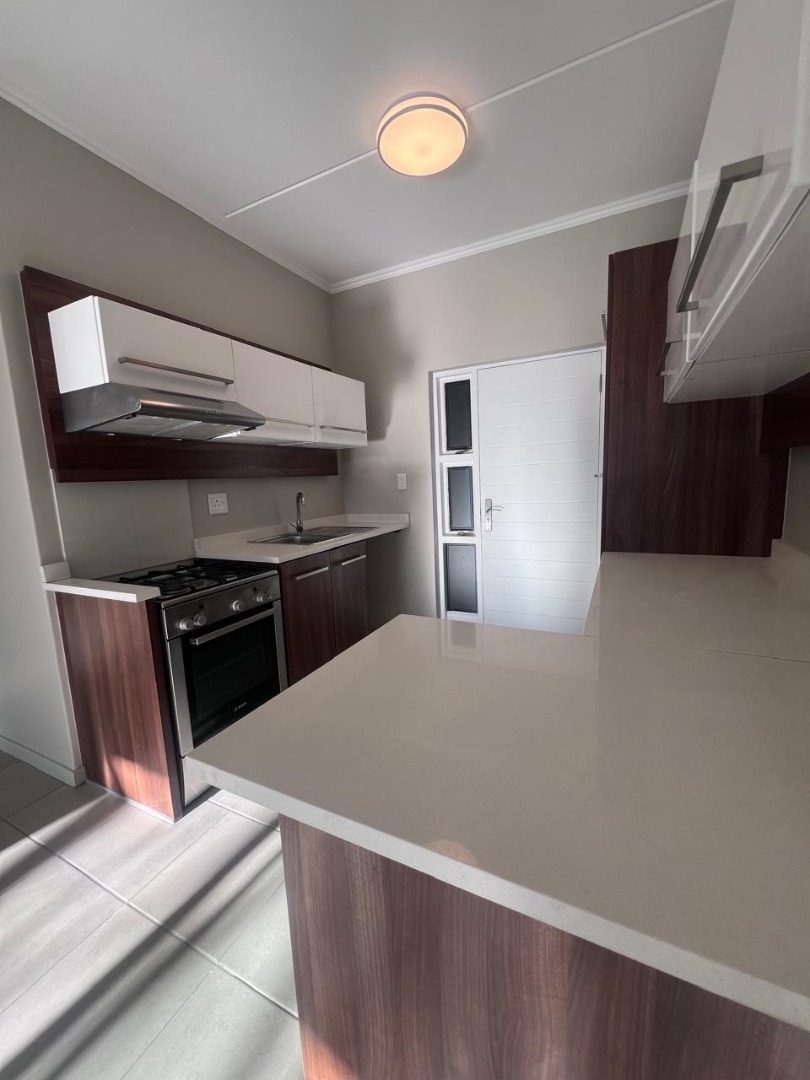 The well-appointed kitchen is a highlight, boasting stylish two-tone cabinetry (dark wood and white), light countertops, and a practical breakfast bar/island. It comes equipped with a gas hob and an integrated oven, perfect for culinary enthusiasts. The two comfortable bedrooms share a modern bathroom, designed for convenience and functionality. Throughout the apartment, the tiled flooring ensures easy maintenance and a clean aesthetic.