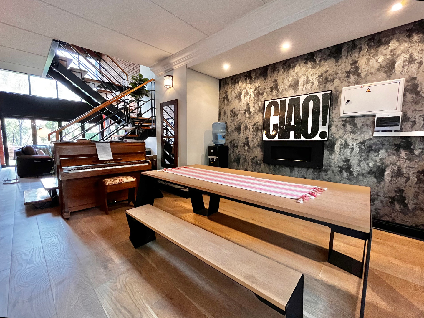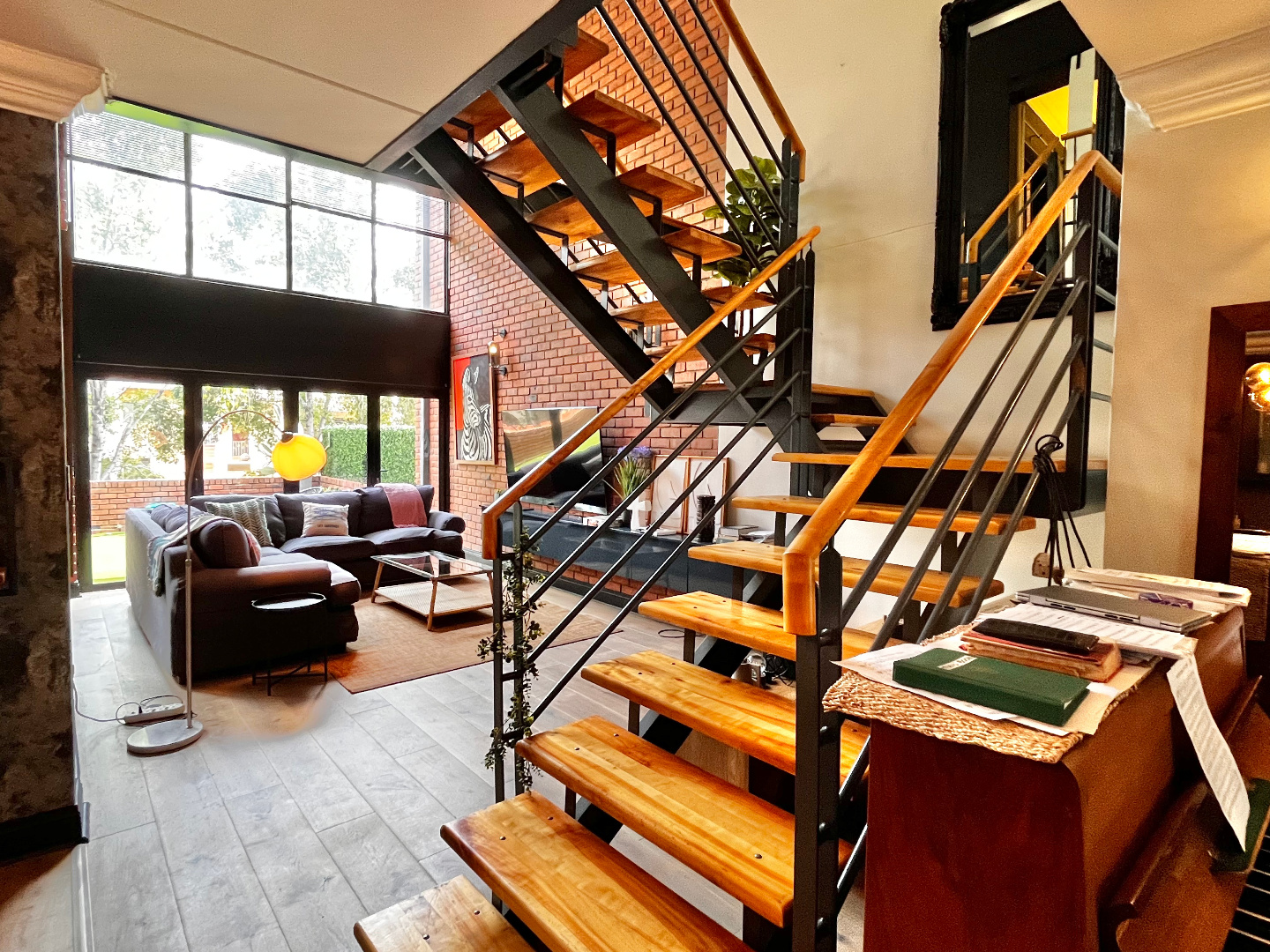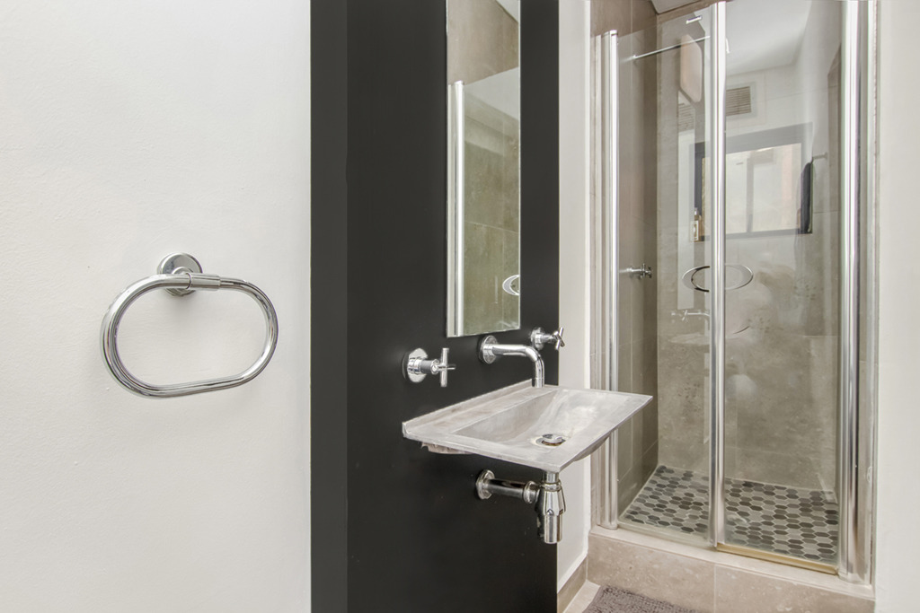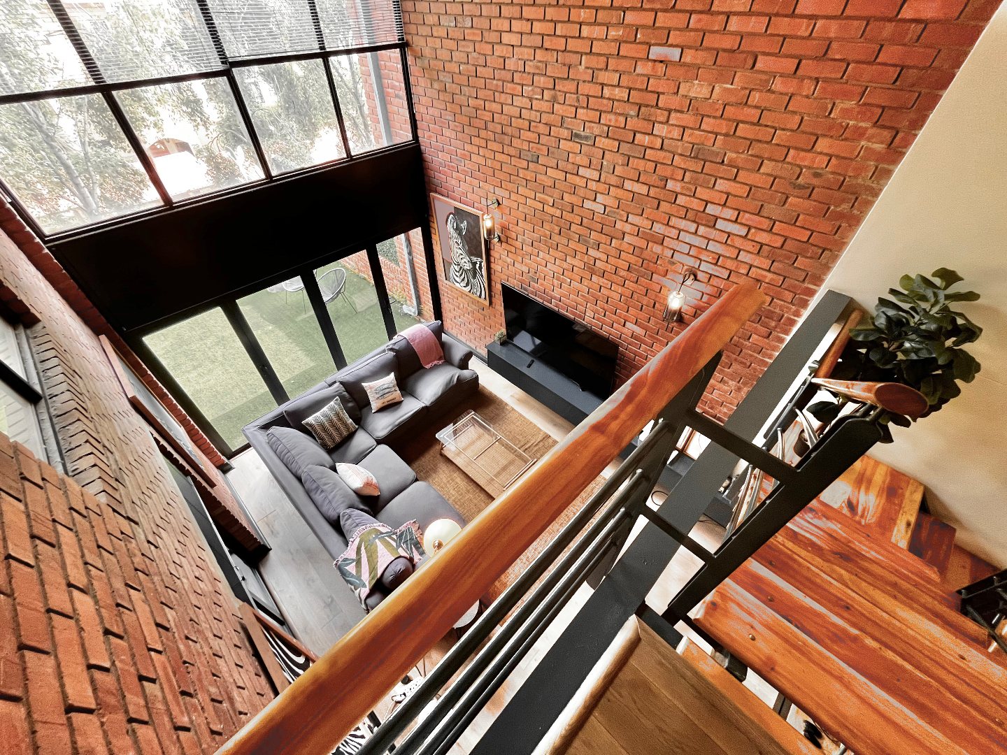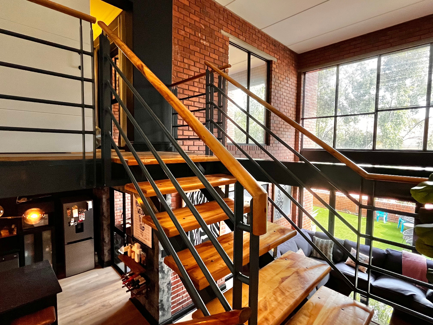 The apartment offers open plan living spaces on two levels. The open plan ground floor includes a dining area, kitchen and lounge, guest bathroom and a generous outdoor entertainment space. With its north-facing orientation, natural light streams through the double volume windows. Stacking doors open up onto the large, sunny private patio. There is a covered section that leads out of the kitchen, for al fresco dining and entertaining. The modern kitchen and bar area is fully fitted with space for 3 countertop appliances and ample room for a fridge, space for the dishwasher and washing machine to be tucked neatly under the countertops.