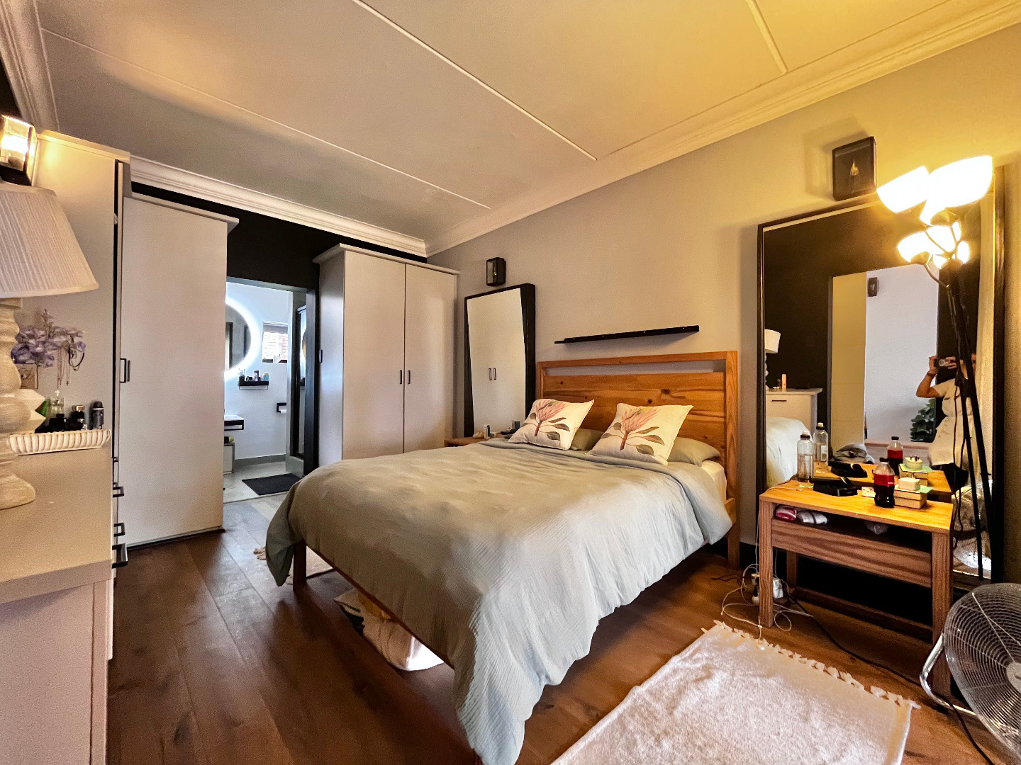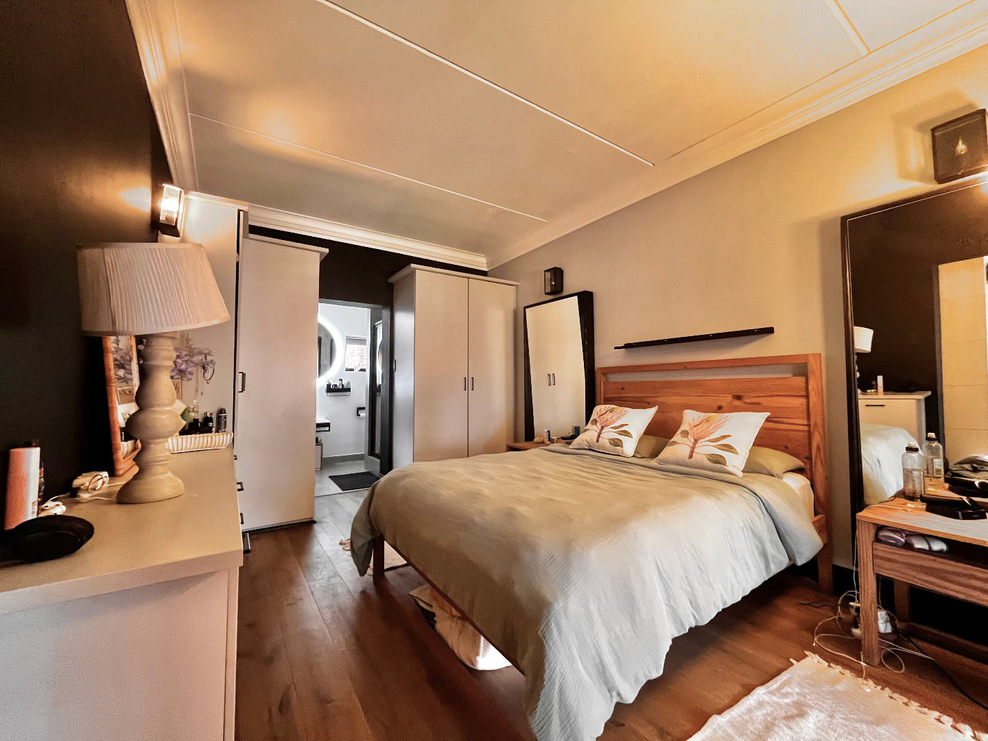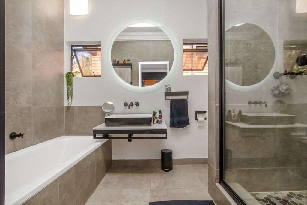 On the first floor, both bedrooms have en-suite bathrooms. The main bedroom opens out onto a private balcony, overlooking the downstairs patio and a row of beautiful poplar trees.