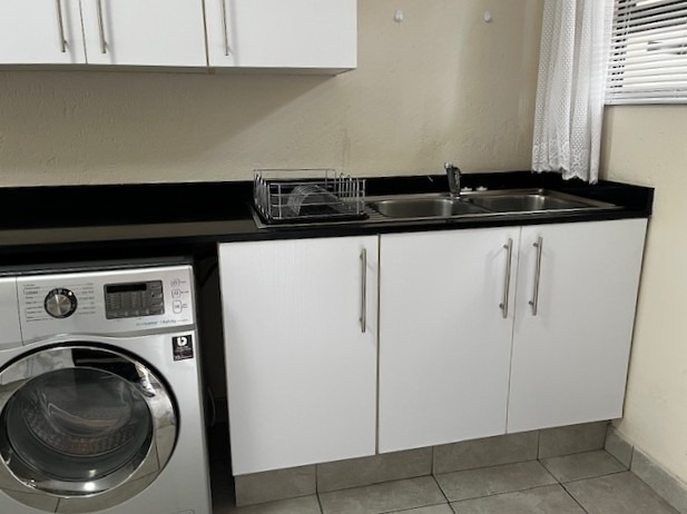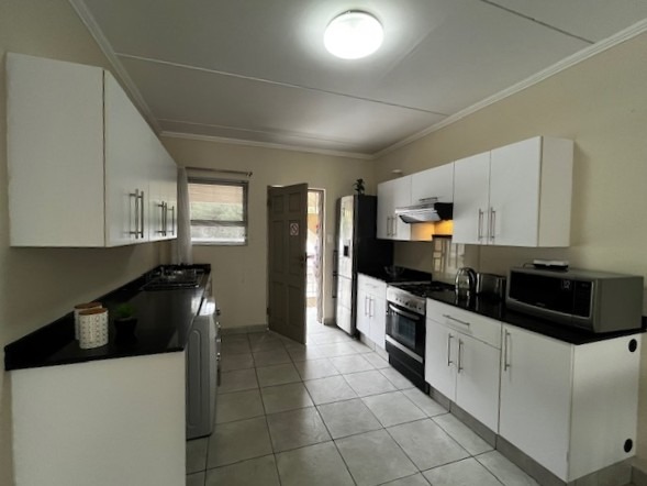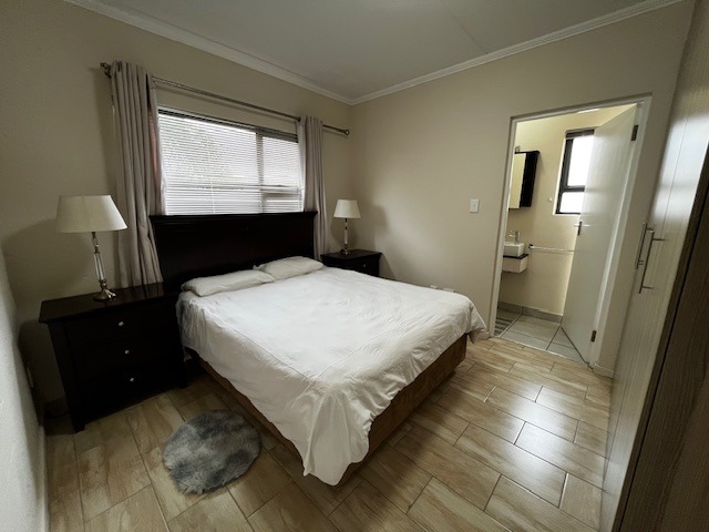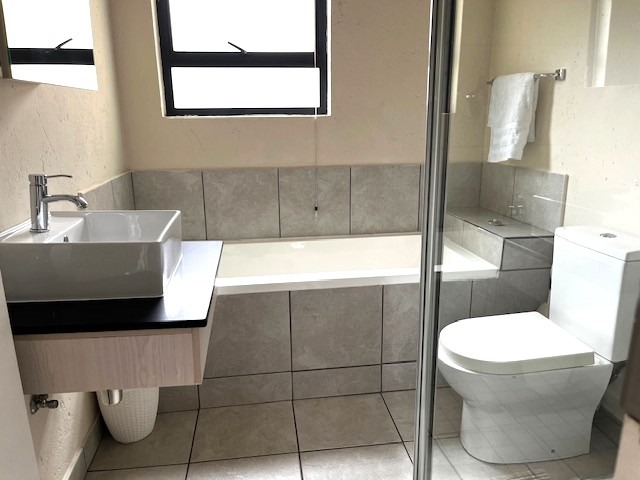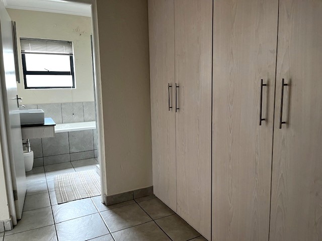 All three bedrooms are spacious, featuring tiled flooring and ample built-in cupboard space. The main bedroom includes an en-suite bathroom with a shower, basin, and toilet, while the two additional bedrooms share a modern bathroom fitted with a bath, shower, basin, and toilet. Additionally, there are ample built-in cupboards in the passageway leading to the bedrooms, providing extra