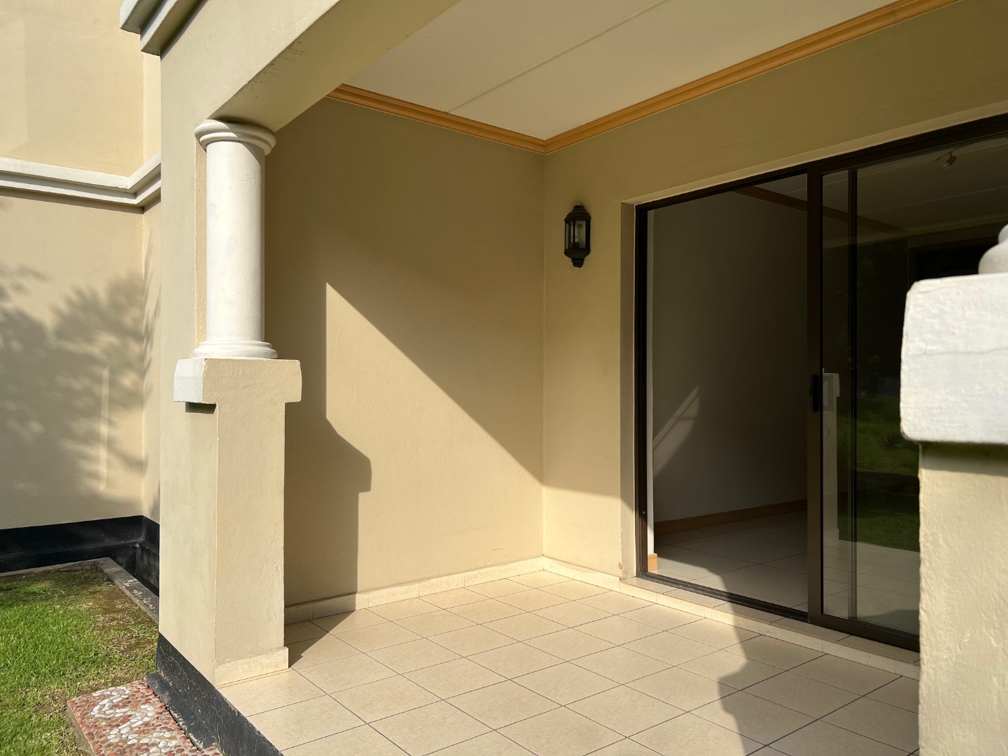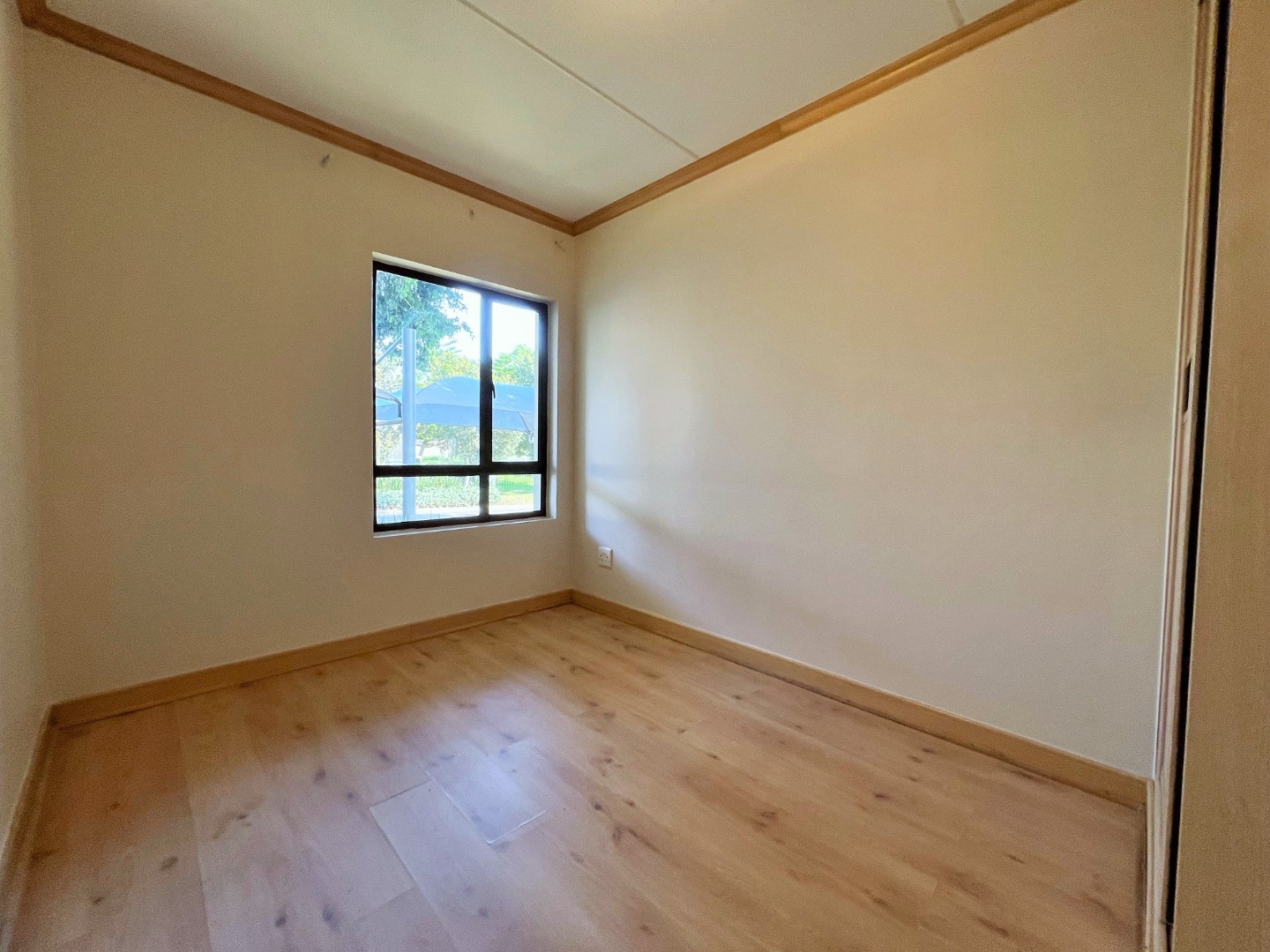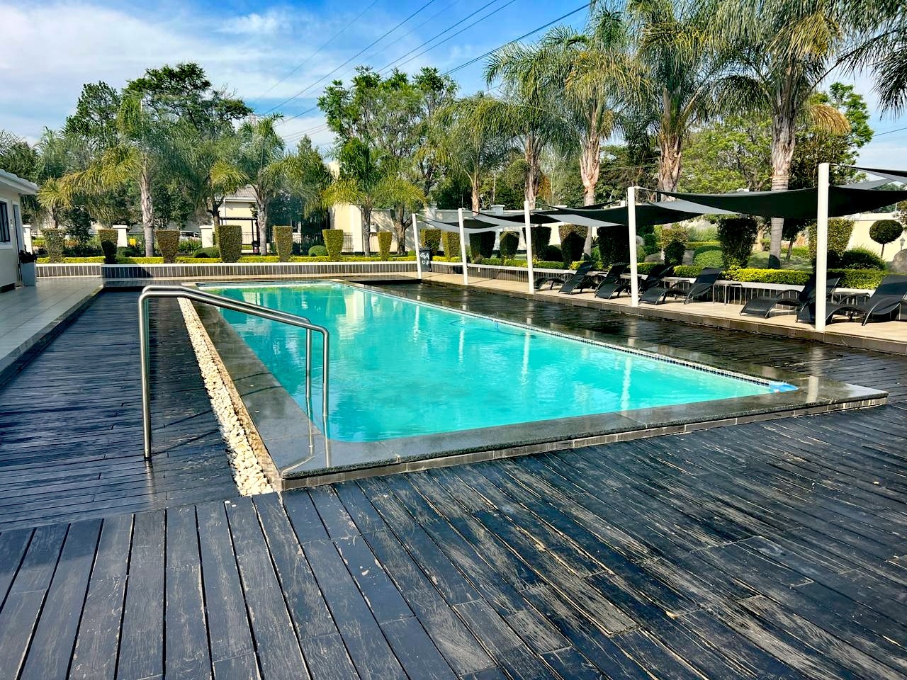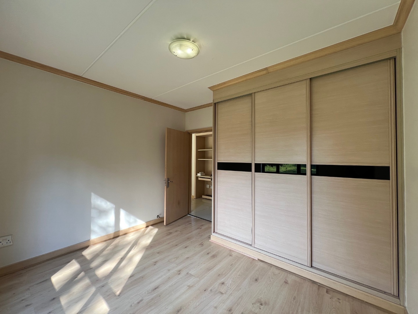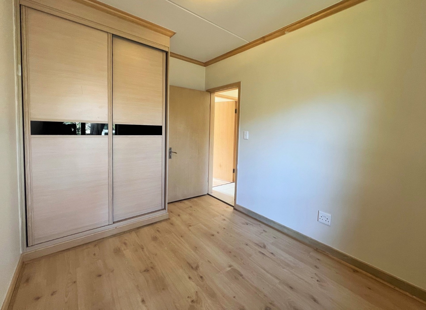 Large sliding glass doors in the living space provide abundant natural light and lead out to a tiled patio, featuring architectural pillars. This outdoor area offers a scenic view of the well-maintained communal garden with mature trees and paved pathways, perfect for relaxation. Residents benefit from access to a communal swimming pool, kids play park, a clubhouse, and a communal braai area, fostering a vibrant community lifestyle. The bedrooms are bright and feature modern wood-look laminate flooring and spacious built-in wardrobes with sliding doors, as seen in the photos, providing ample storage.