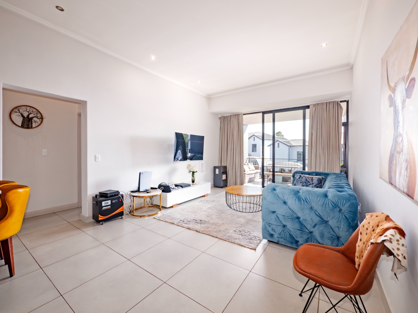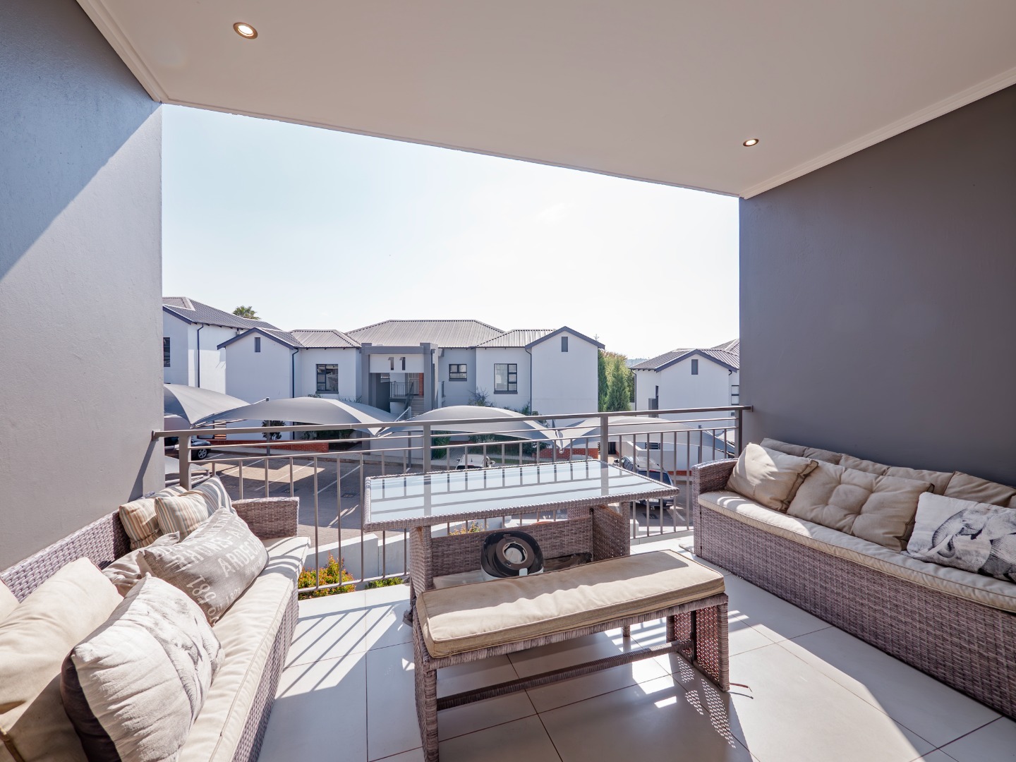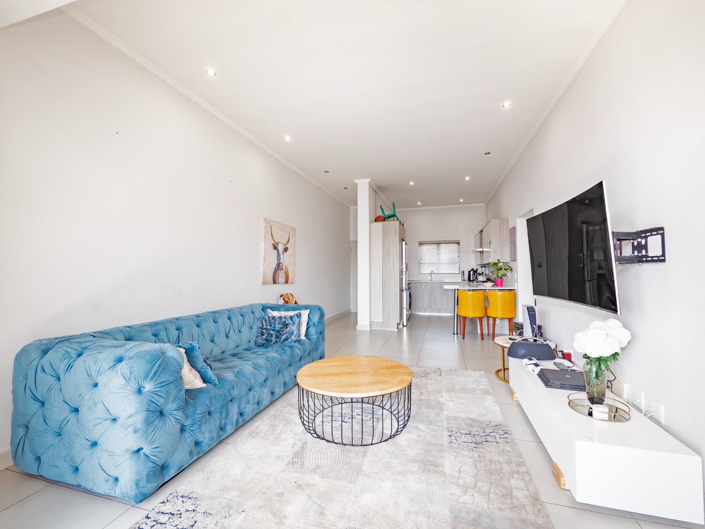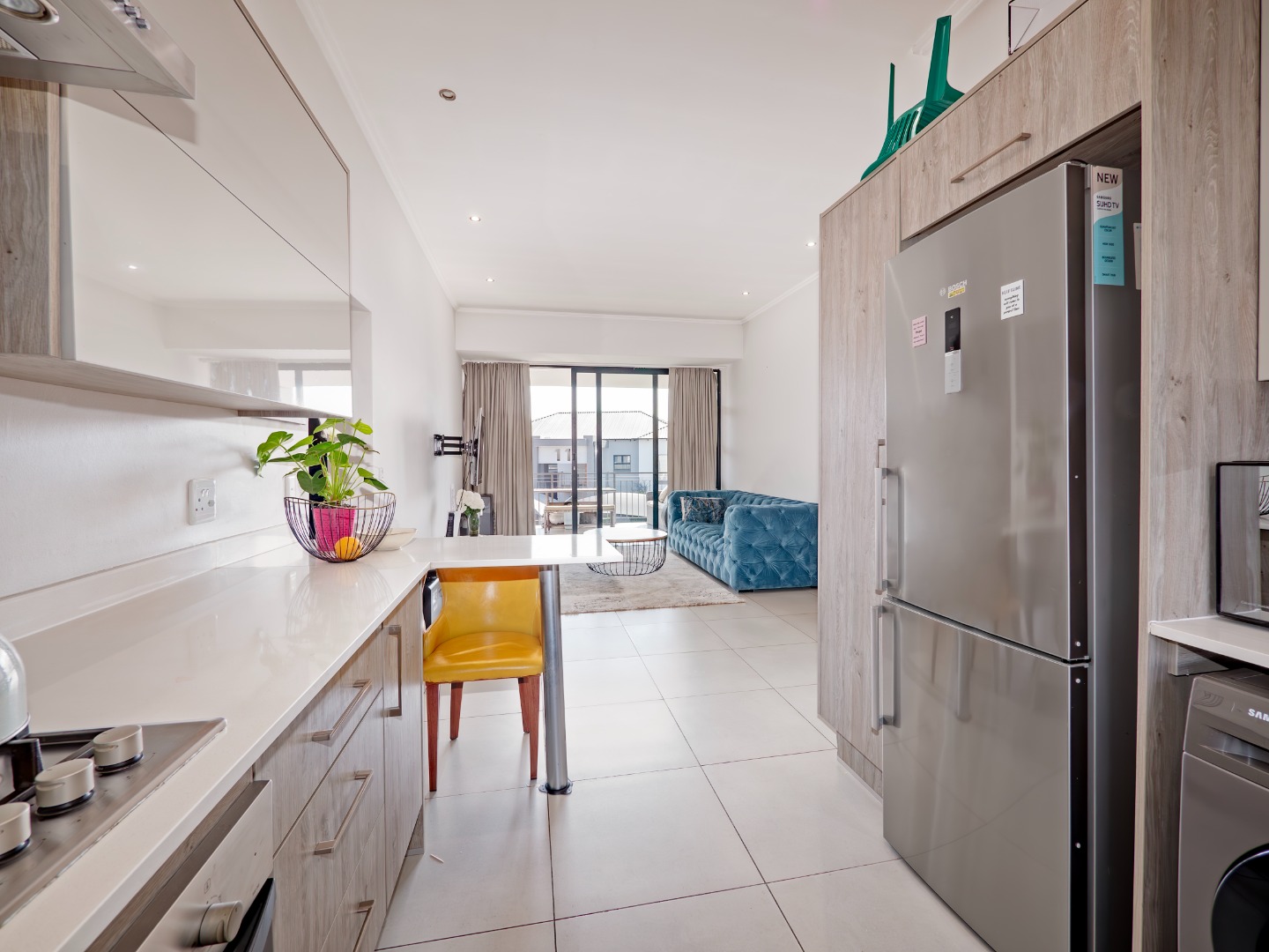 Discover this modern 3-bedroom, 2-bathroom rental property spanning 103 sqm, situated within a secure complex in Broadacres, Sandton. The residence features an inviting open-plan living area, seamlessly connecting to a contemporary kitchen. This space boasts high-gloss light cabinetry, sleek white countertops, stainless steel appliances, and an integrated breakfast bar. Tiled flooring and recessed lighting extend throughout, with sliding doors leading to a private balcony.
