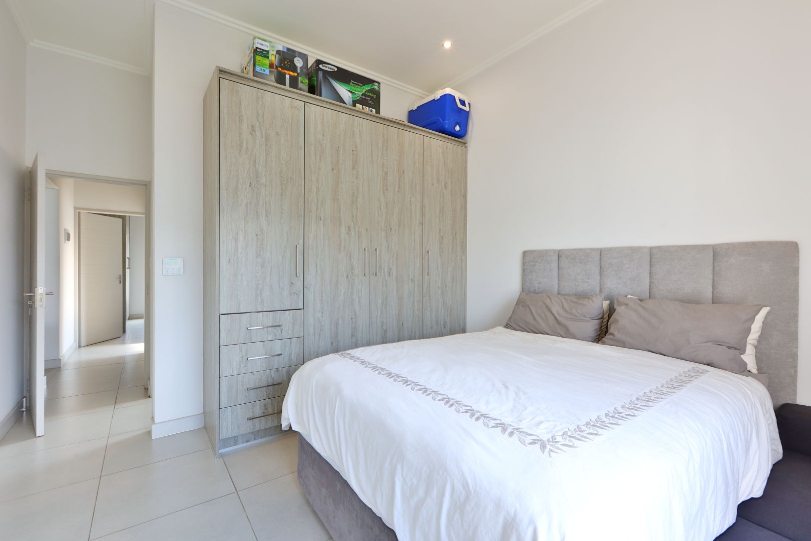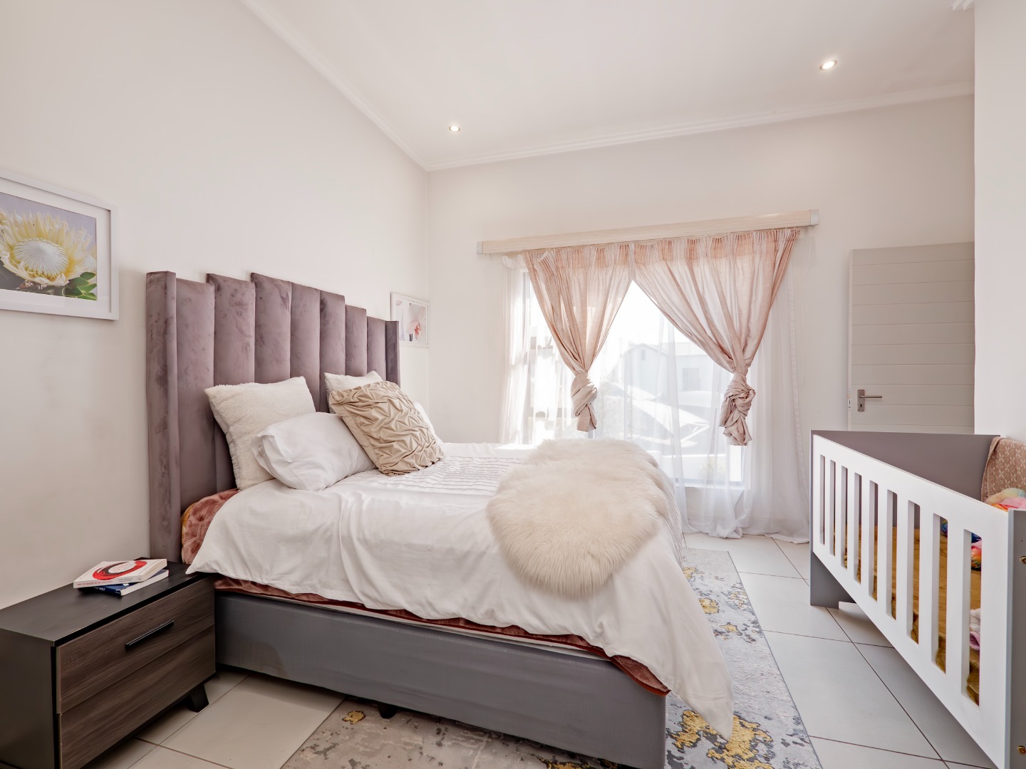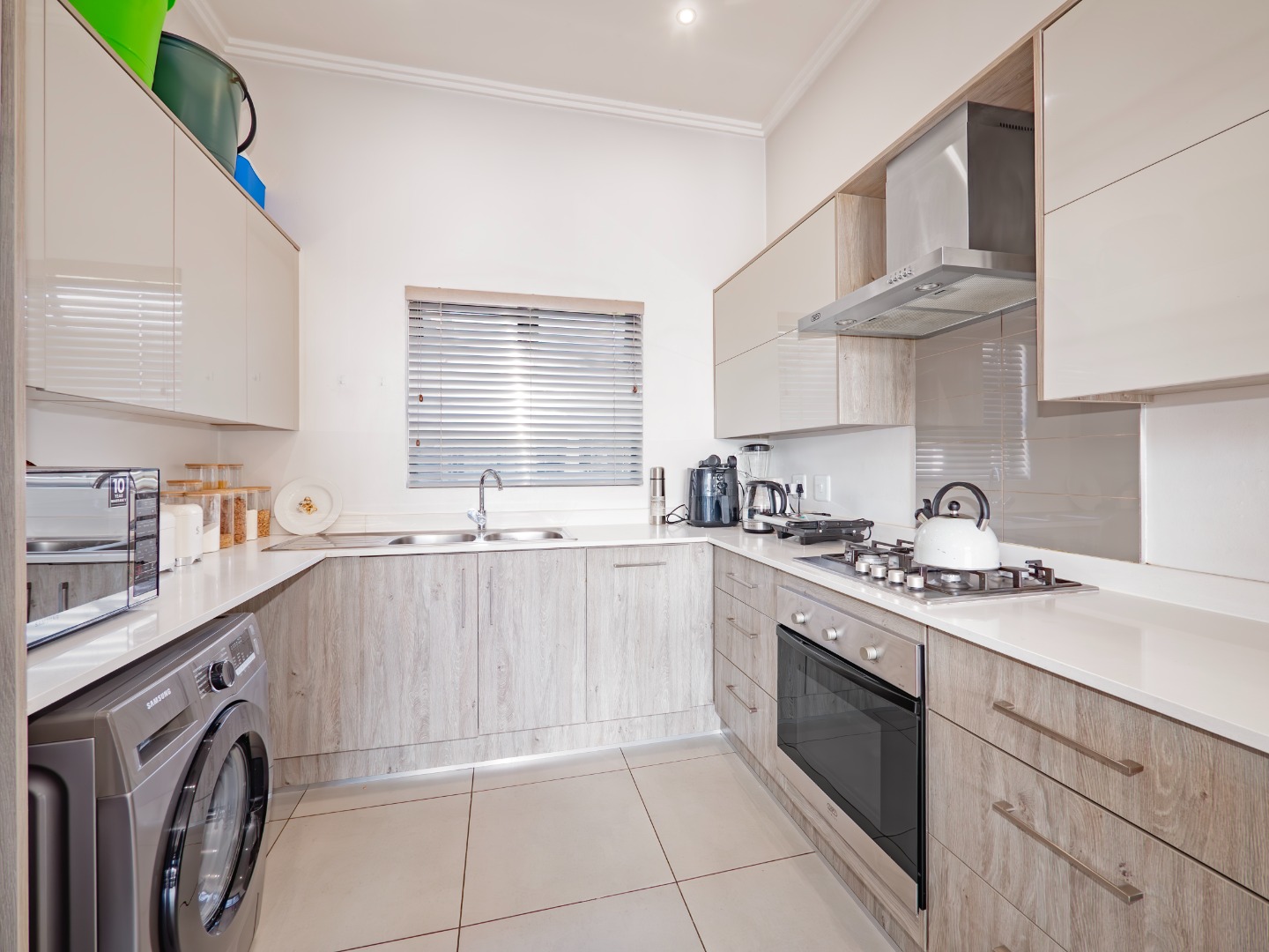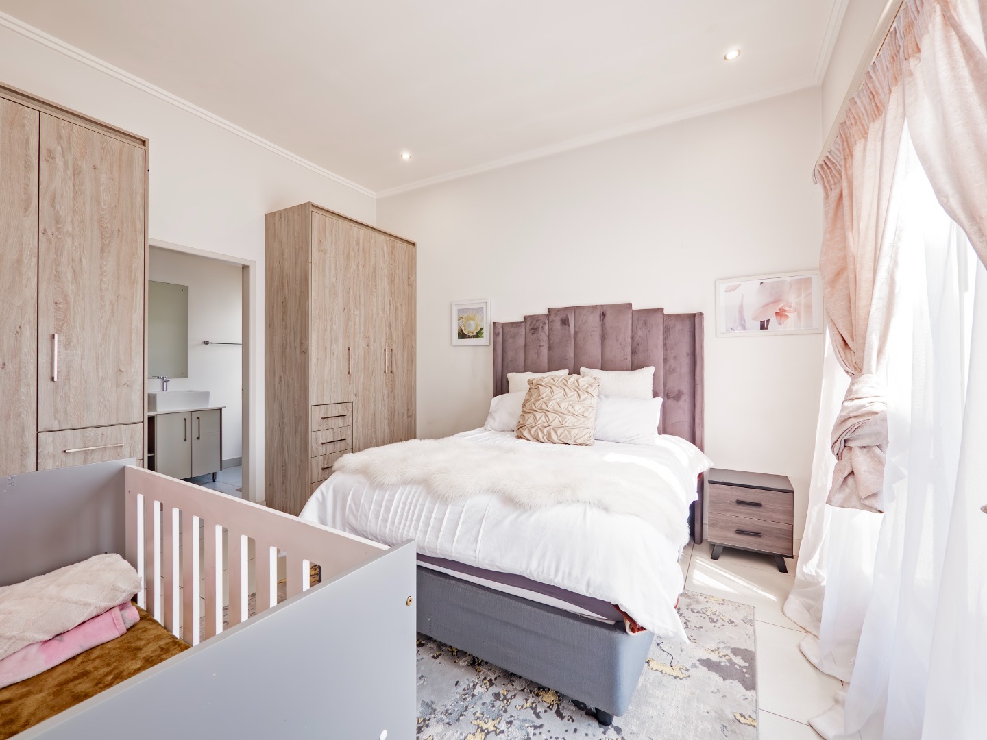 Discover this modern 3-bedroom, 2-bathroom rental property spanning 103 sqm, situated within a secure complex in Broadacres, Sandton. The residence features an inviting open-plan living area, seamlessly connecting to a contemporary kitchen. This space boasts high-gloss light cabinetry, sleek white countertops, stainless steel appliances, and an integrated breakfast bar. Tiled flooring and recessed lighting extend throughout, with sliding doors leading to a private balcony.