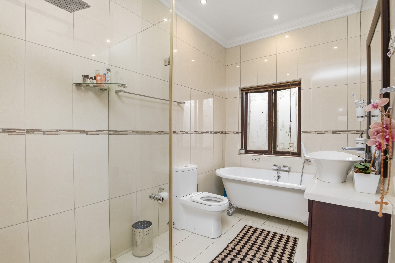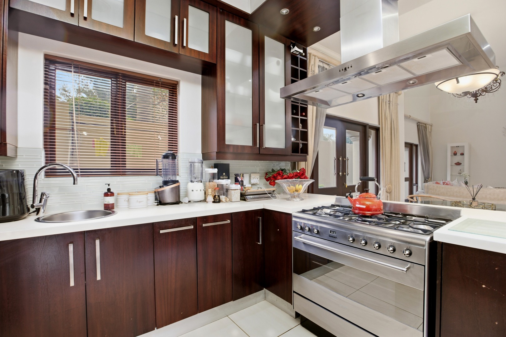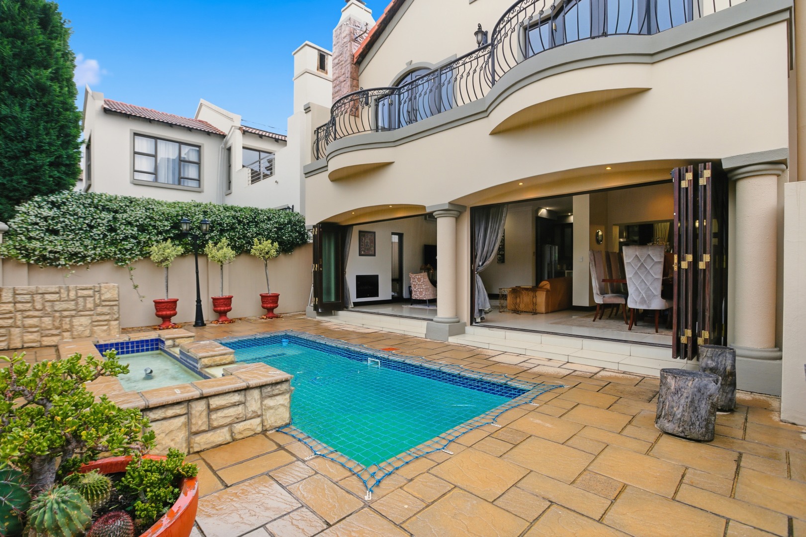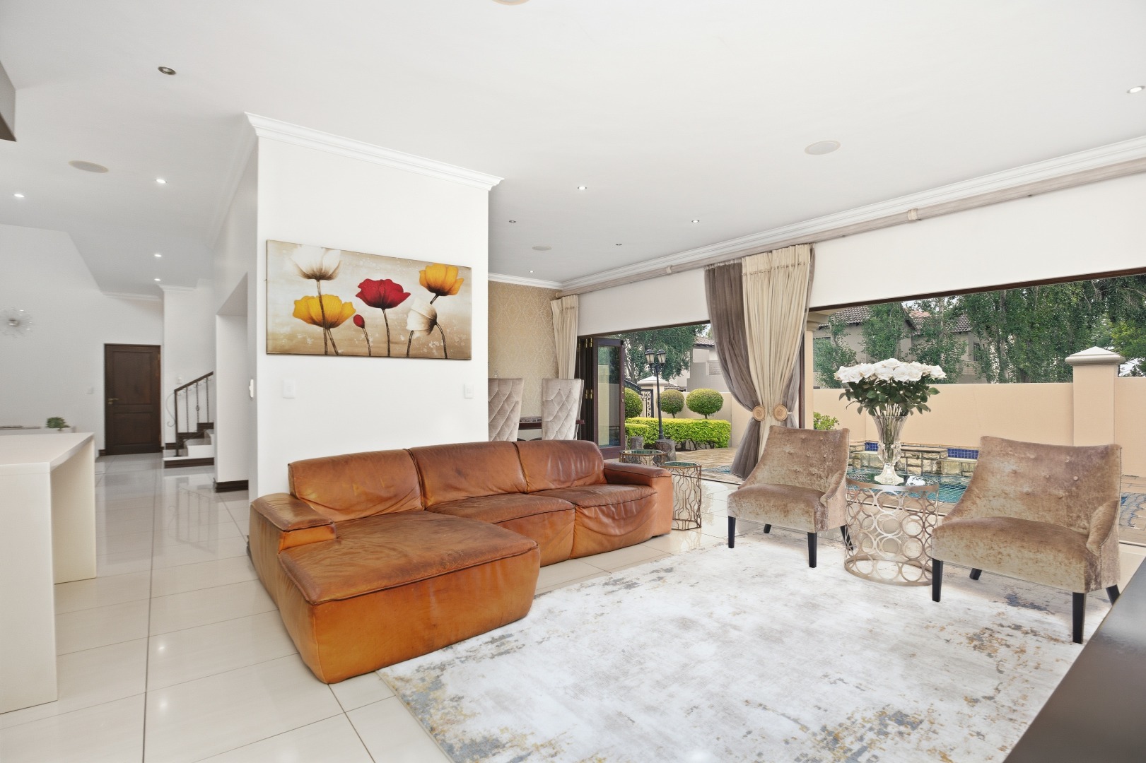 The ground floor showcases elegant open-plan living, with a modern designer kitchen, separate scullery (space for three appliances), and seamless flow through to the dining and lounge areas. The living space opens onto a private entertainment patio overlooking a sparkling pool, ideal for hosting or unwinding in peace.