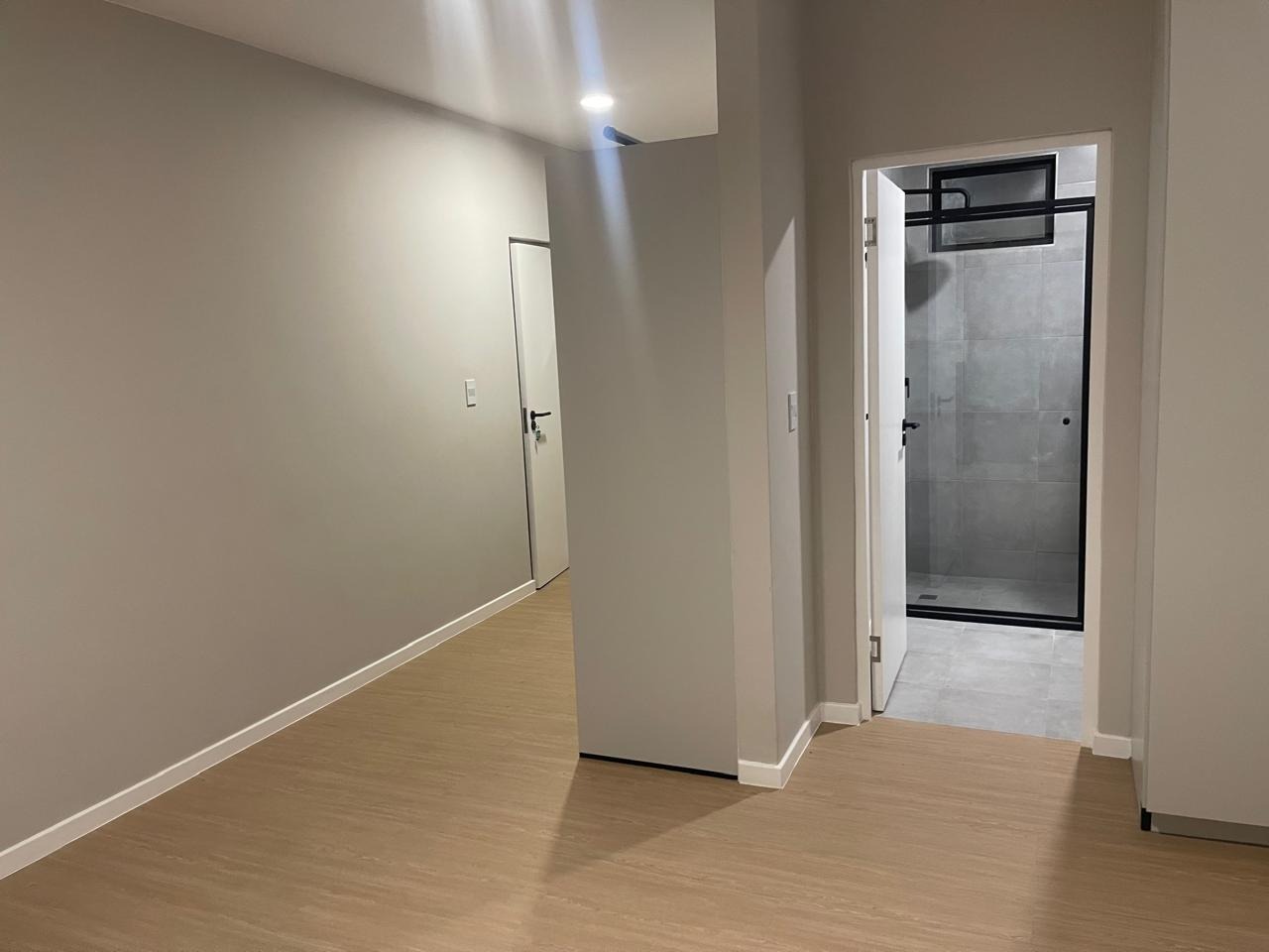 A private bathroom is directly accessible from the main living area, while large sliding glass doors open to a private outdoor area, extending your living space.