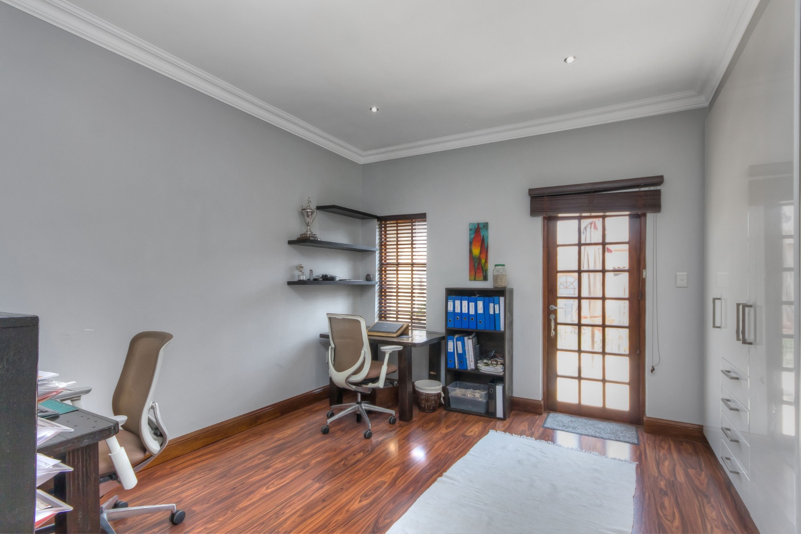 Spacious cluster in the best position in the complex with large living areas leading onto the covered patio and then on to the good size garden and sparkling uniquely finished pool. The open plan gourmet kitchen alongside the dining room has an island, both gas and electric hobs, a separate scullery and pantry, soft touch cupboards and drawers with ample space, is an altogether entertainer’s delight.