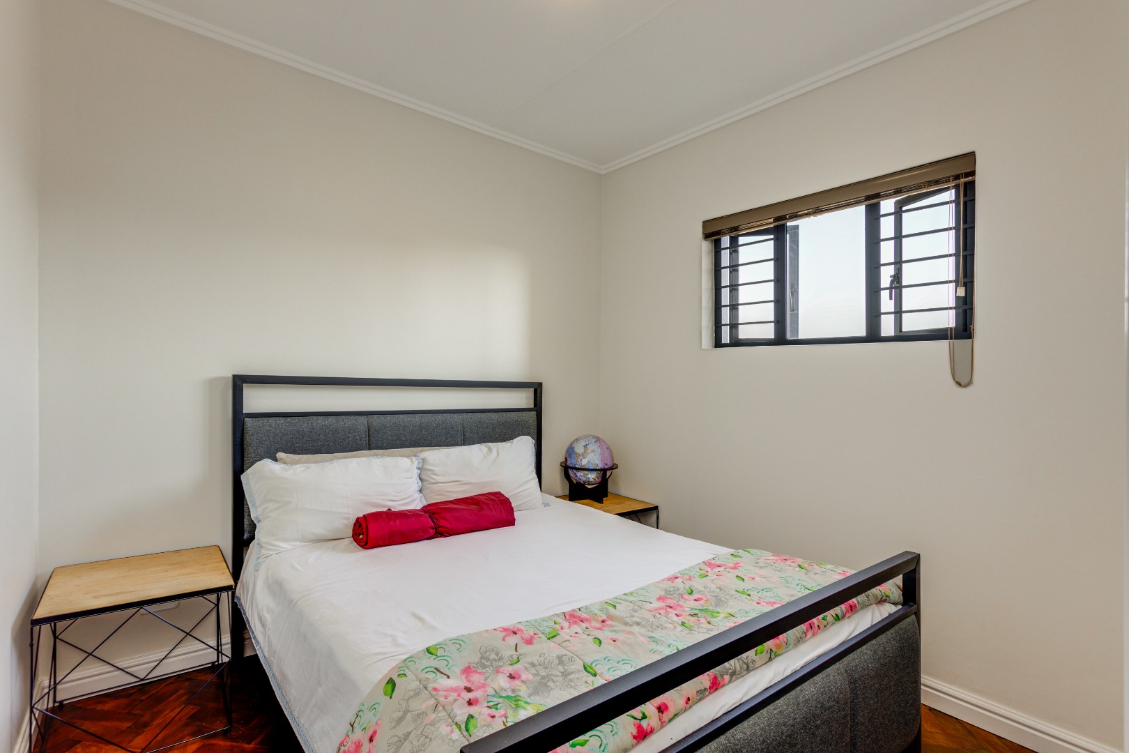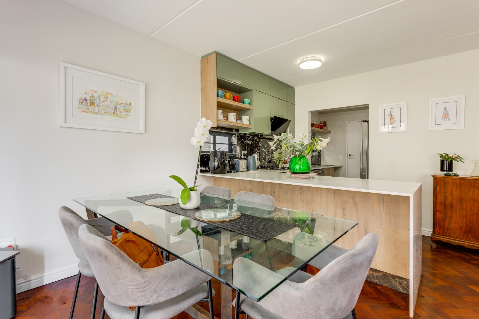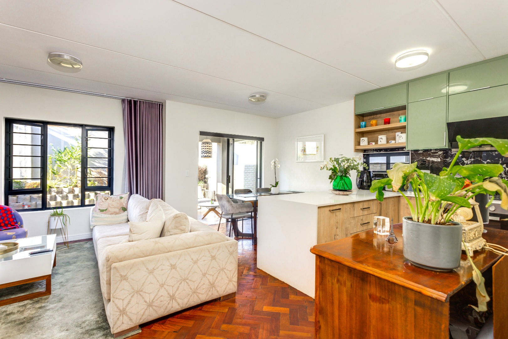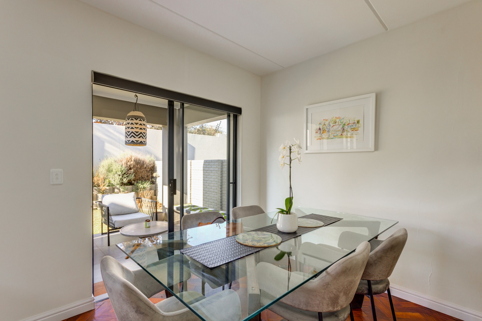 The home features beautiful mahogany wooden flooring, adding warmth and elegance throughout the interior. The open-plan living area flows seamlessly into the enclosed patio, which is perfectly positioned and surrounded by a well-maintained, average-sized garden—ideal for relaxing or entertaining in a peaceful outdoor setting.