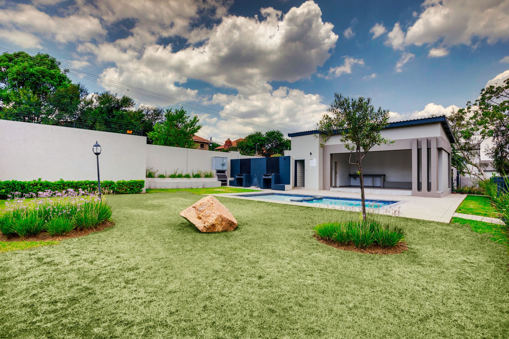 The complex offers a communal swimming pool area with built-in braai for relaxation and entertainment.