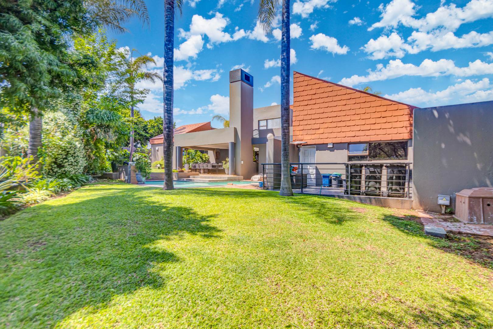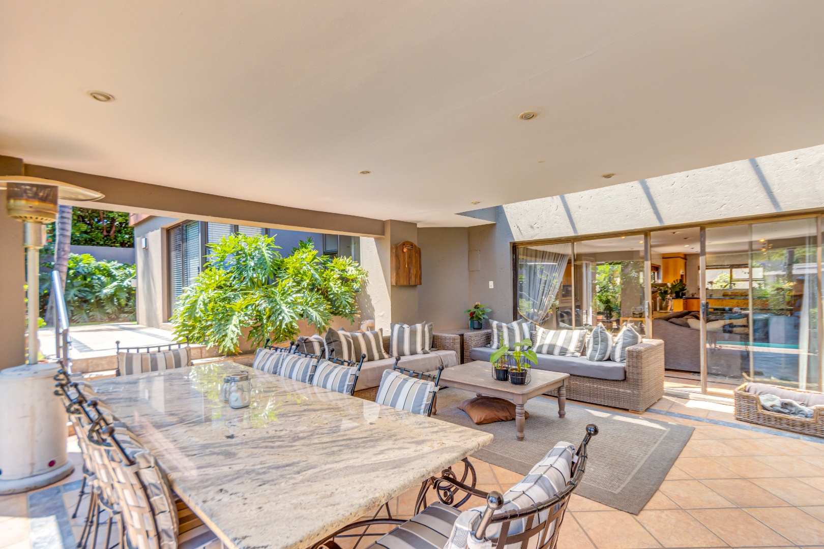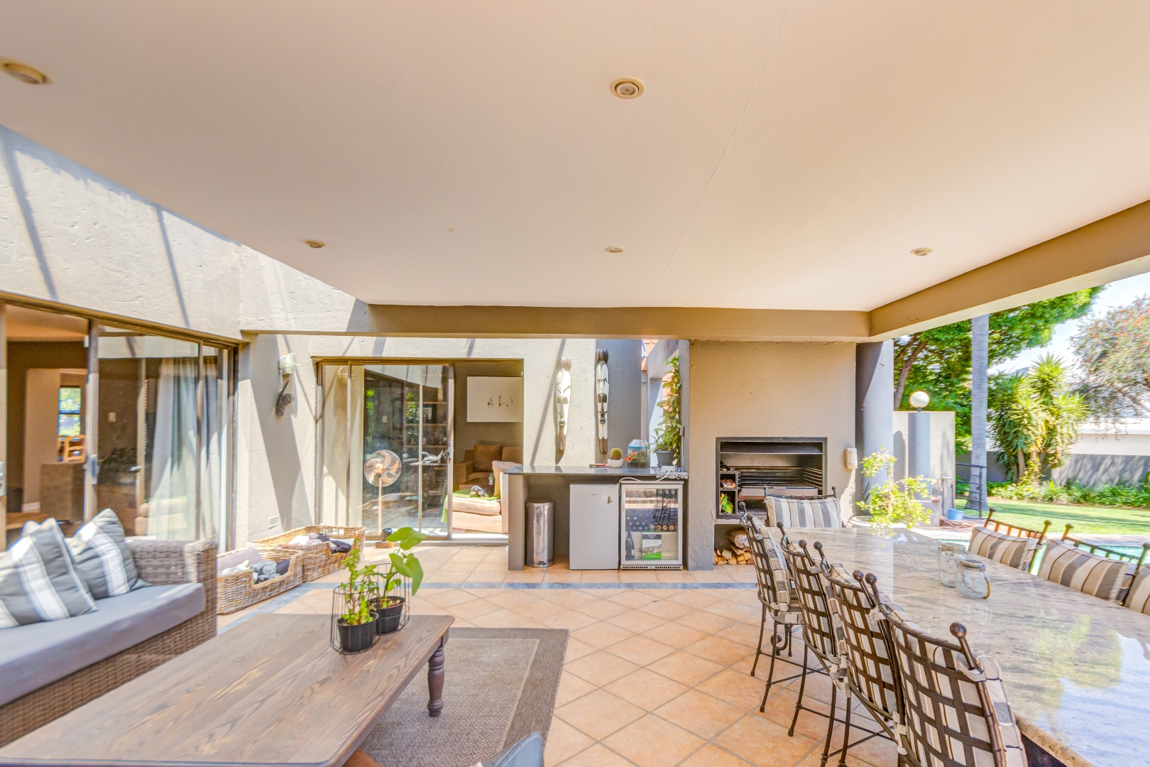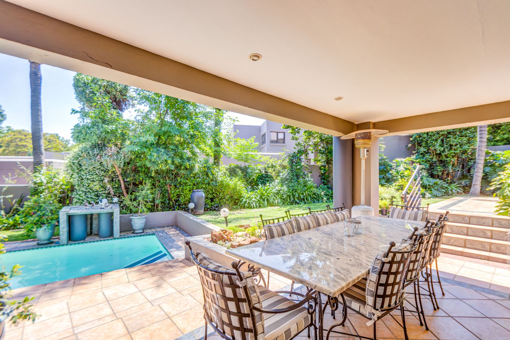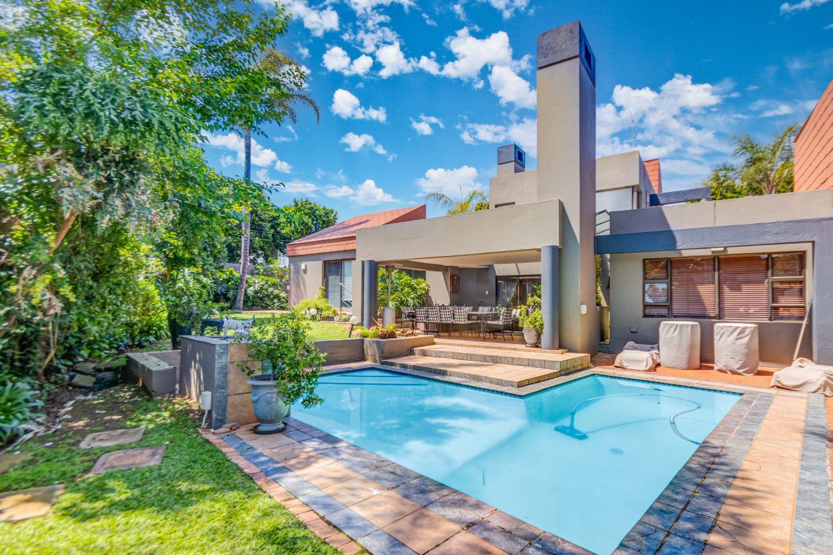 Spanning 429 square meters, the residence features an inviting open-plan layout, seamlessly connecting two generous lounges, a dedicated dining room, and a well-appointed kitchen with a separate scullery. Abundant natural light, recessed lighting, and large sliding doors promote effortless indoor-outdoor flow. A cozy fireplace, air conditioning, and a dedicated study ensure comfort and functionality. The expansive covered patio, accessible via sliding doors, offers distinct dining and lounge zones, perfect for entertaining. This space overlooks a lush, private garden and features a refreshing plunge pool, ideal for hot summer days.