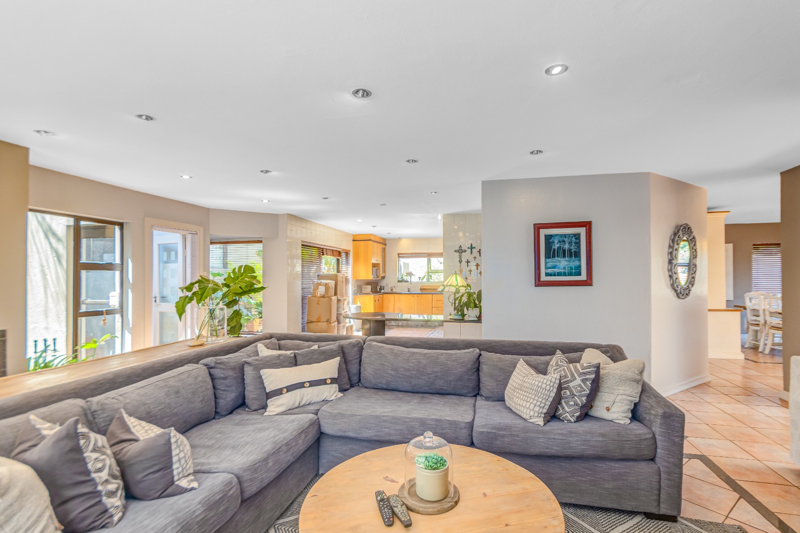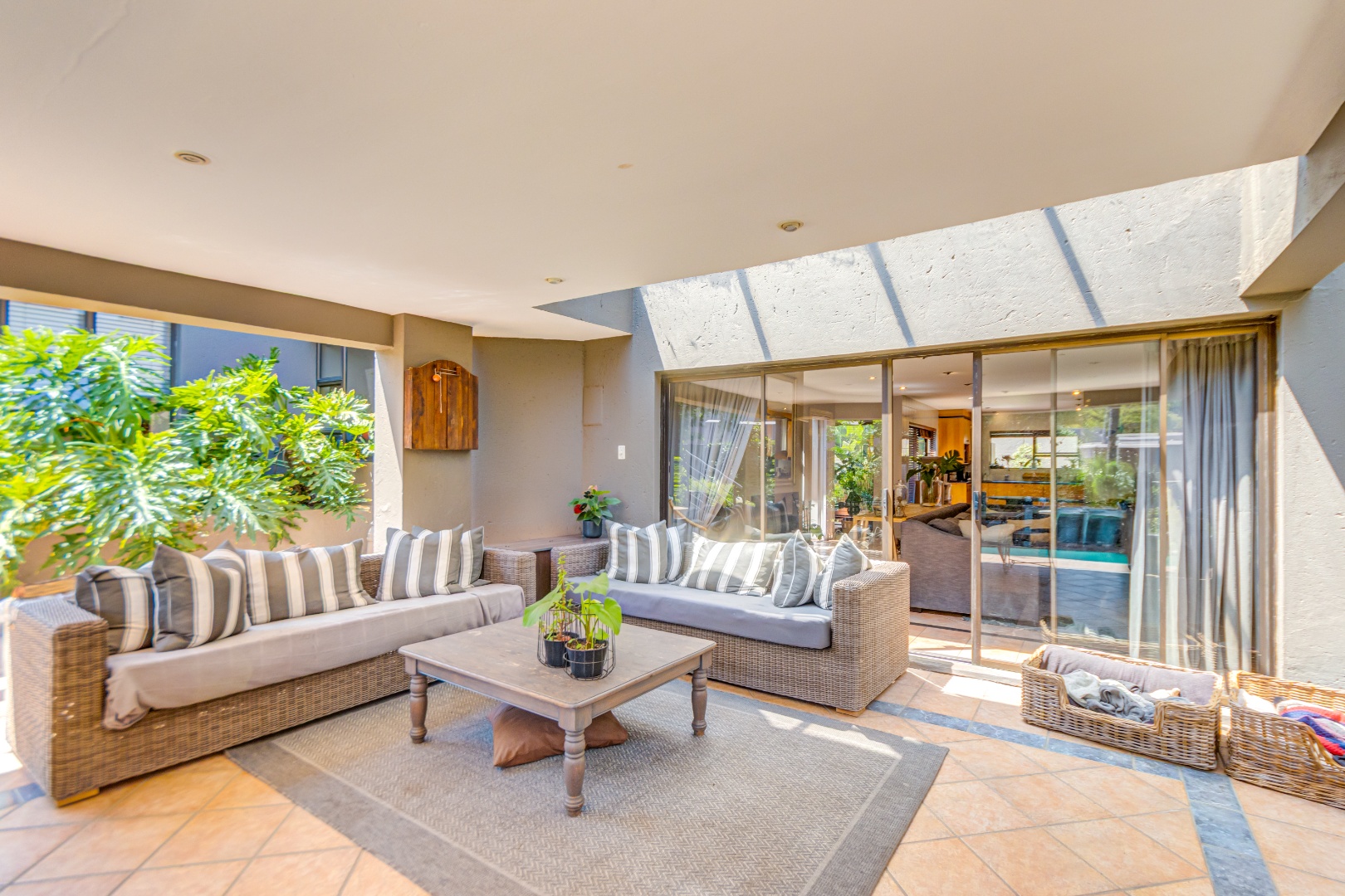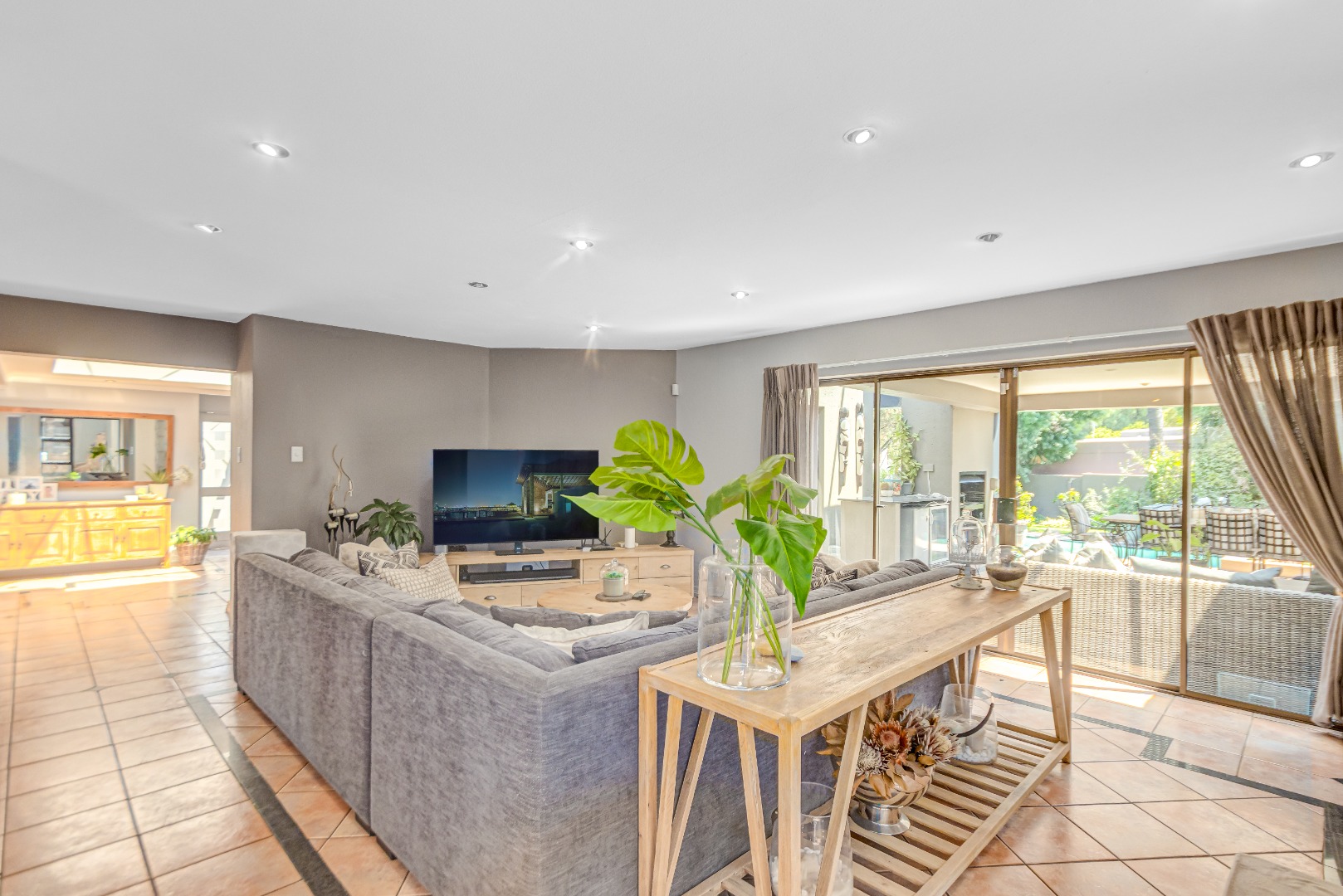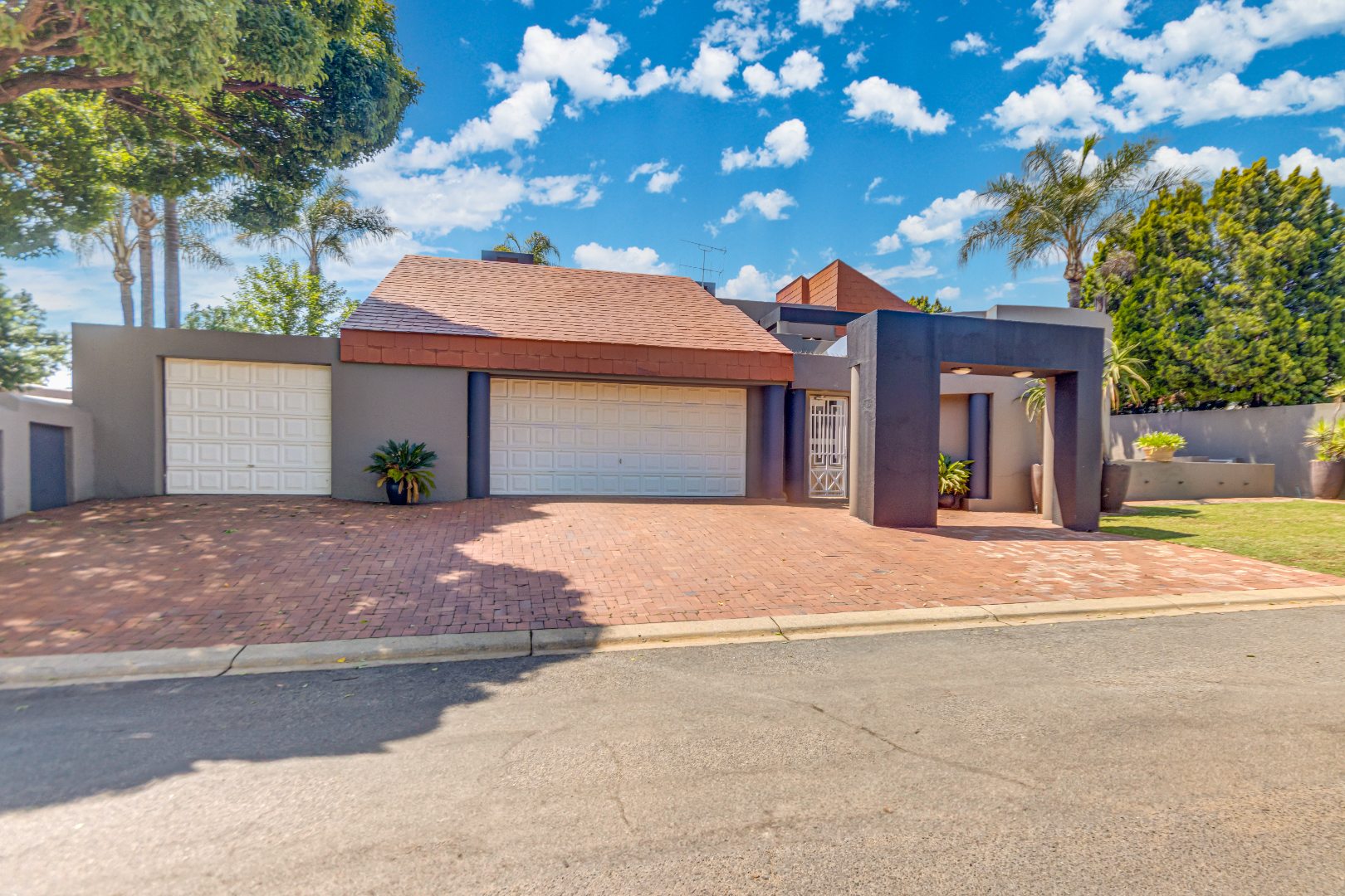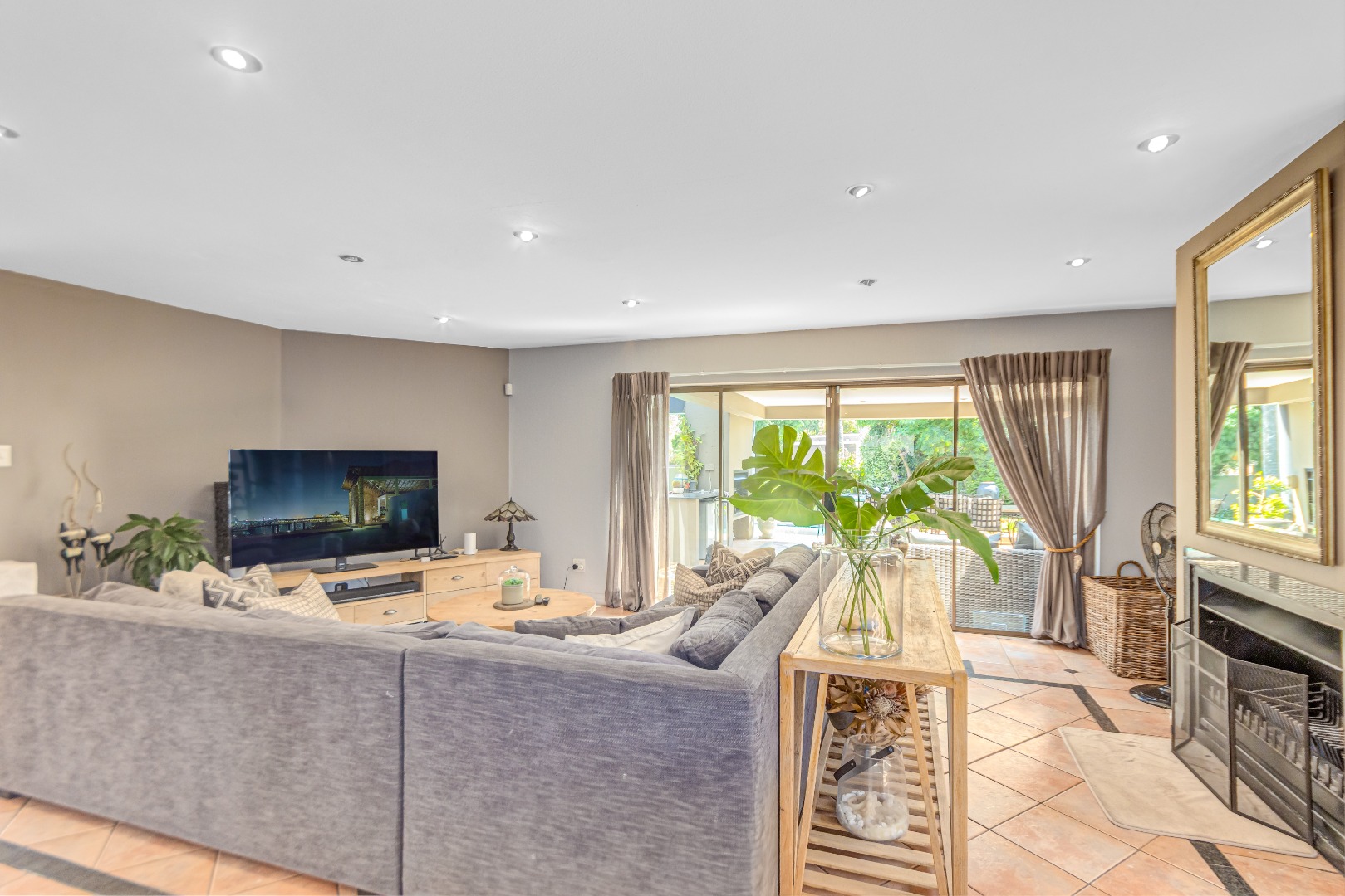 Spanning 429 square meters, the residence features an inviting open-plan layout, seamlessly connecting two generous lounges, a dedicated dining room, and a well-appointed kitchen with a separate scullery. Abundant natural light, recessed lighting, and large sliding doors promote effortless indoor-outdoor flow. A cozy fireplace, air conditioning, and a dedicated study ensure comfort and functionality. The expansive covered patio, accessible via sliding doors, offers distinct dining and lounge zones, perfect for entertaining. This space overlooks a lush, private garden and features a refreshing plunge pool, ideal for hot summer days.