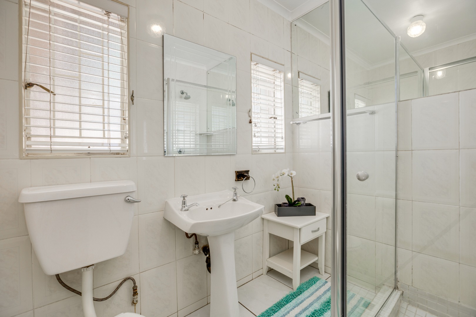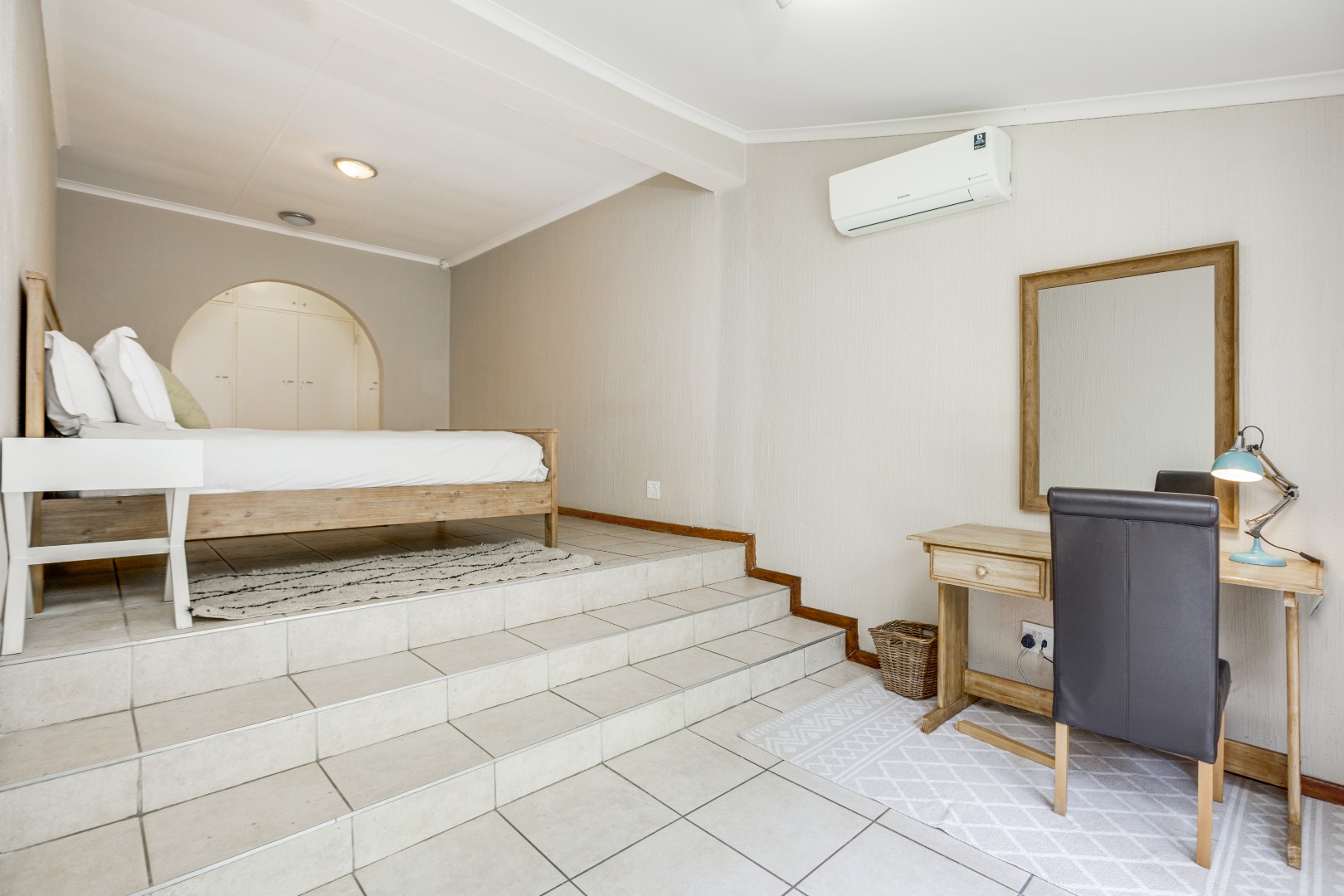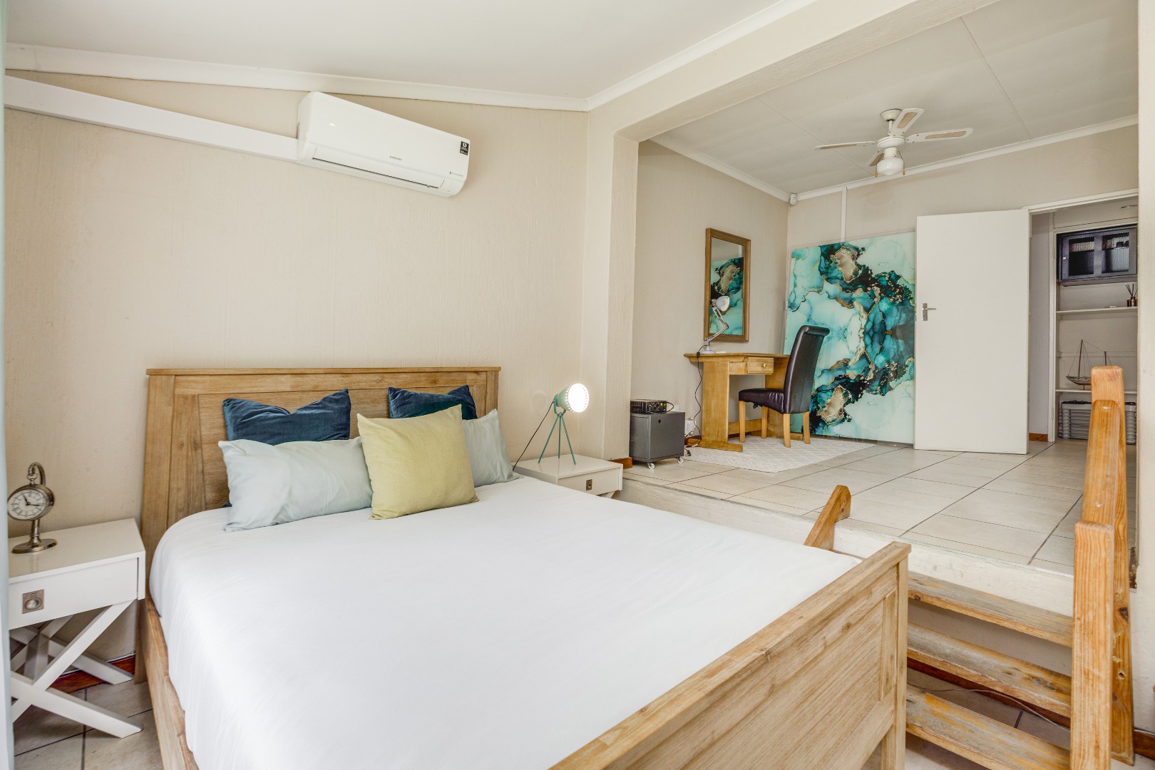 All three bedrooms are generously proportioned, each offering space for a study or small lounge area and featuring individual air conditioning to tailor your comfort. The home boasts two well-appointed bathrooms, ensuring convenience and privacy for all inhabitants.