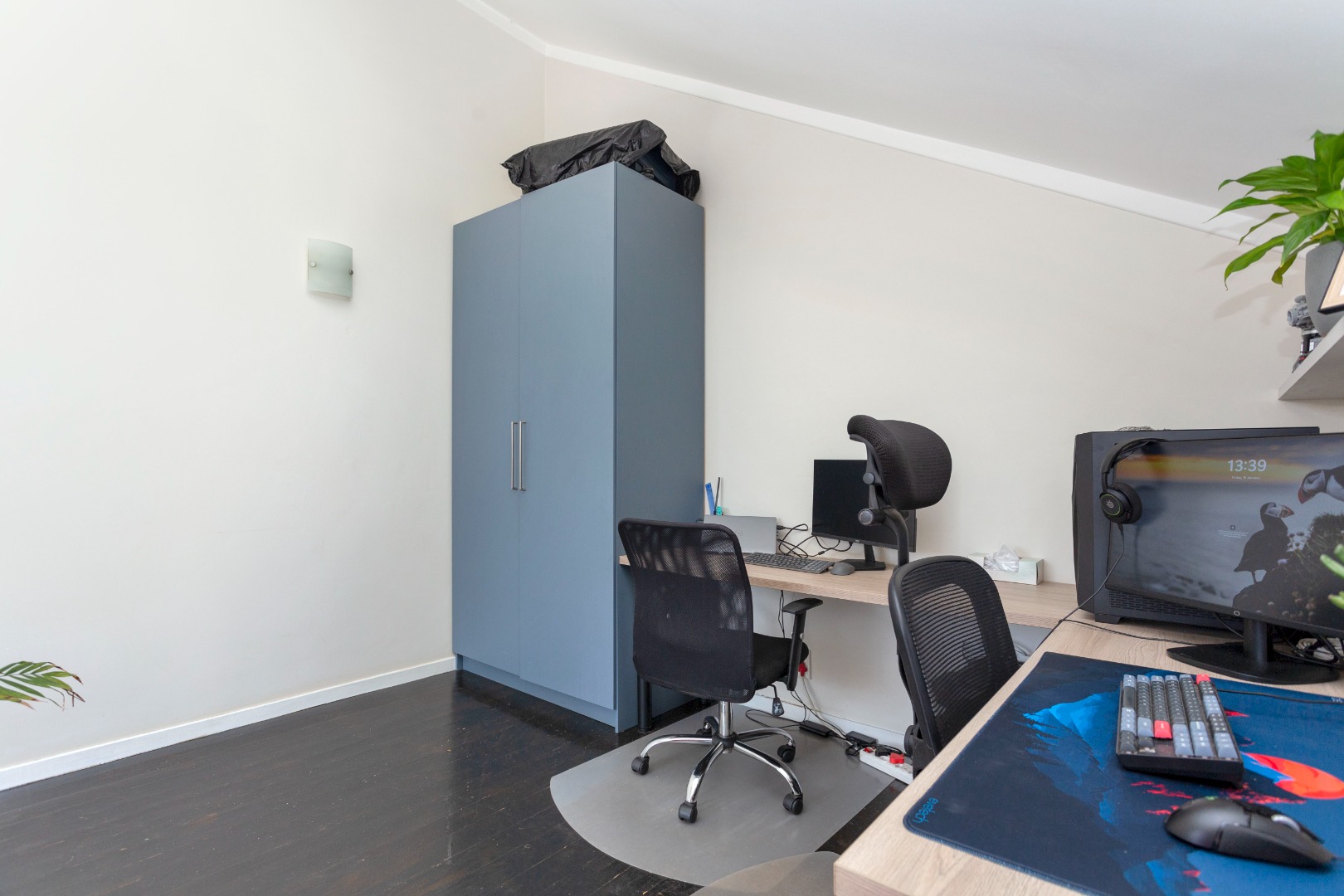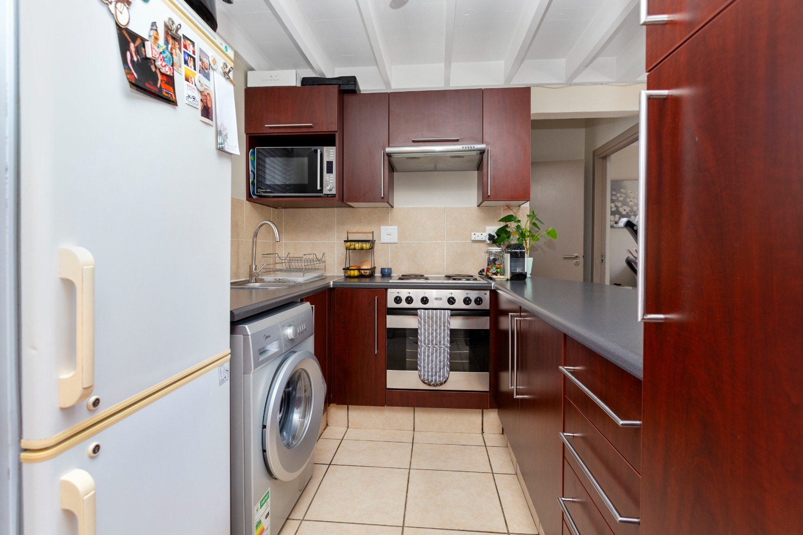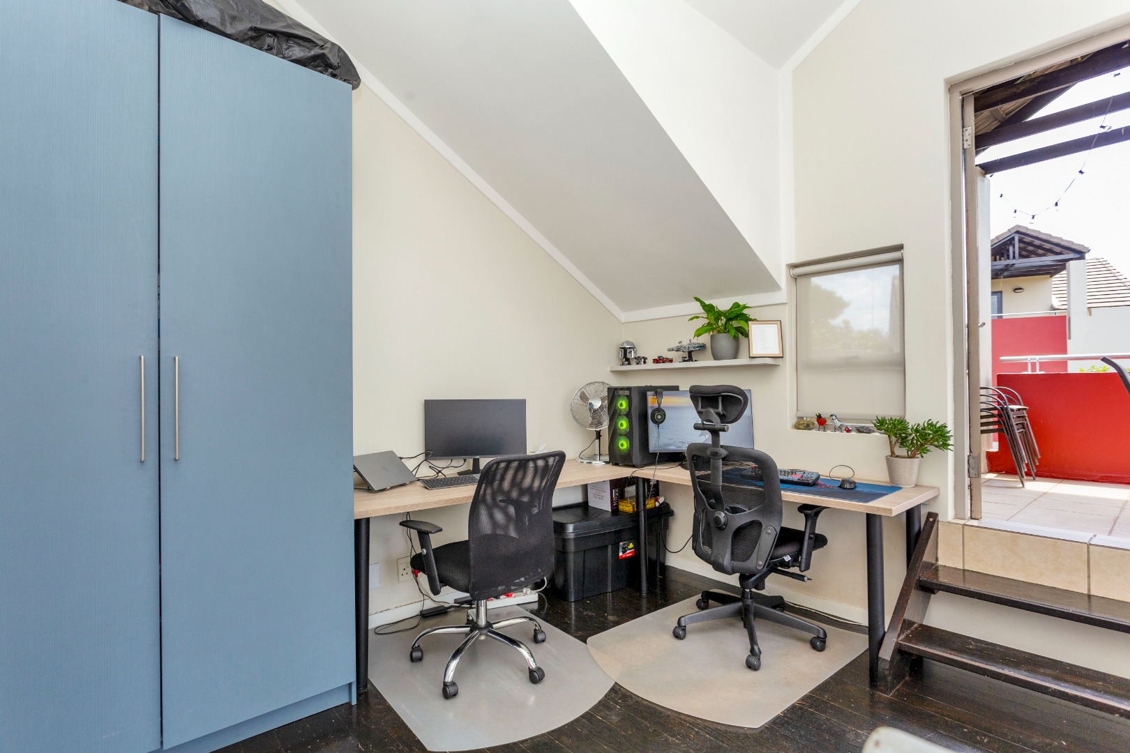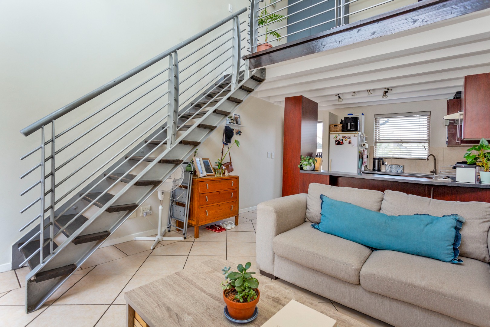 This modern 77 sqm loft unit in Lonehill, Sandton, offers a comfortable and stylish living experience. The open-plan layout features high vaulted ceilings and abundant natural light, creating an airy atmosphere. The open plan lounge leads to a private balcony. The compact yet functional kitchen boasts modern dark wood cabinetry, integrated oven, hob, and extractor fan, with dedicated space for a washing machine, all complemented by a white beamed ceiling. The upstairs loft is fitted with a double workspace and a storage cupboard, perfect for the executive that works from home. Step out onto the spacious, covered balcony, complete with tiled flooring, offering scenic views over the well-maintained residential complex and lush green trees. This outdoor space is perfect for unwinding or entertaining. Large bedroom with laminated flooring and built in cupboards. Bathroom with shower, basin and toilet.