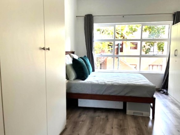 The comfortable bedroom features contemporary wood-look laminate flooring, built-in wardrobes for generous storage, and a large window offering views of greenery. The ensuite bathroom with basin, shower, and bath. Step out onto your private balcony, an ideal spot for enjoying the outdoors and views of the surrounding area.