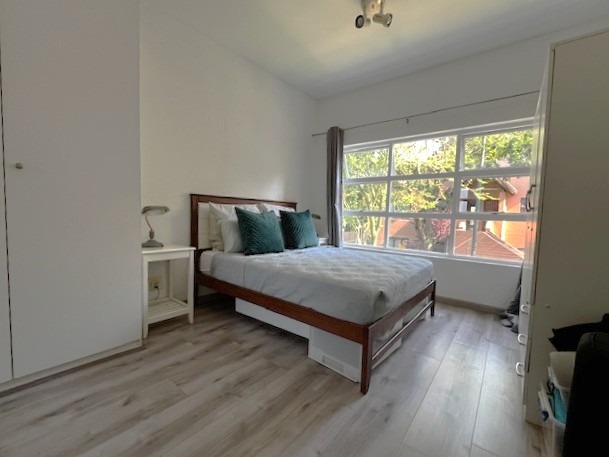 The comfortable bedroom features contemporary wood-look laminate flooring, built-in wardrobes for generous storage, and a large window offering views of greenery. The ensuite bathroom with basin, shower, and bath. Step out onto your private balcony, an ideal spot for enjoying the outdoors and views of the surrounding area.