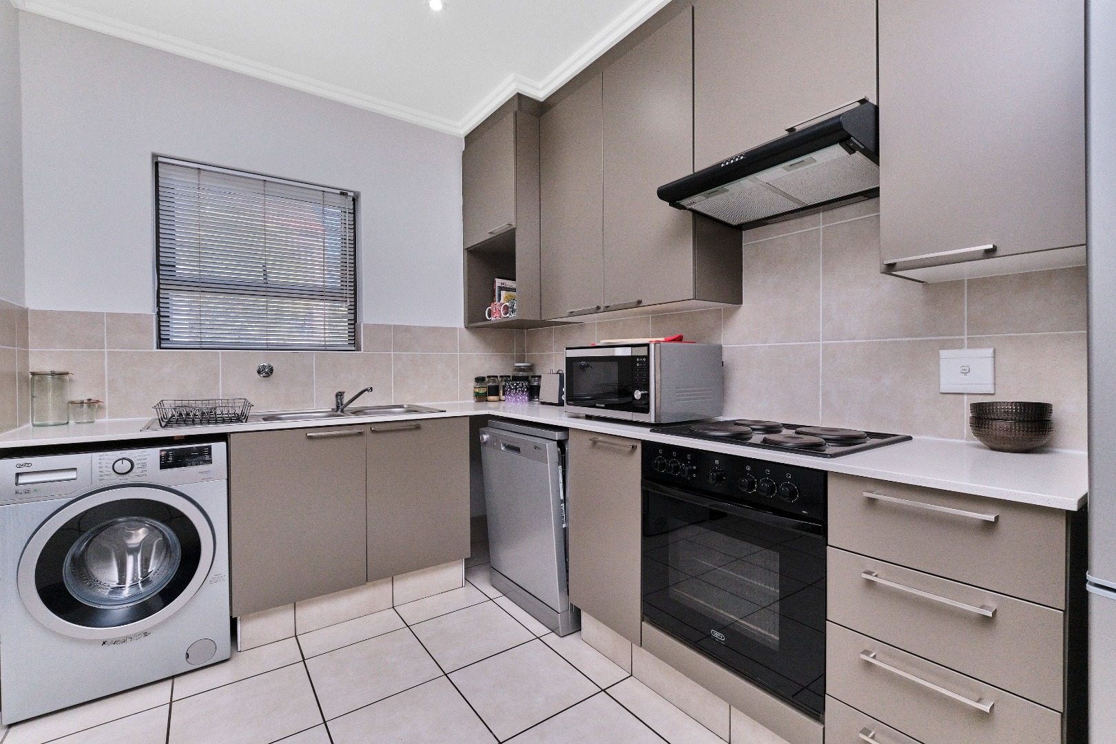 The kitchen is a real highlight, featuring modern taupe cabinets, good counter space, and all the essentials like an oven, hob, extractor fan, dishwasher, and even an washing machine and fridge. It's compact but super functional! The two bedrooms are cozy, and the second one is really versatile – you could easily set it up as a home office, like in the photos, or a guest room.