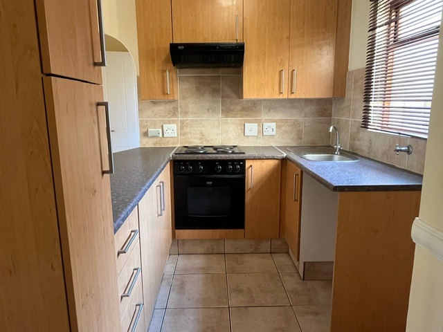 The home features its own private garden and a beautifully tiled patio with classic wood-paned sliding doors that open into a welcoming open-plan lounge and kitchen. The kitchen includes a hob, oven, extractor fan, and space for a dishwasher.