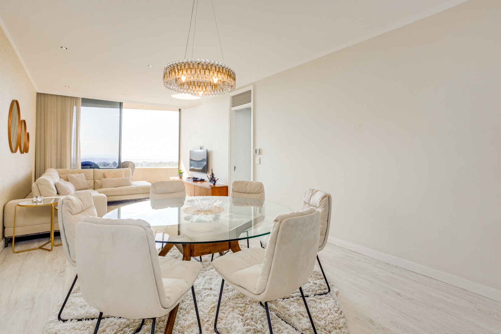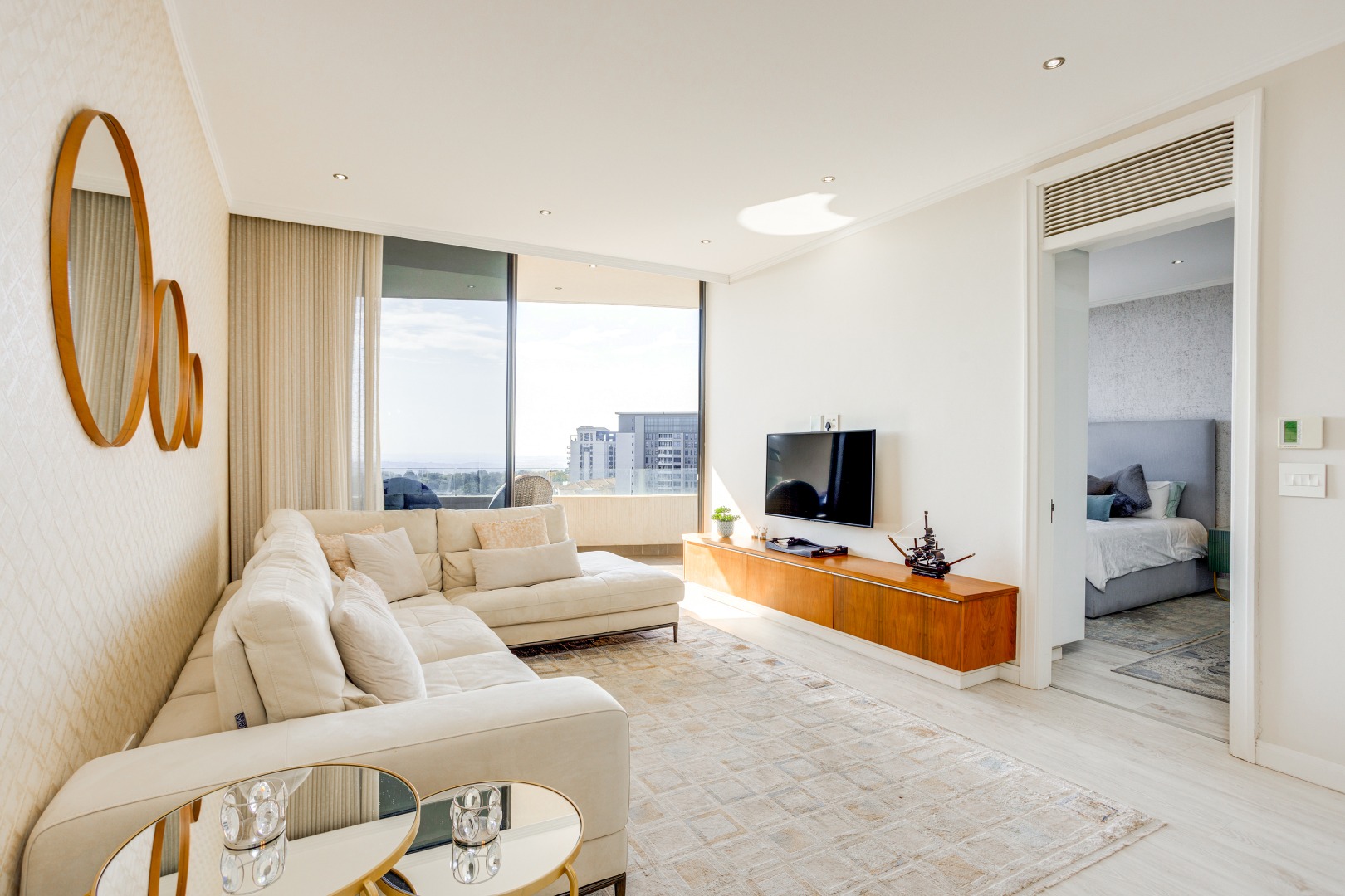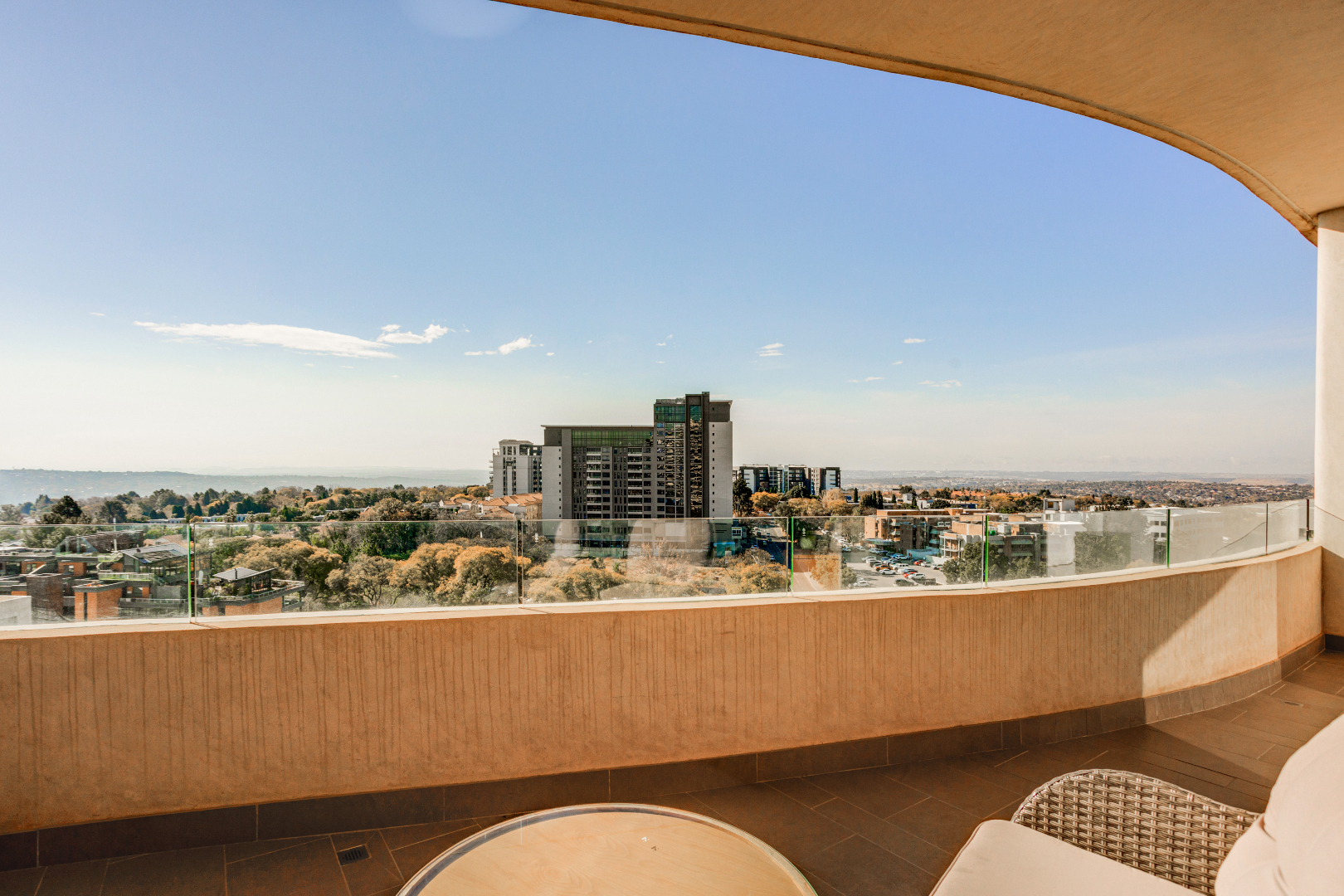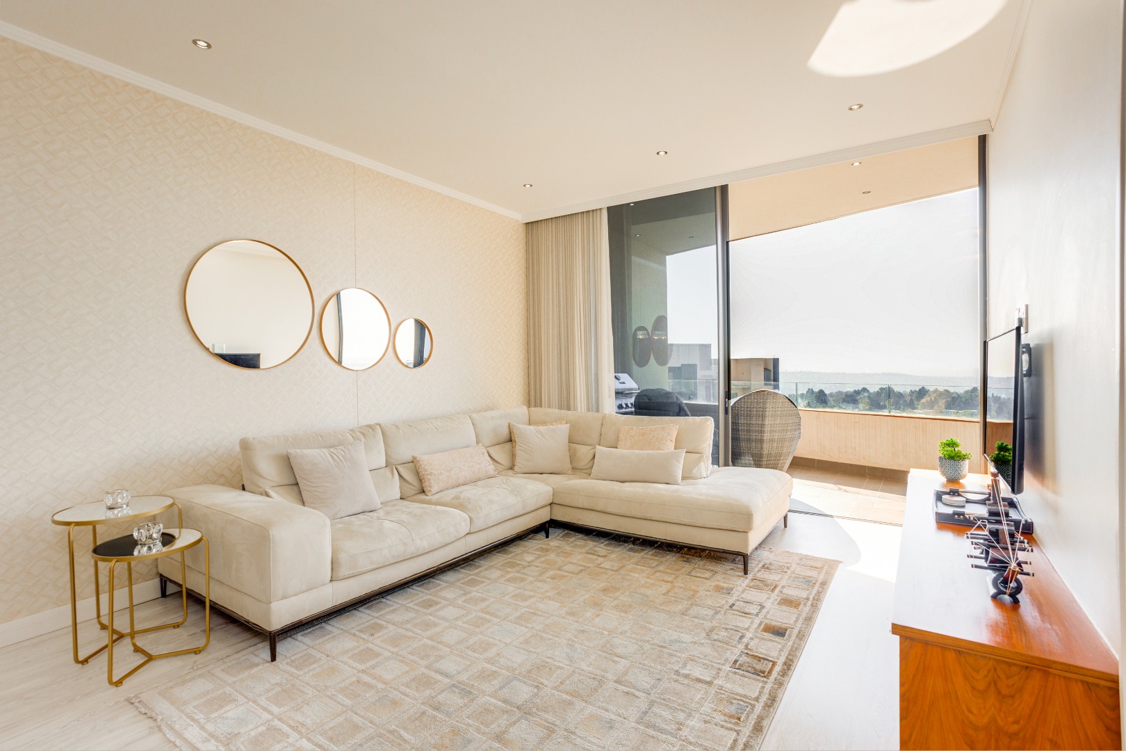 The living room? A perfect cocktail of comfort and sophistication, designed for late-night strategy sessions or champagne toasts to sealing the next big deal. Slide open the doors and that balcony view takes over, Sandton’s skyline glistening like it was built just for you. Morning coffee never tasted so good. Evening whiskey never looked so sharp.