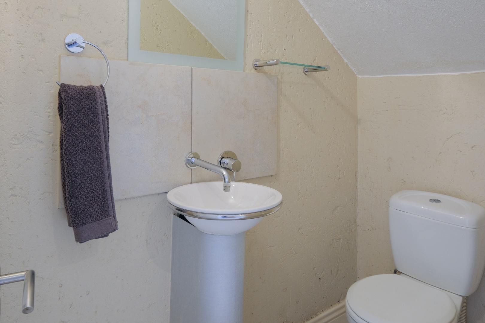 The kitchen includes a separate storeroom and ample space for all appliances, while a guest toilet on the lower level adds convenience.