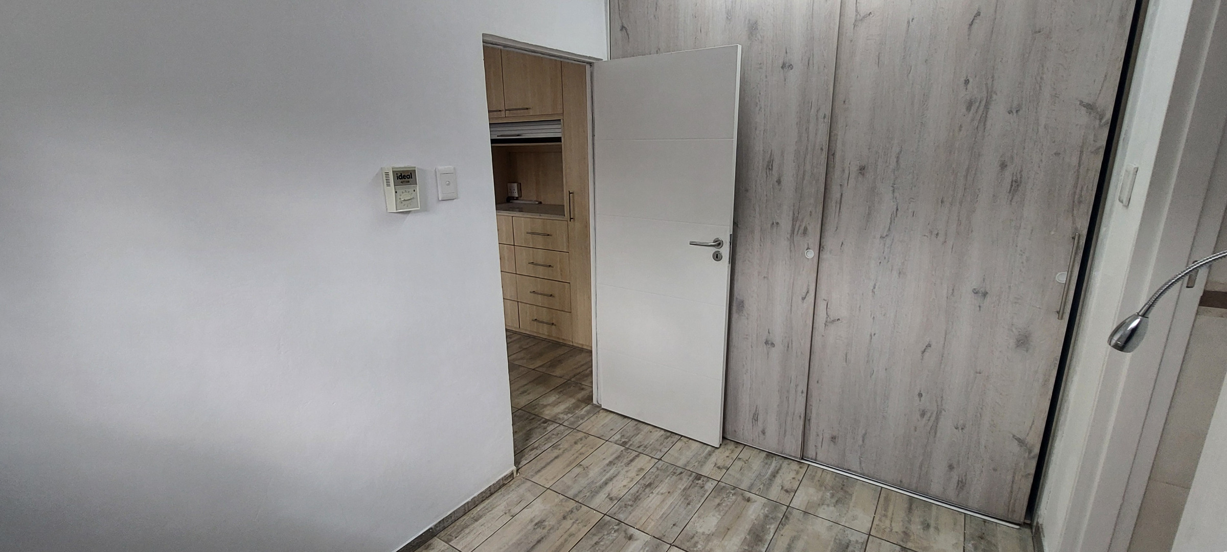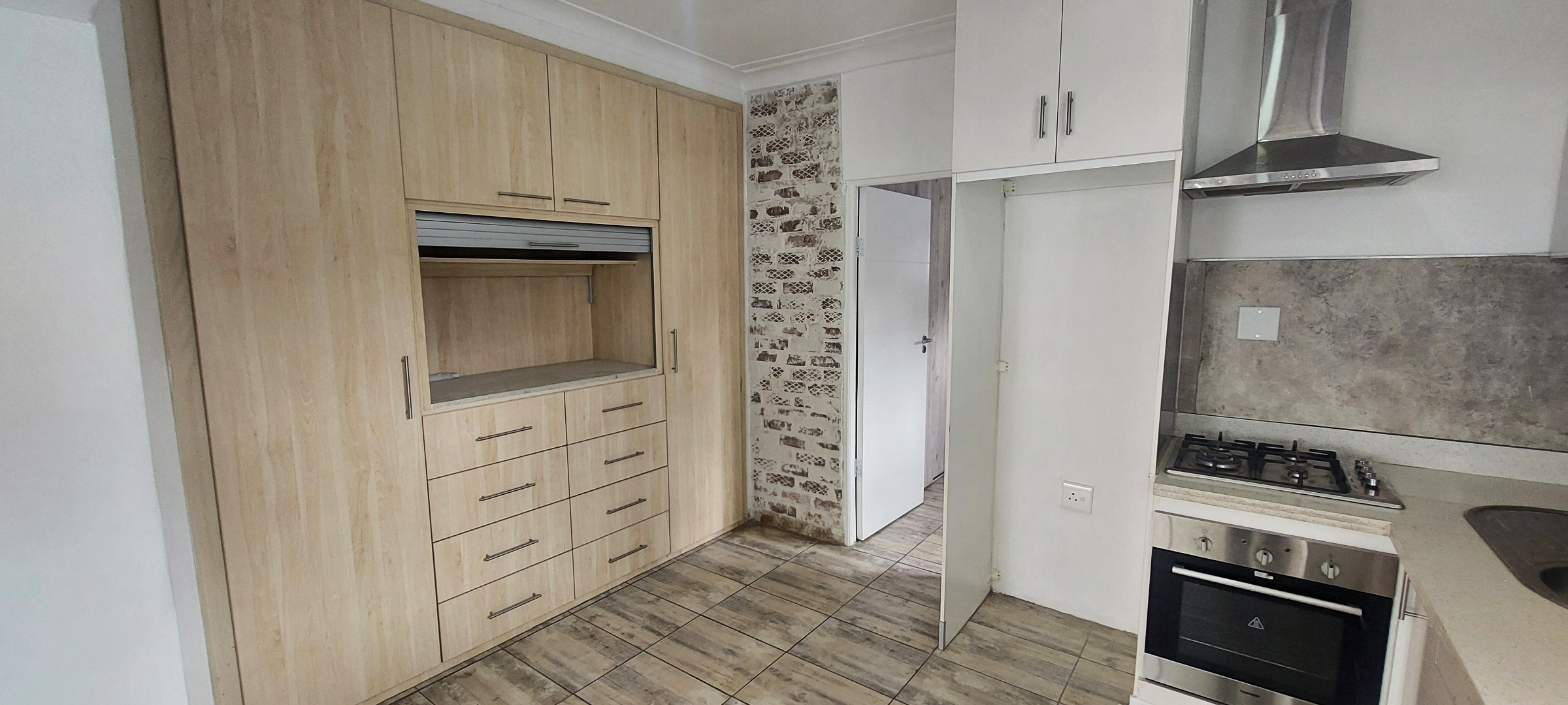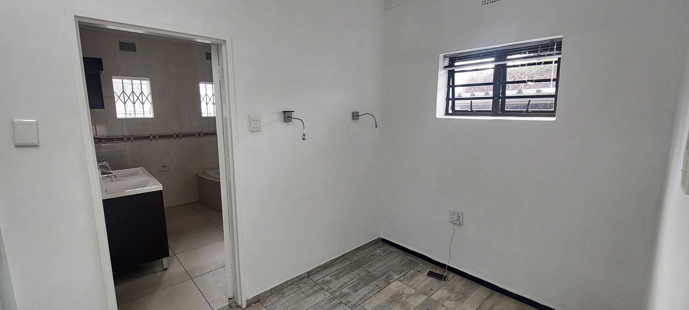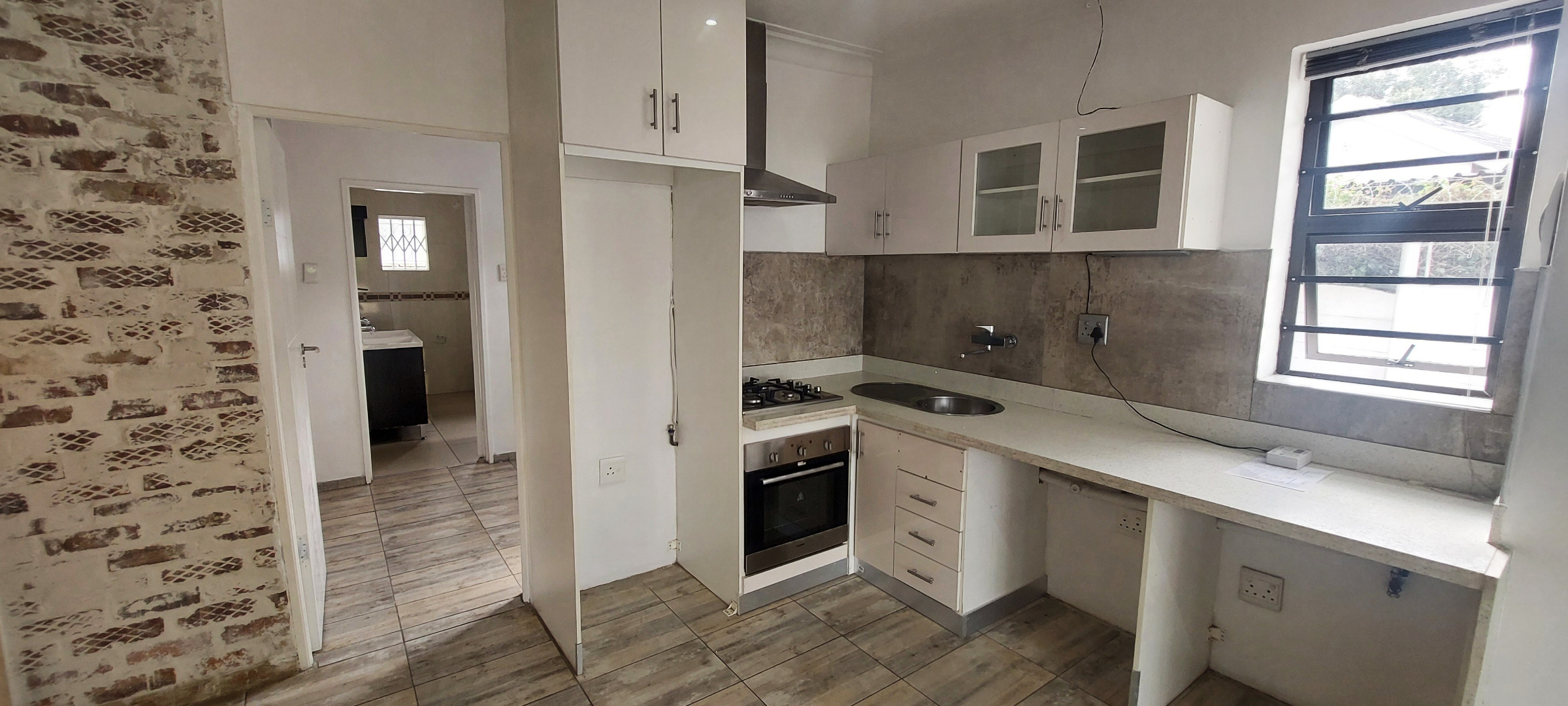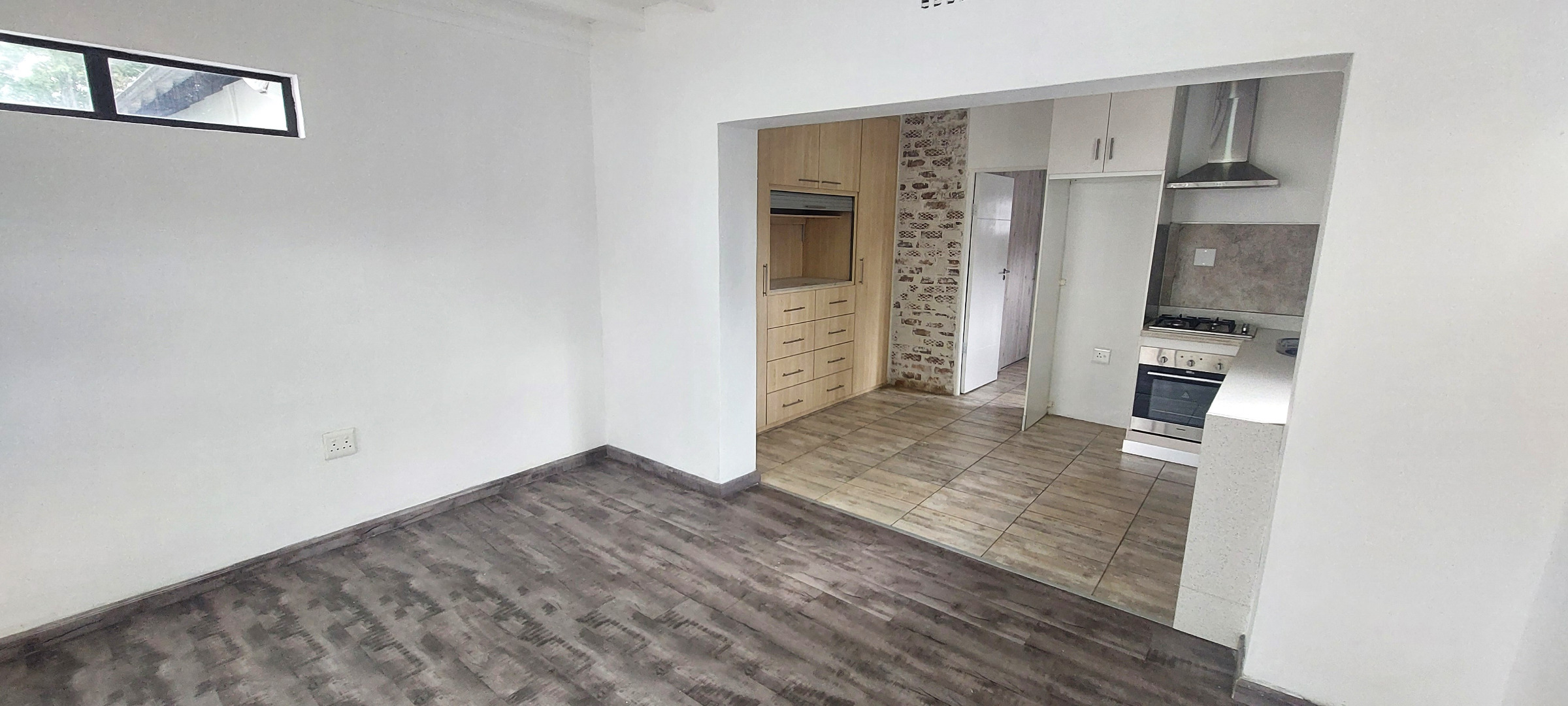 Sunny open-plan living room features contemporary dark wood-look flooring. Modern kitchen equipped with ample cupboard space, a gas hob, built-in oven, extractor fan and space for 1 water appliance and fridge. Bedroom includes wall fitted night lights and space for a double bed. Full en-suite bathroom with dark wood his and hers vanity. Outdoor tiled covered patio has drop down blinds for added privacy. Fibre-ready.