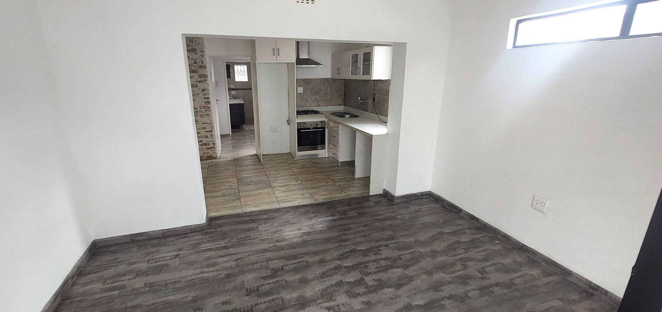Sunny open-plan living room features contemporary dark wood-look flooring. Modern kitchen equipped with ample cupboard space, a gas hob, built-in oven, extractor fan and space for 1 water appliance and fridge. Bedroom includes wall fitted night lights and space for a double bed. Full en-suite bathroom with dark wood his and hers vanity. Outdoor tiled covered patio has drop down blinds for added privacy. Fibre-ready.
