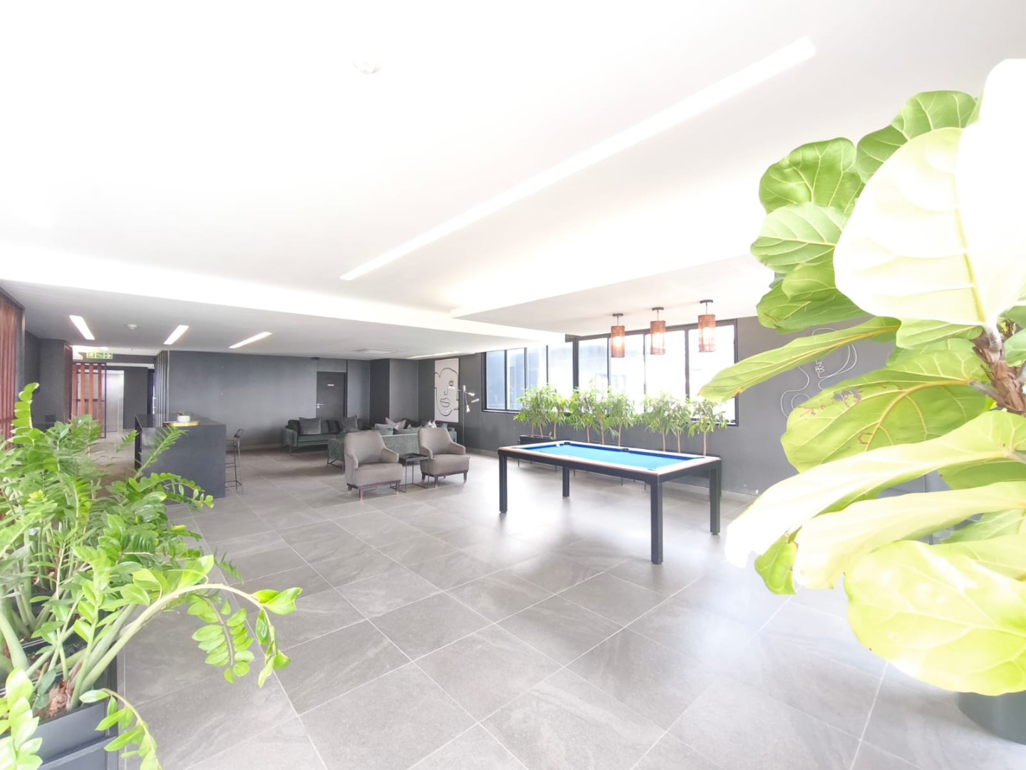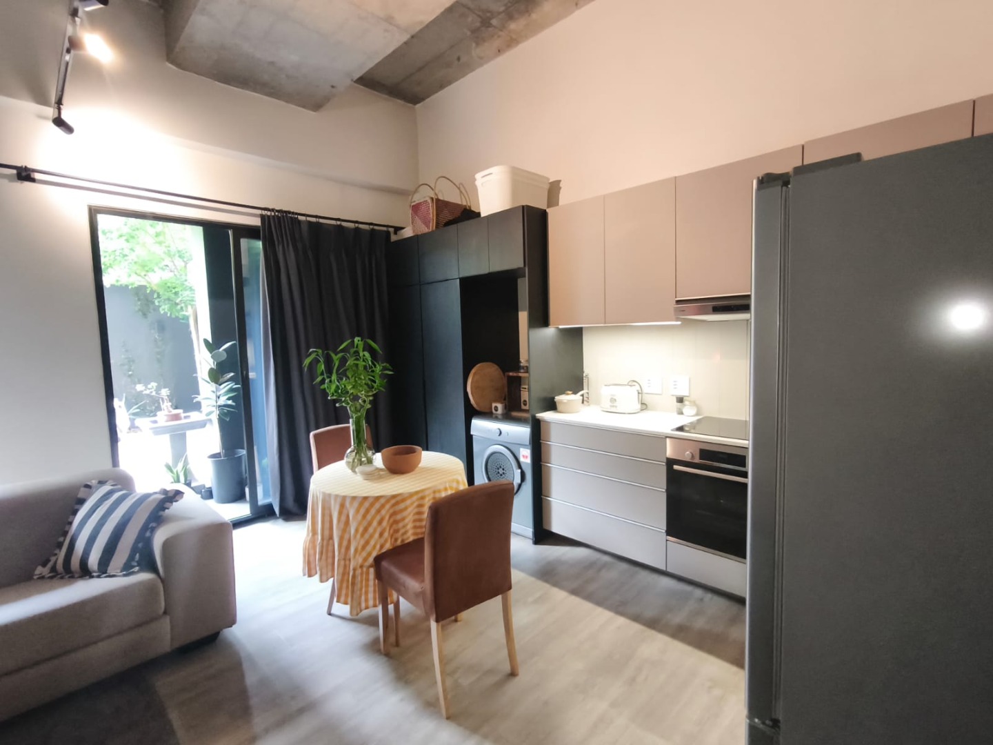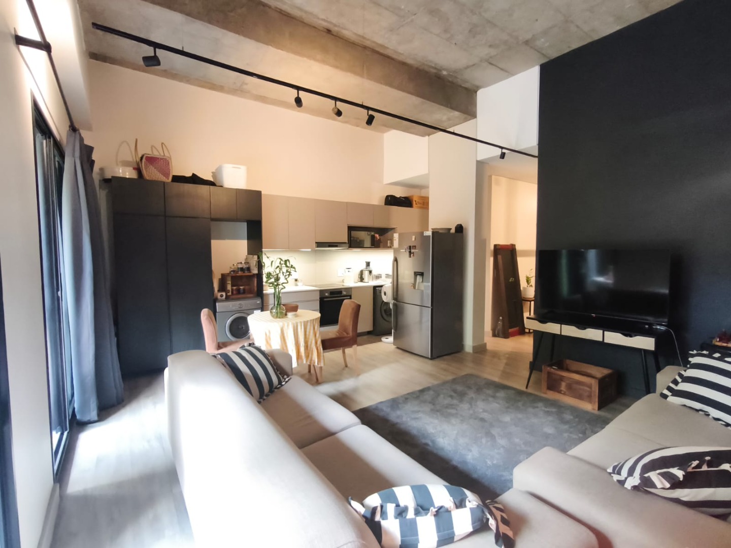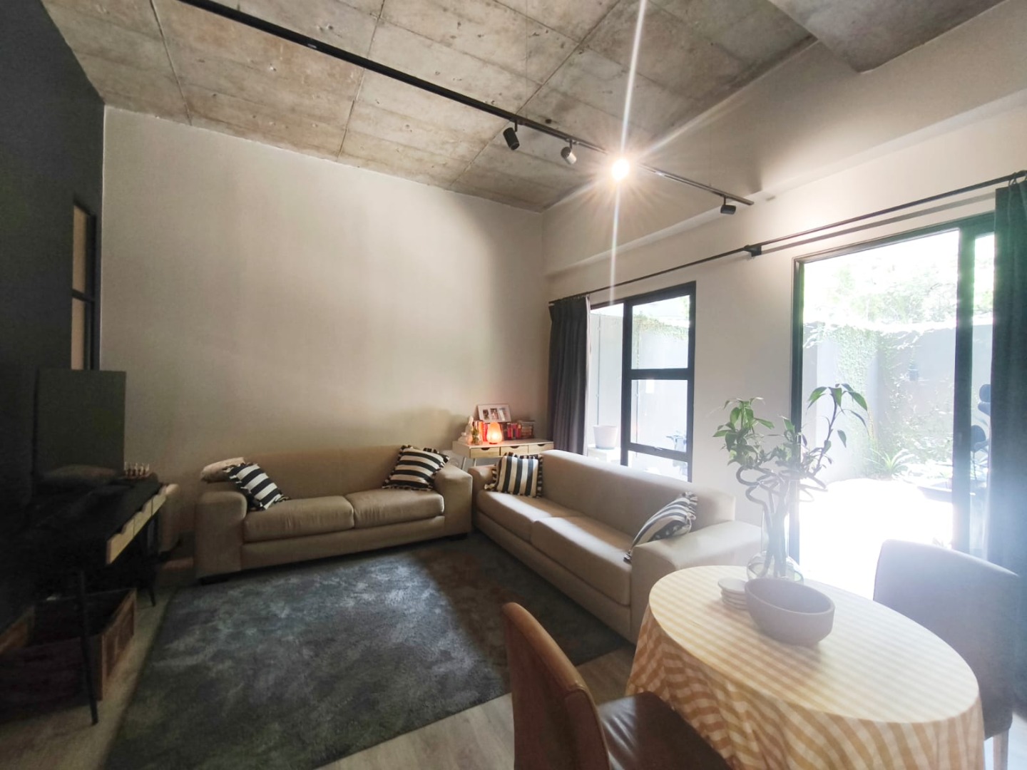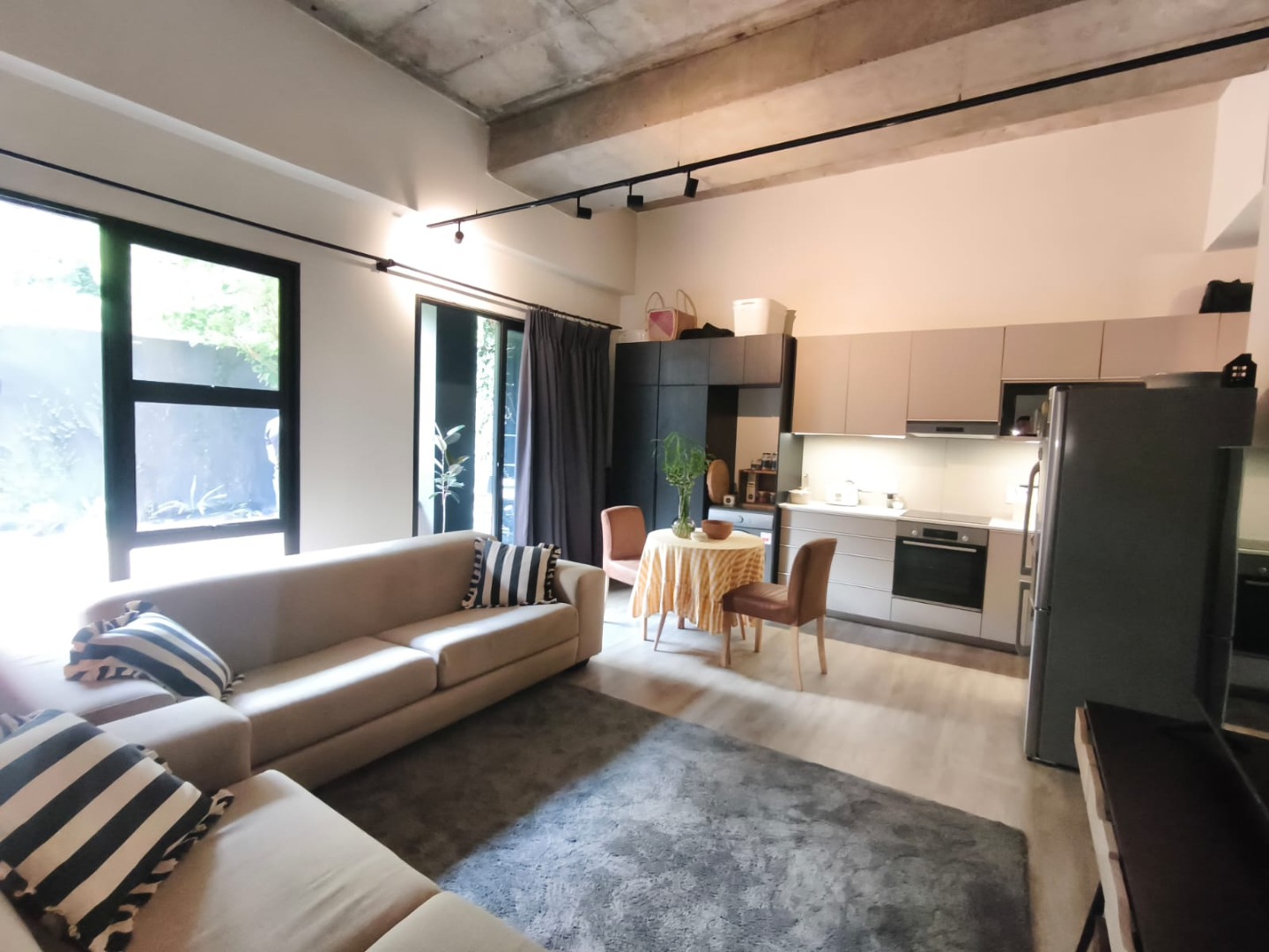 Discover contemporary urban living in this sleek 1-bedroom, 1-bathroom apartment located within a secure estate in Sandton Central. Spanning 54 square meters, this modern residence boasts an open-plan layout, seamlessly integrating the living, dining, and kitchen areas. The industrial-chic aesthetic is highlighted by exposed concrete ceilings, stylish track lighting, and large sliding glass doors that invite ample natural light and offer access to a private outdoor patio or garden space, perfect for relaxation.