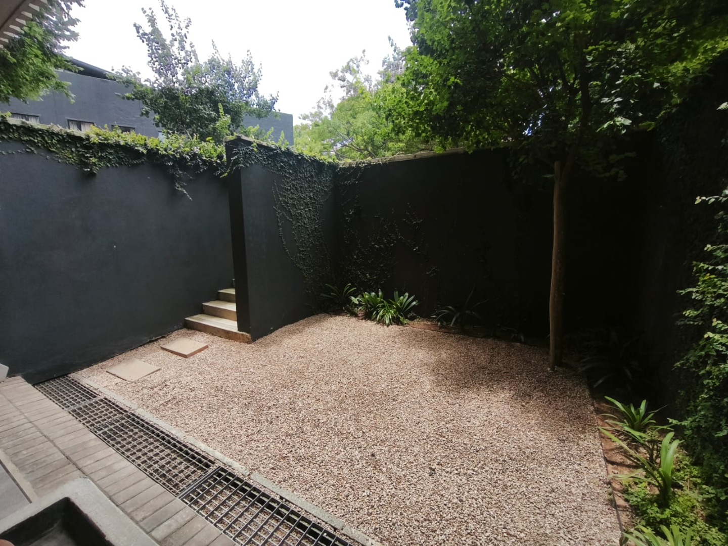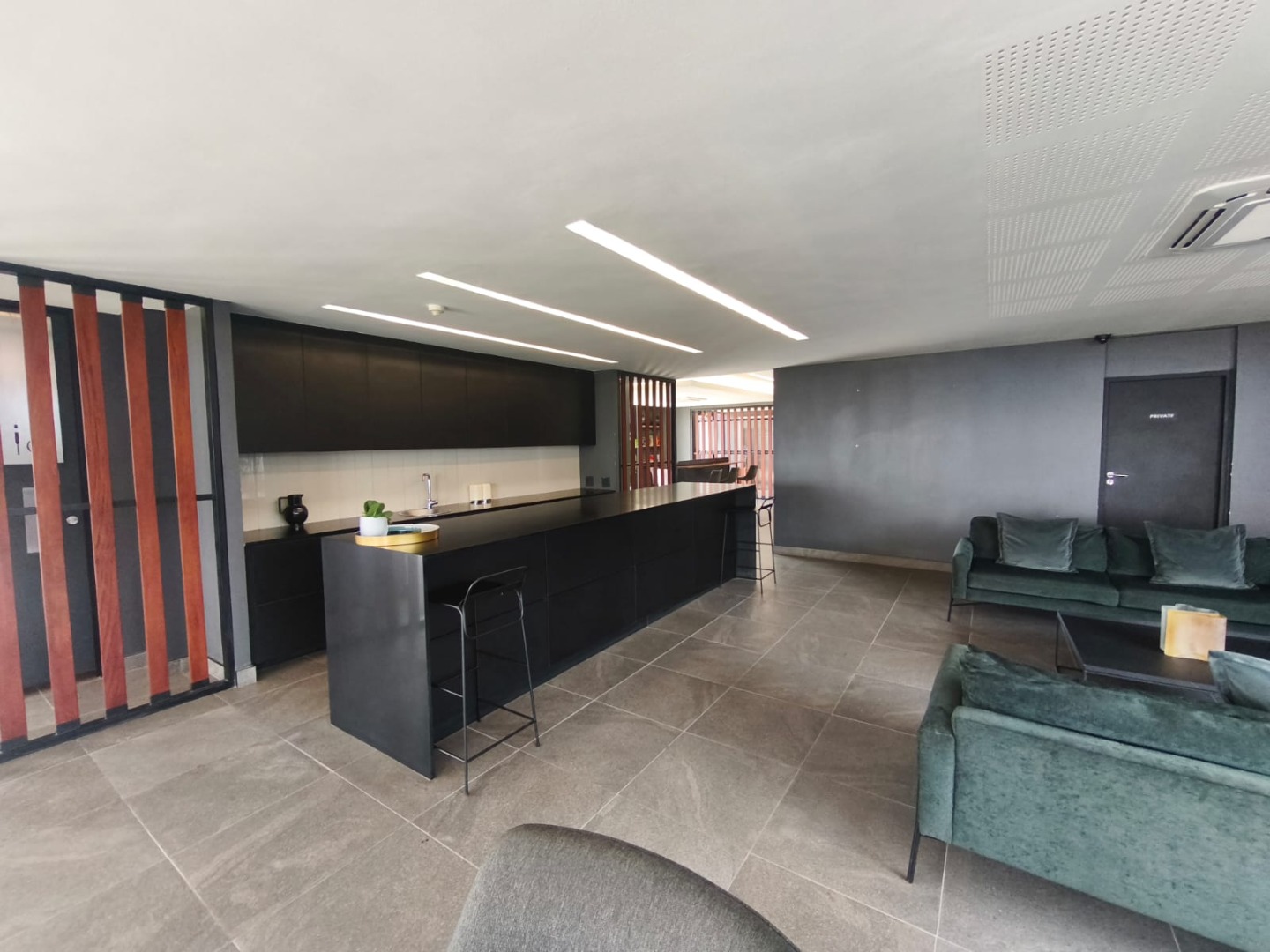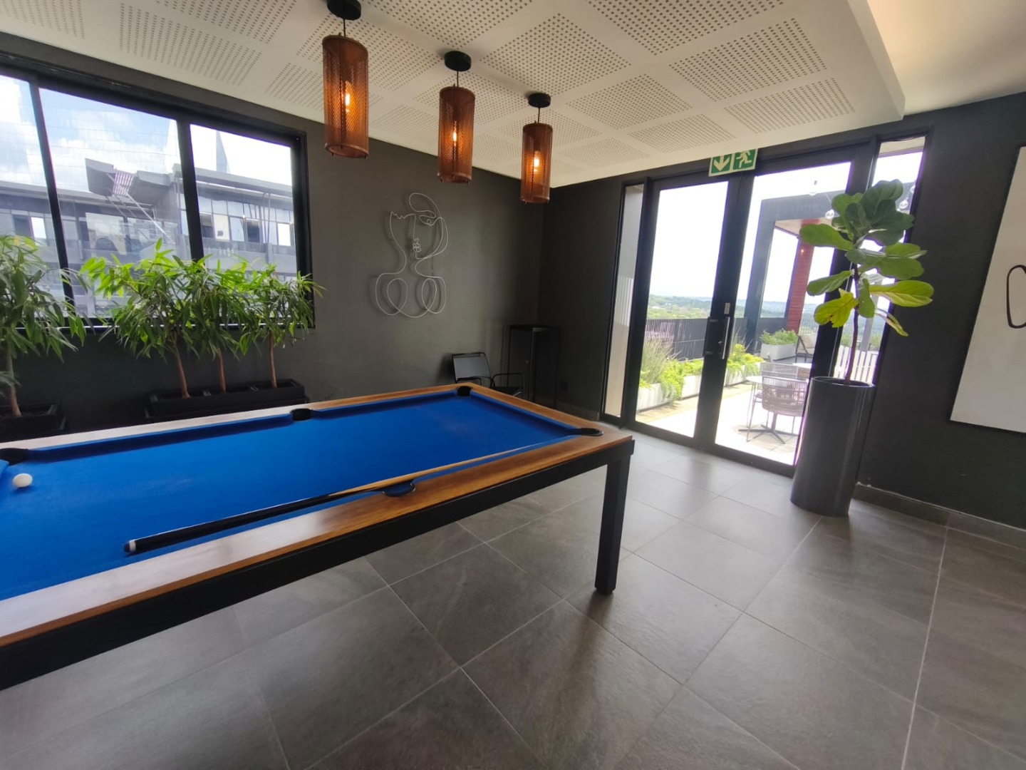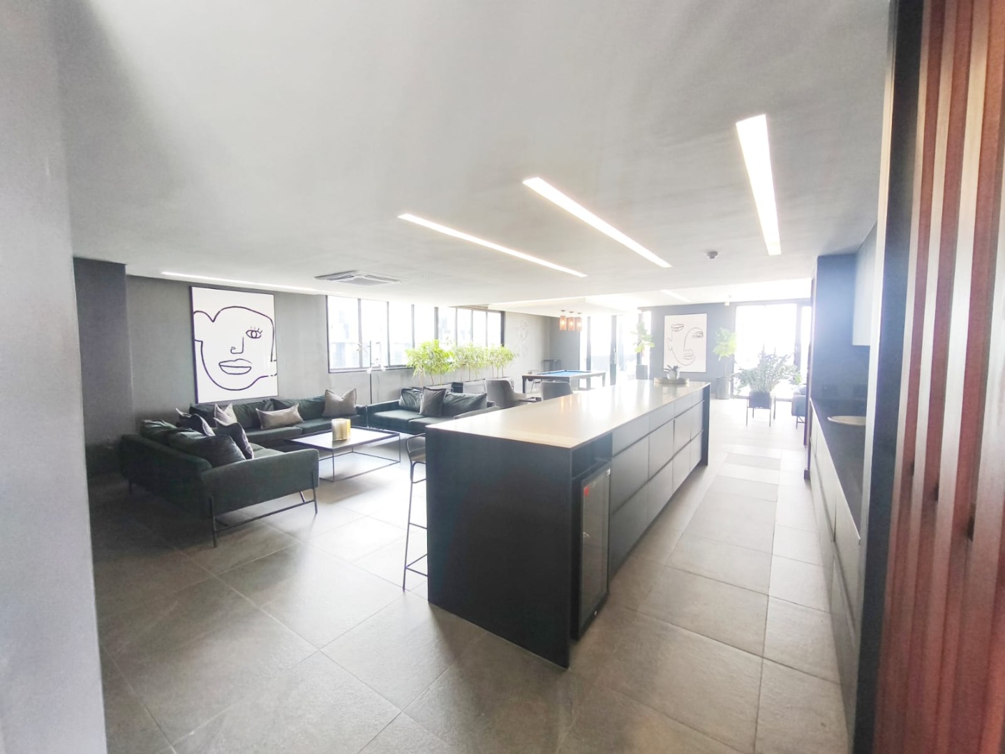 Discover contemporary urban living in this sleek 1-bedroom, 1-bathroom apartment located within a secure estate in Sandton Central. Spanning 54 square meters, this modern residence boasts an open-plan layout, seamlessly integrating the living, dining, and kitchen areas. The industrial-chic aesthetic is highlighted by exposed concrete ceilings, stylish track lighting, and large sliding glass doors that invite ample natural light and offer access to a private outdoor patio or garden space, perfect for relaxation.