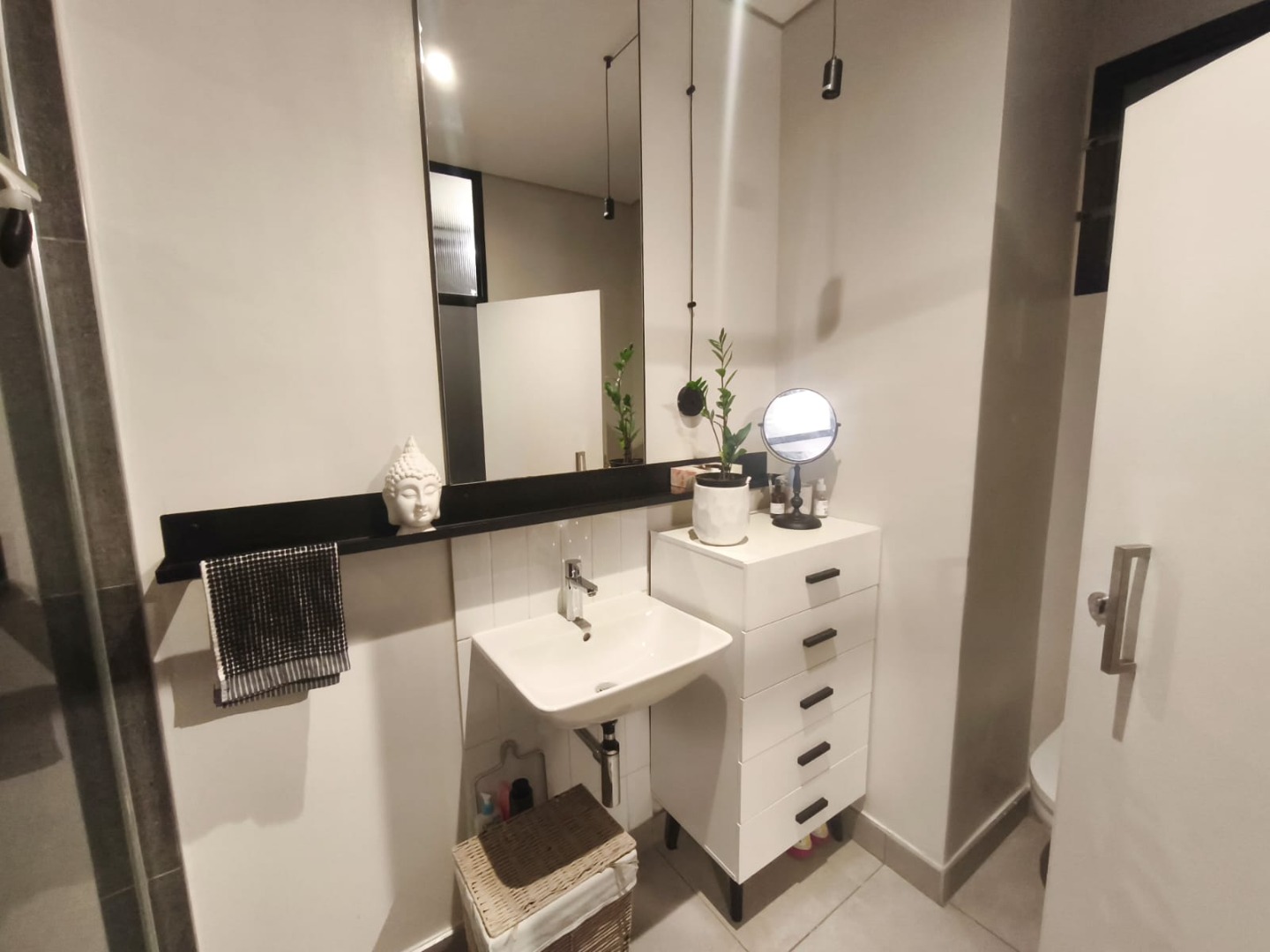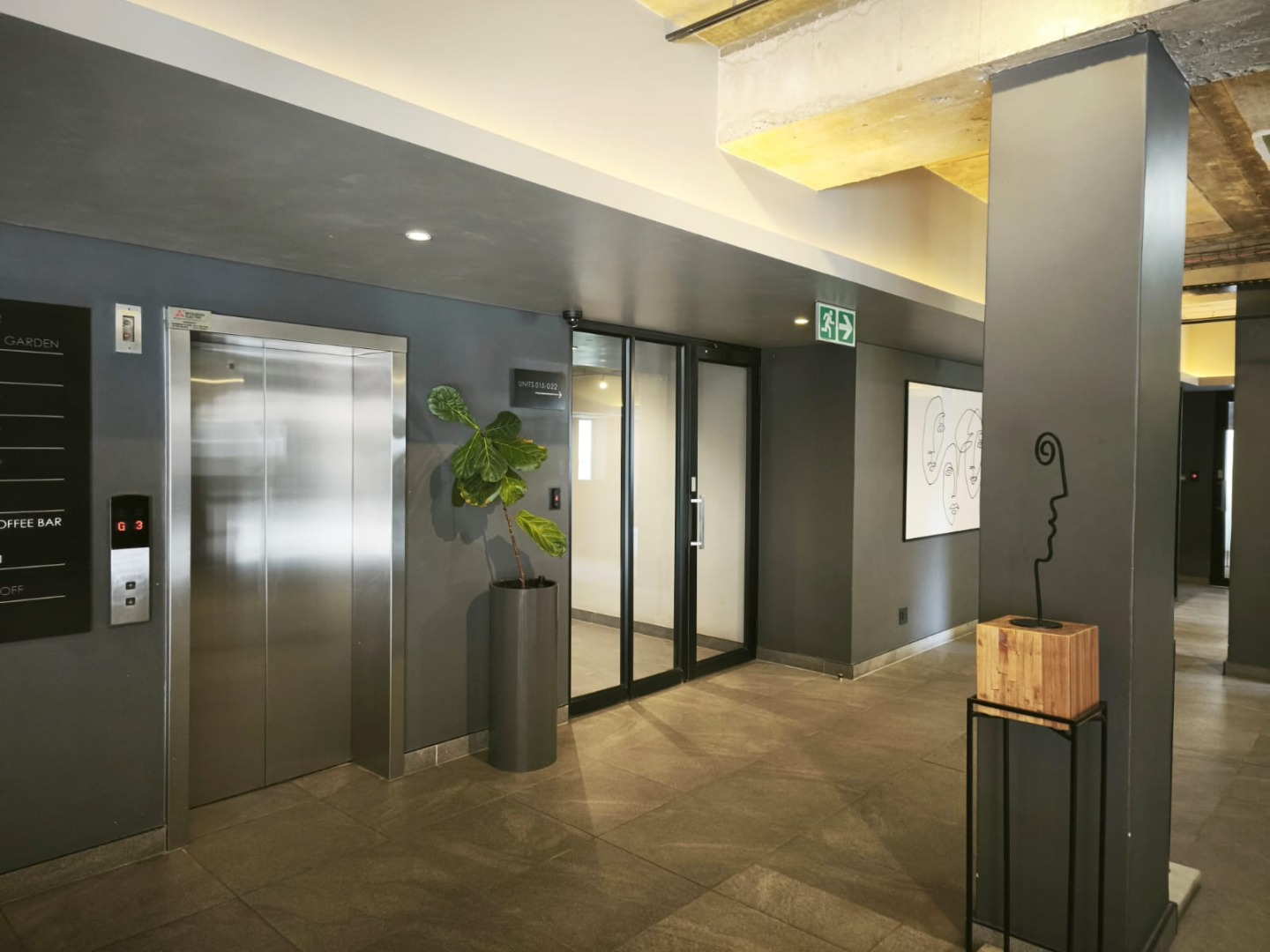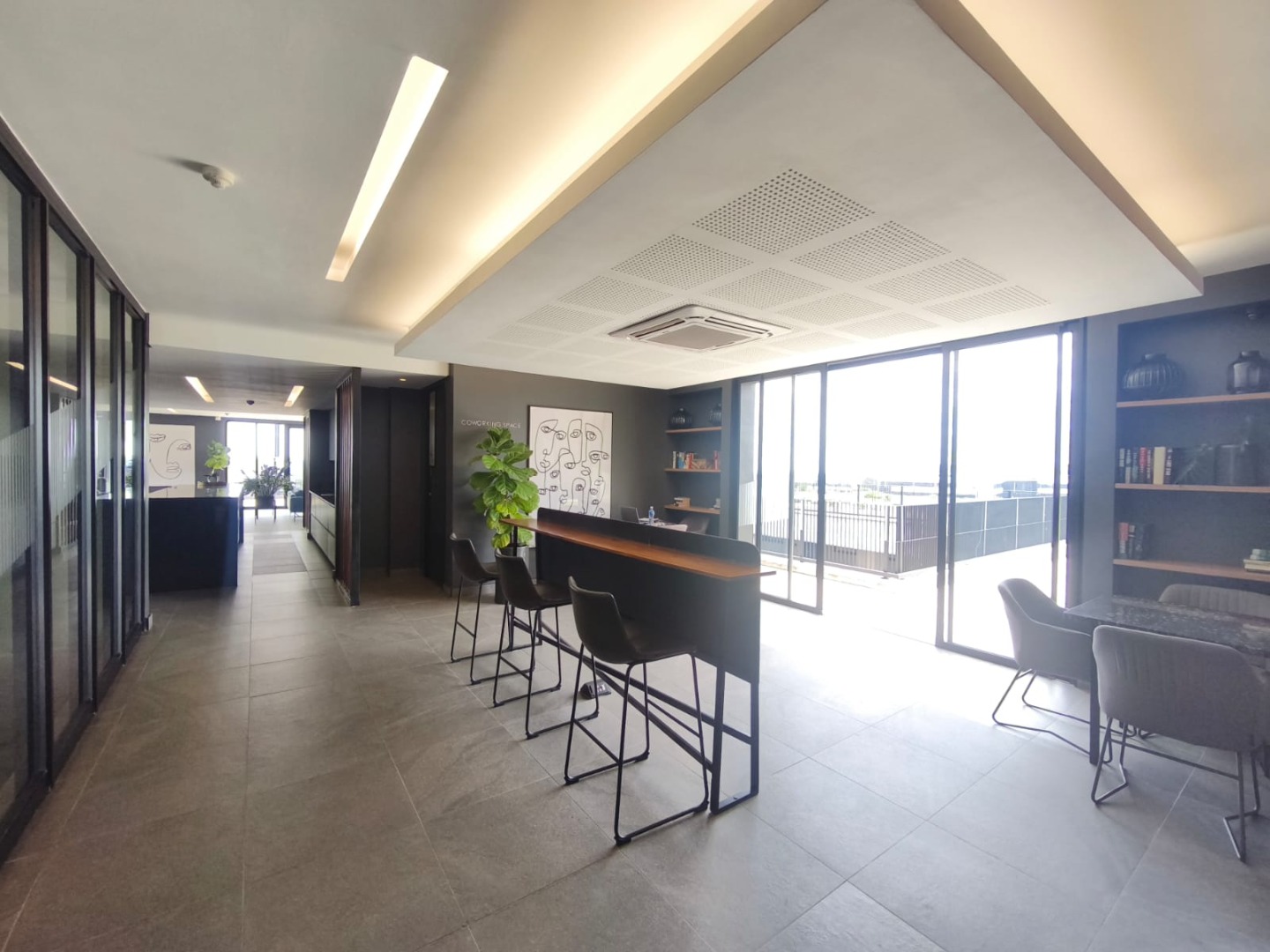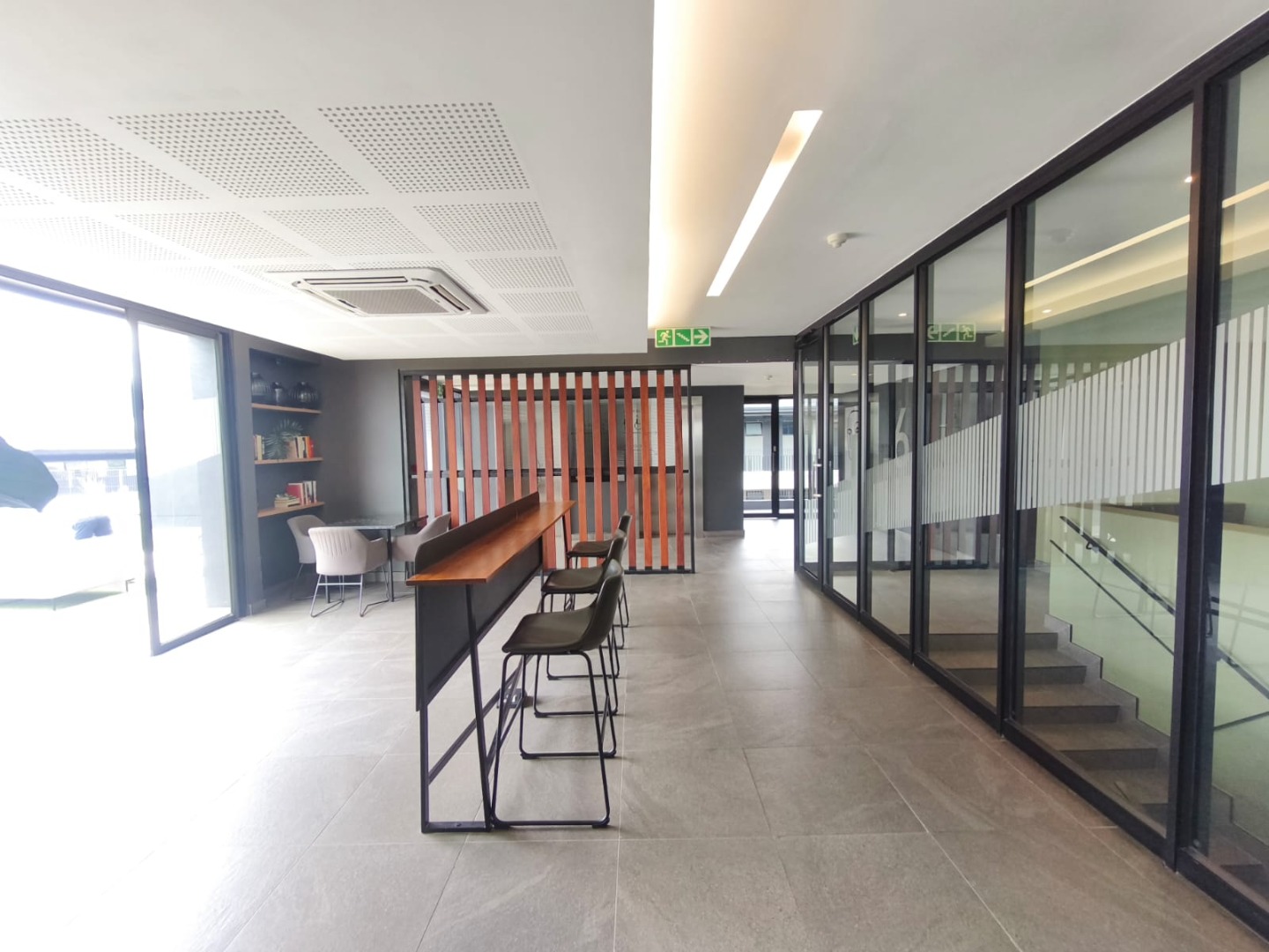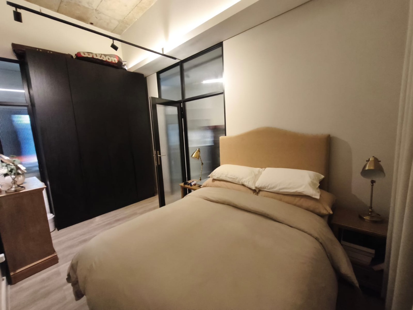 Discover contemporary urban living in this sleek 1-bedroom, 1-bathroom apartment located within a secure estate in Sandton Central. Spanning 54 square meters, this modern residence boasts an open-plan layout, seamlessly integrating the living, dining, and kitchen areas. The industrial-chic aesthetic is highlighted by exposed concrete ceilings, stylish track lighting, and large sliding glass doors that invite ample natural light and offer access to a private outdoor patio or garden space, perfect for relaxation.
