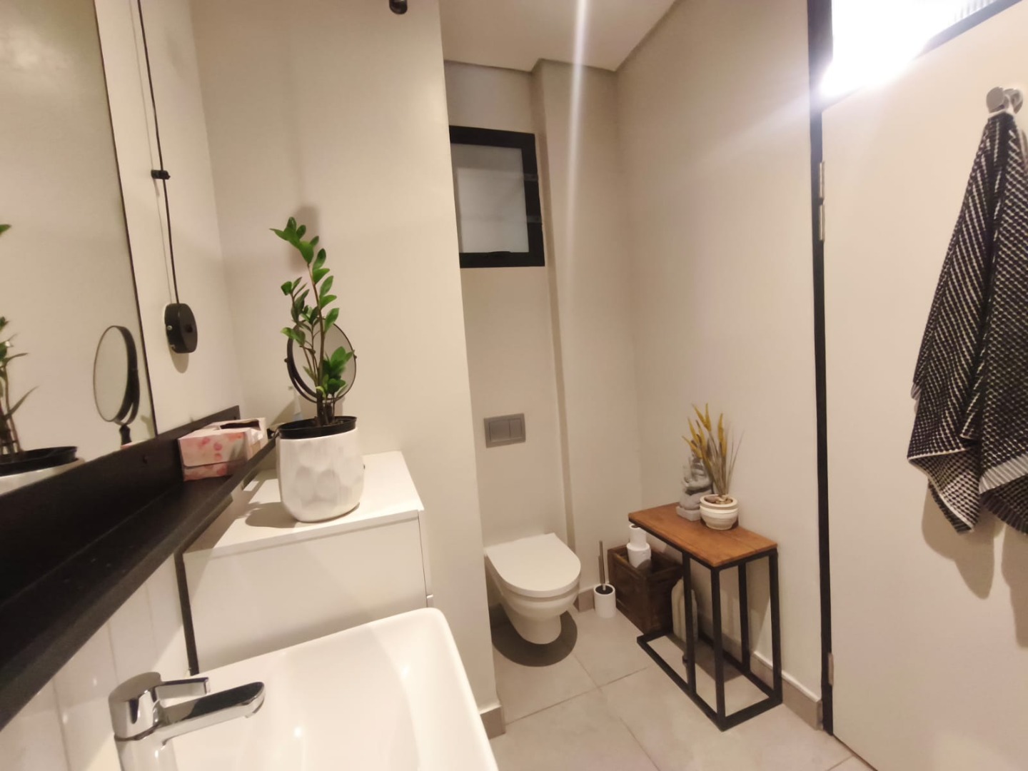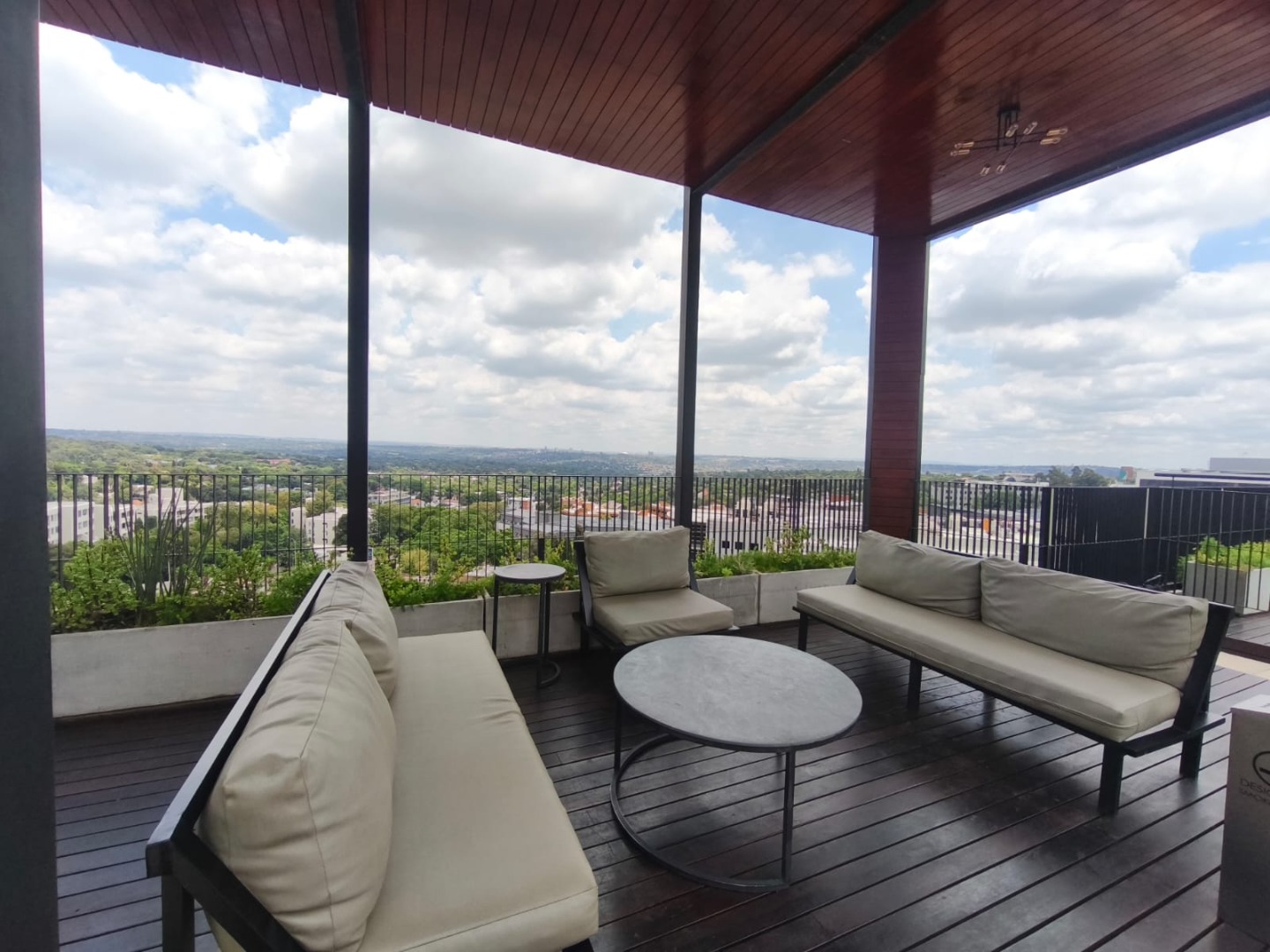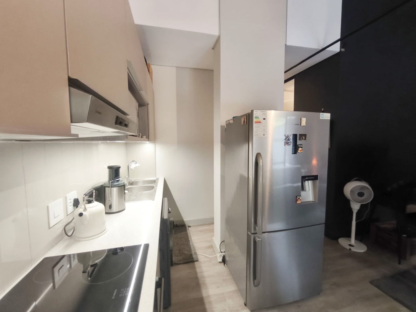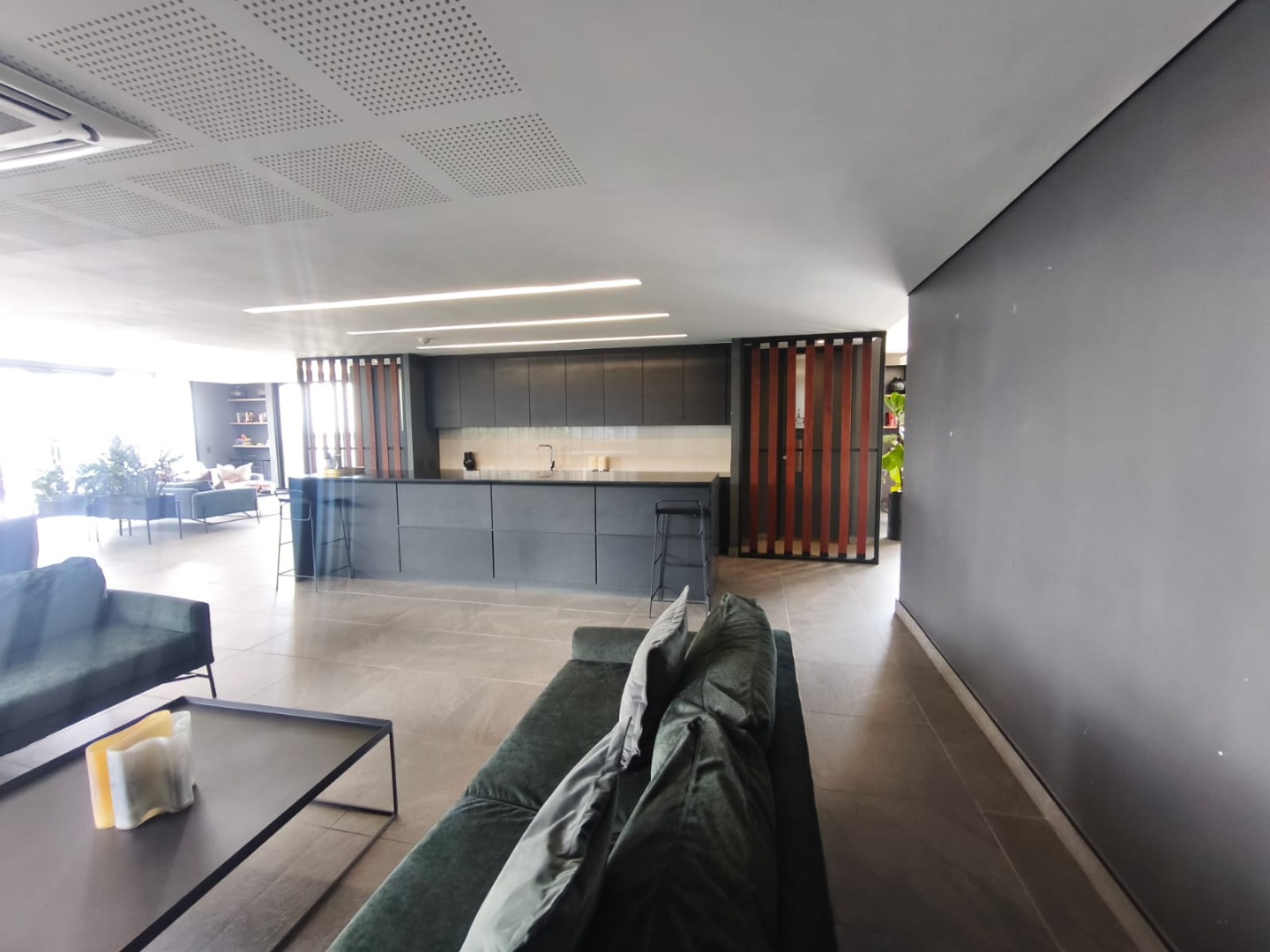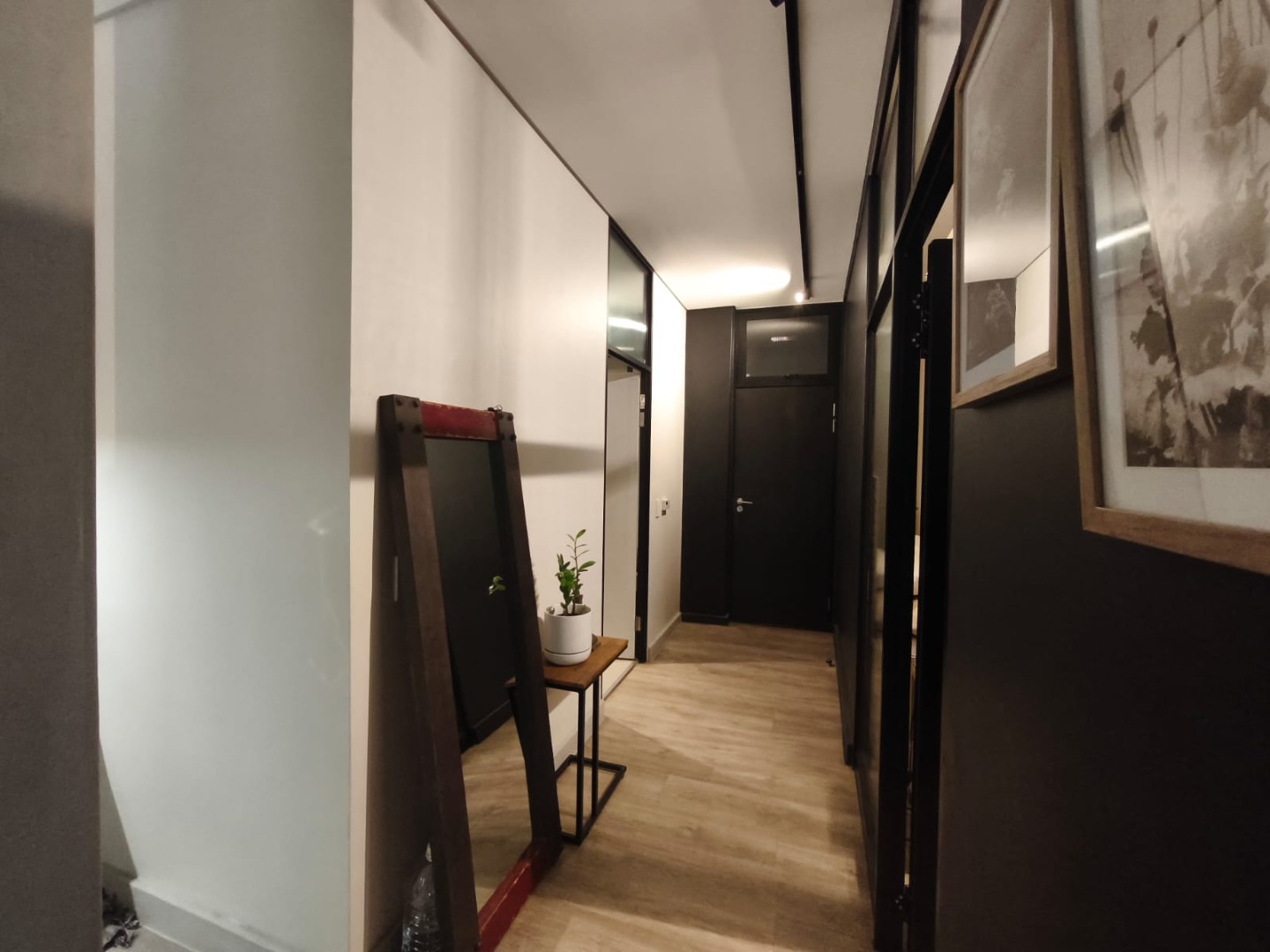 Discover contemporary urban living in this sleek 1-bedroom, 1-bathroom apartment located within a secure estate in Sandton Central. Spanning 54 square meters, this modern residence boasts an open-plan layout, seamlessly integrating the living, dining, and kitchen areas. The industrial-chic aesthetic is highlighted by exposed concrete ceilings, stylish track lighting, and large sliding glass doors that invite ample natural light and offer access to a private outdoor patio or garden space, perfect for relaxation.