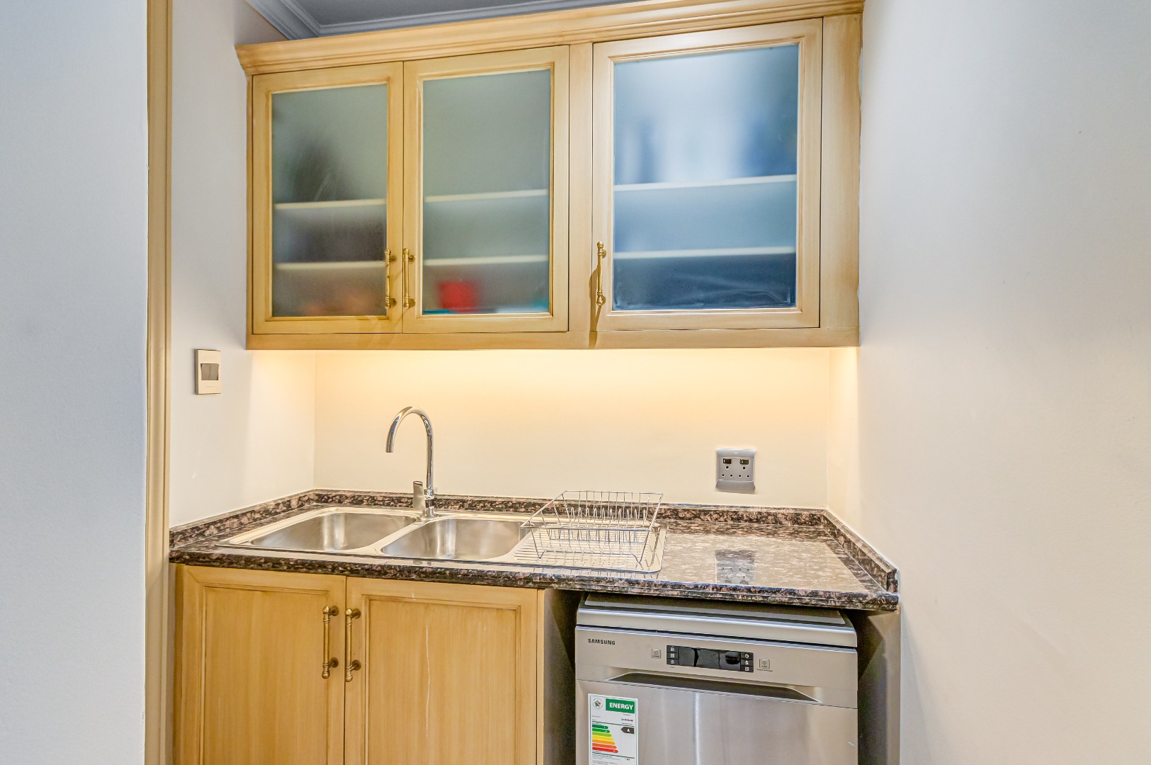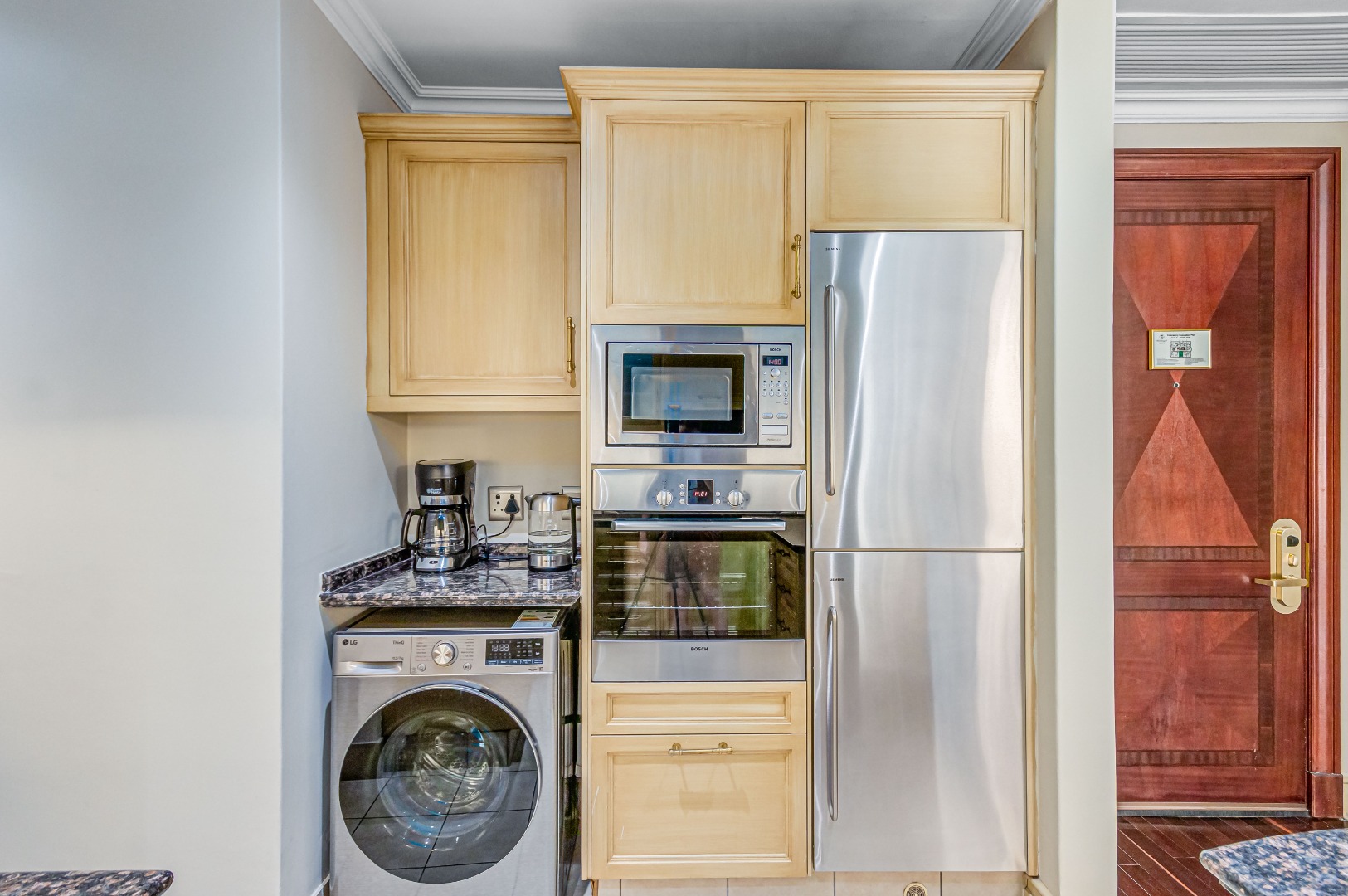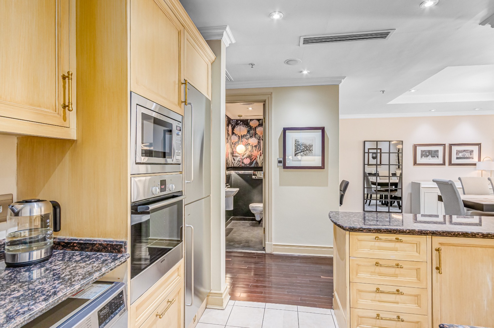 A full, integrated water purification system has been installed throughout the entire apartment, powered by a sophisticated, ceiling-integrated system. Every drop of water, from your shower to your taps, is filtered and refined. Reverse osmosis taps in the kitchen and at each basin mean you’re not just living well, you’re living smart.